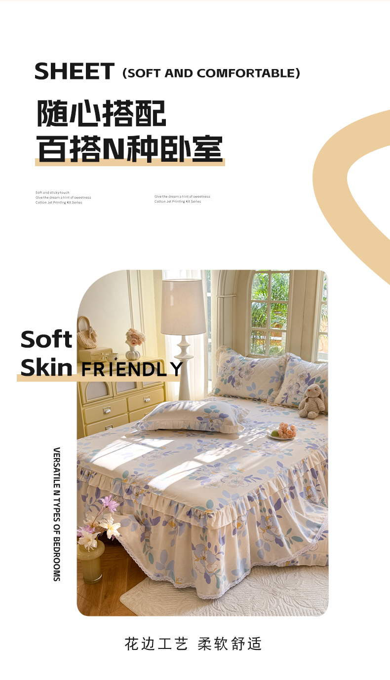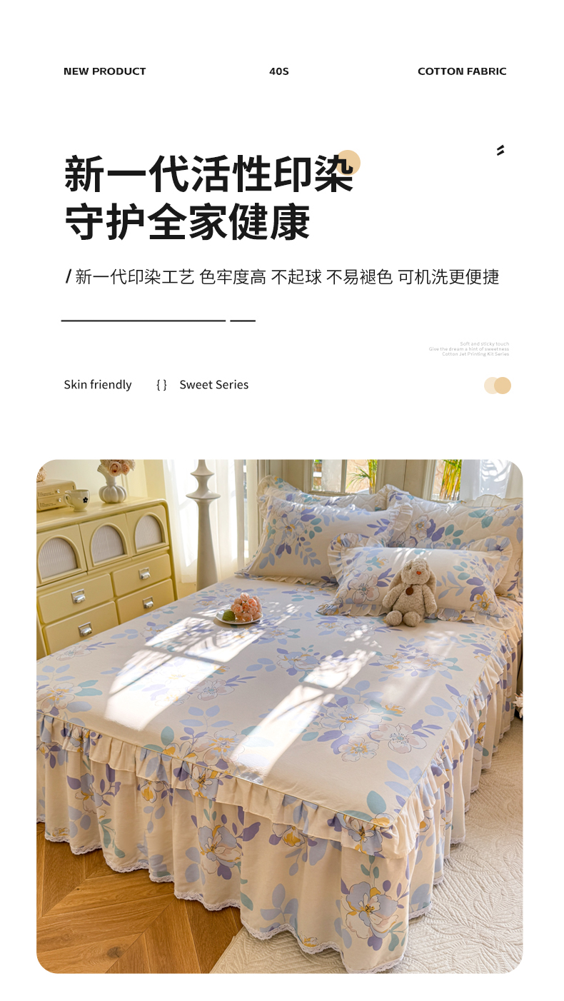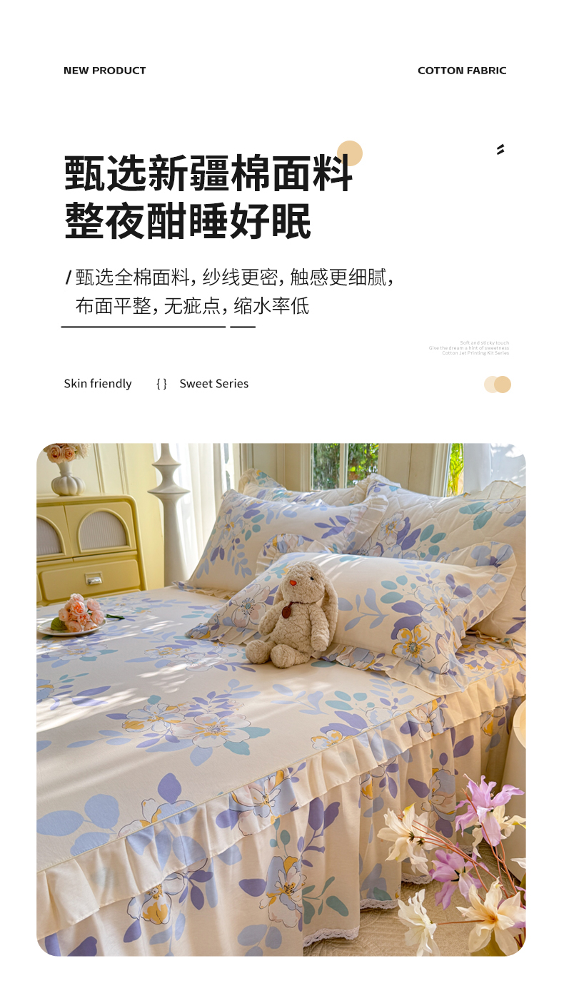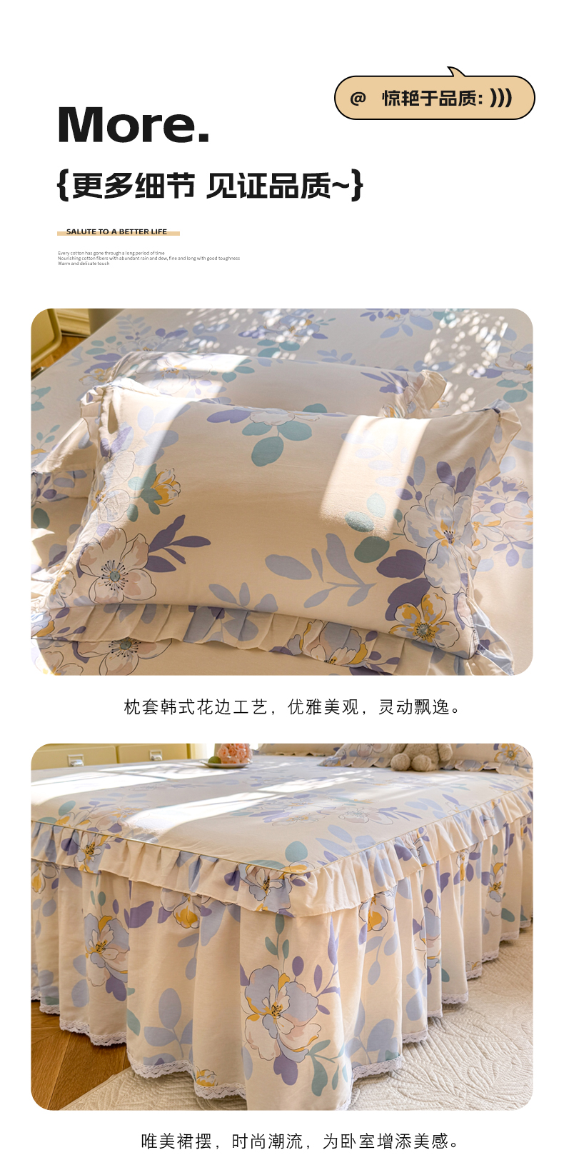 (总)美达家纺 2025新款全棉纯棉AB版蕾丝小花边单层床裙四件套,解语花,南湘,沁雨花叶,悦棠