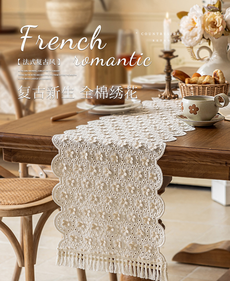 商品名称:(总)南通大梧纺织 2025新款全棉纯棉绣花法式复古全棉朵朵桌旗