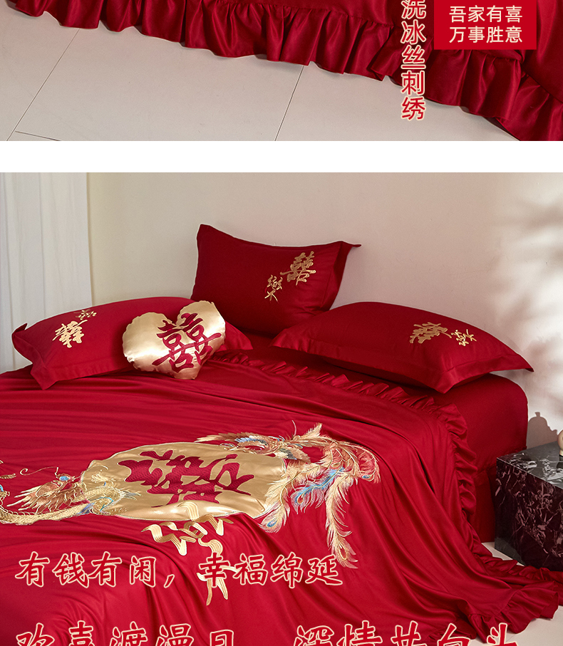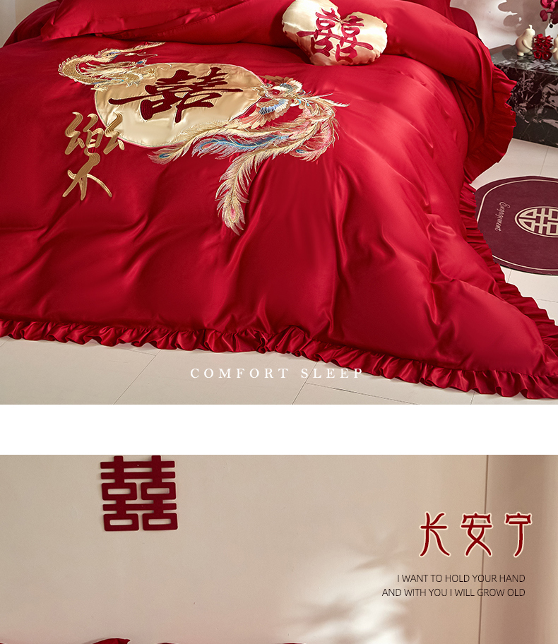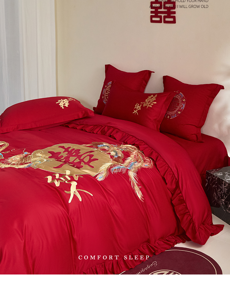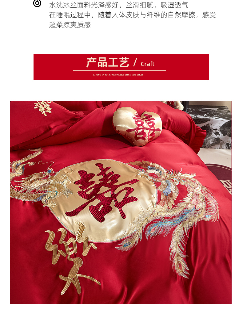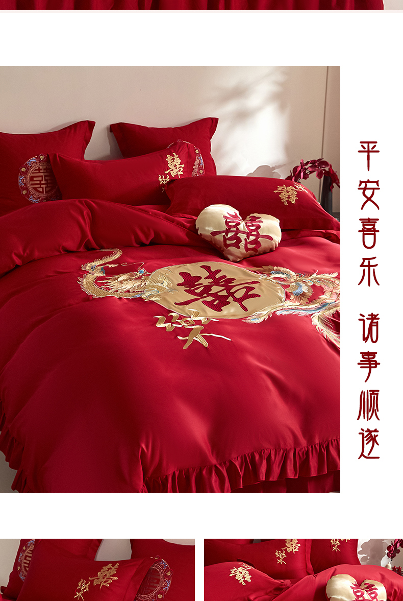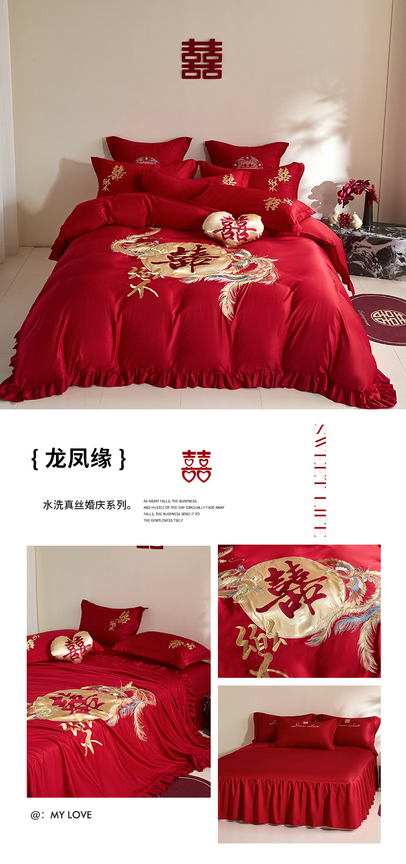 当前位置: 91家纺网 > 商品网购 > 床品套件 > 四件套 > 婚庆四件套 > 玉雅家纺 2025新款水洗冰丝刺绣床裙款婚庆四件套 床裙款-龙凤缘