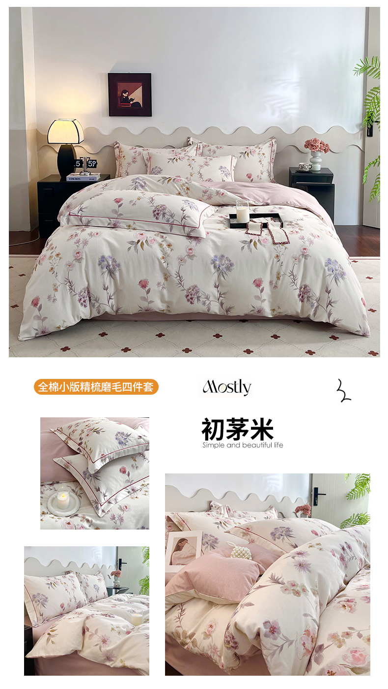 商品名称:启航家居 2025全棉小版印花精梳磨毛四件套 茉娜