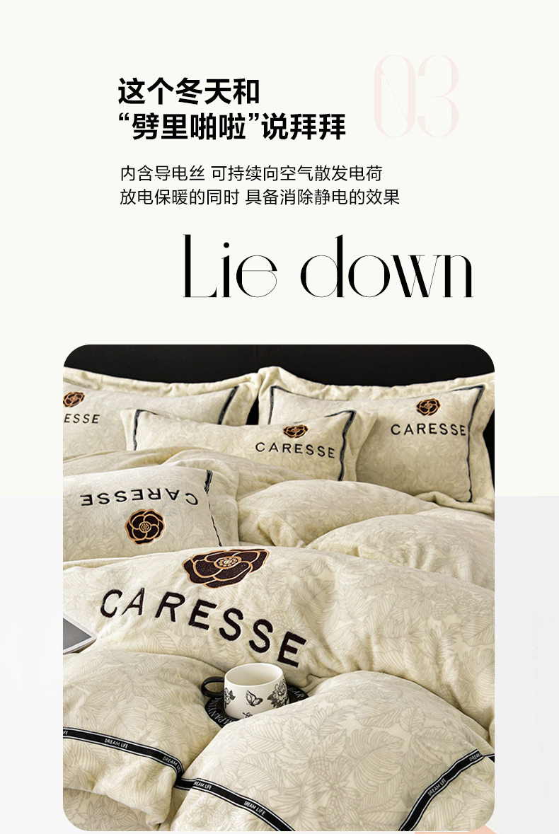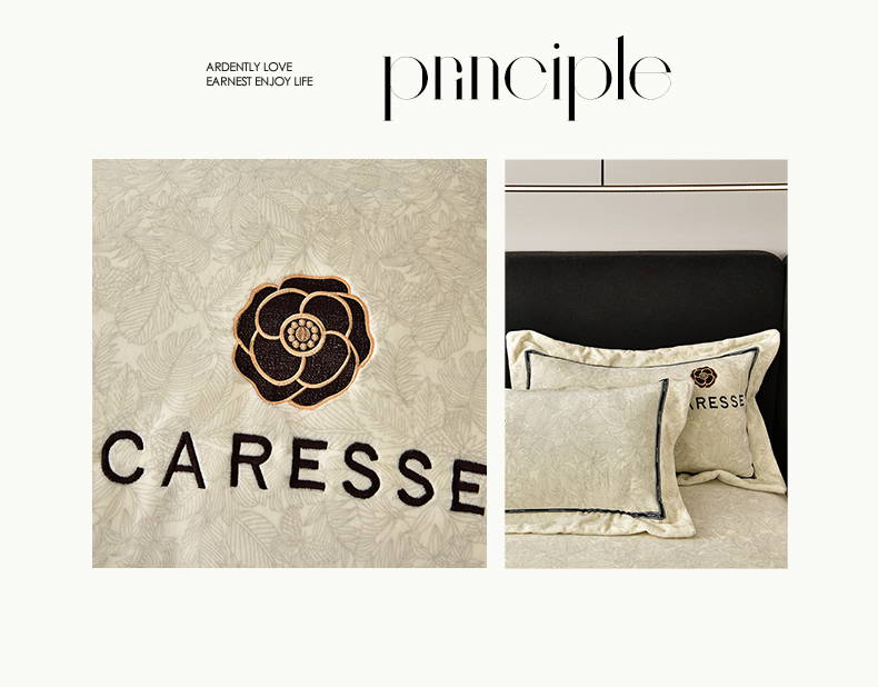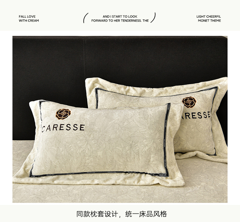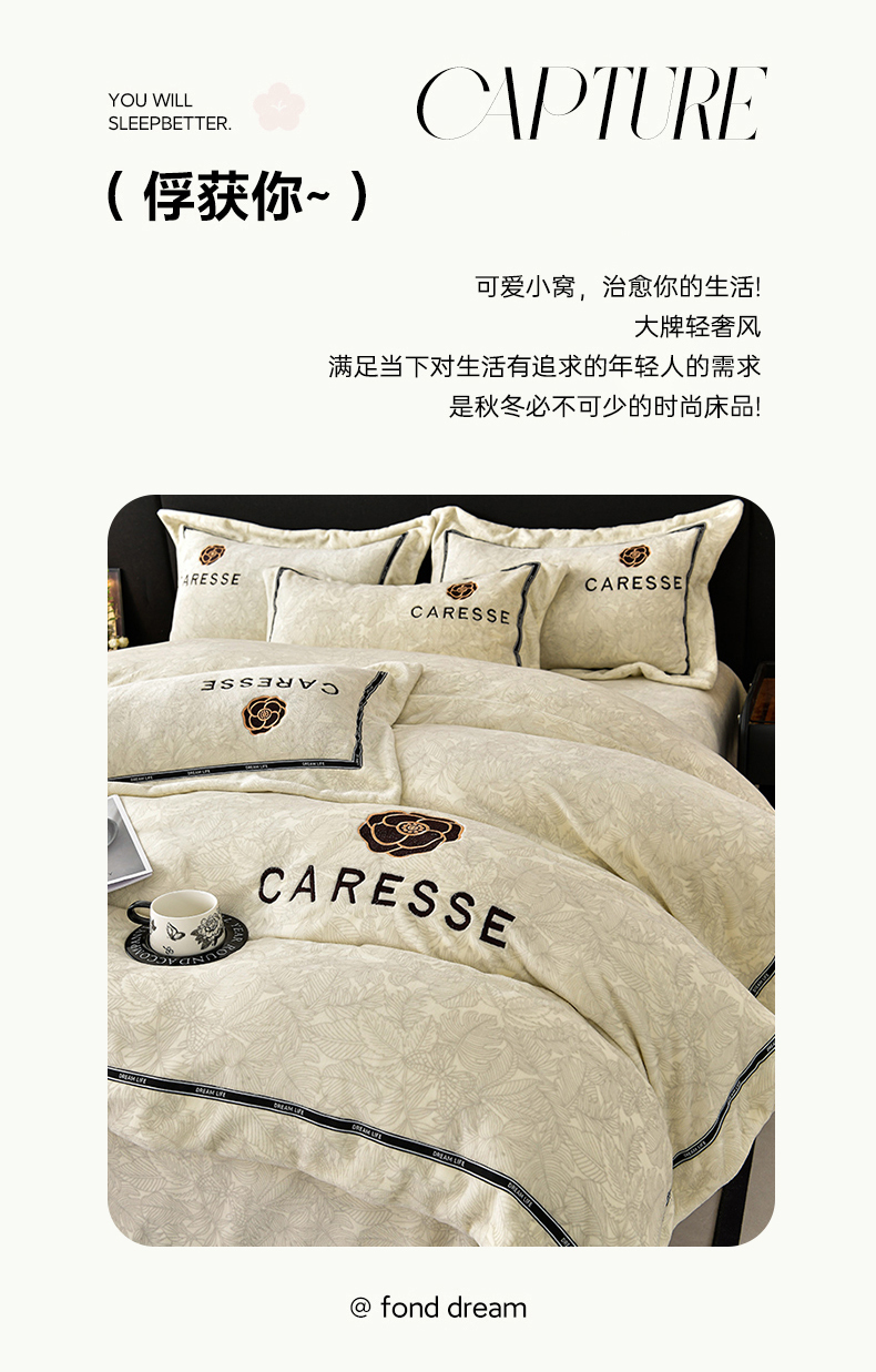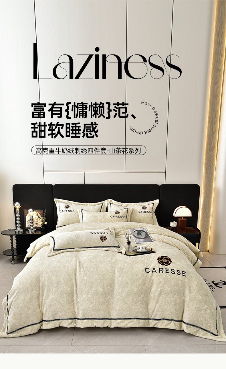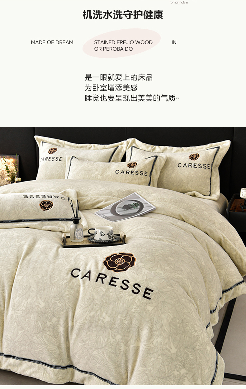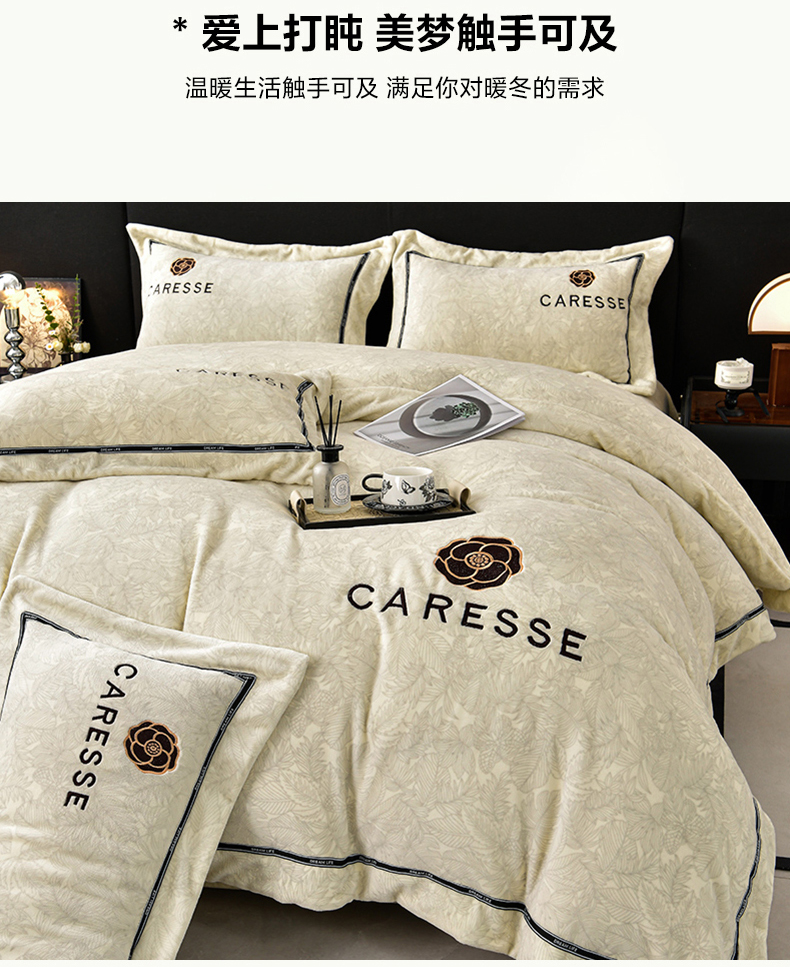 商品名称:妮恒美家纺 2025新款高克重牛奶绒刺绣四件套-山茶花-白奶咖