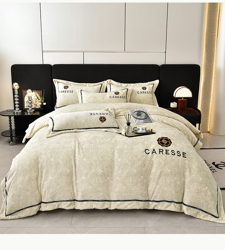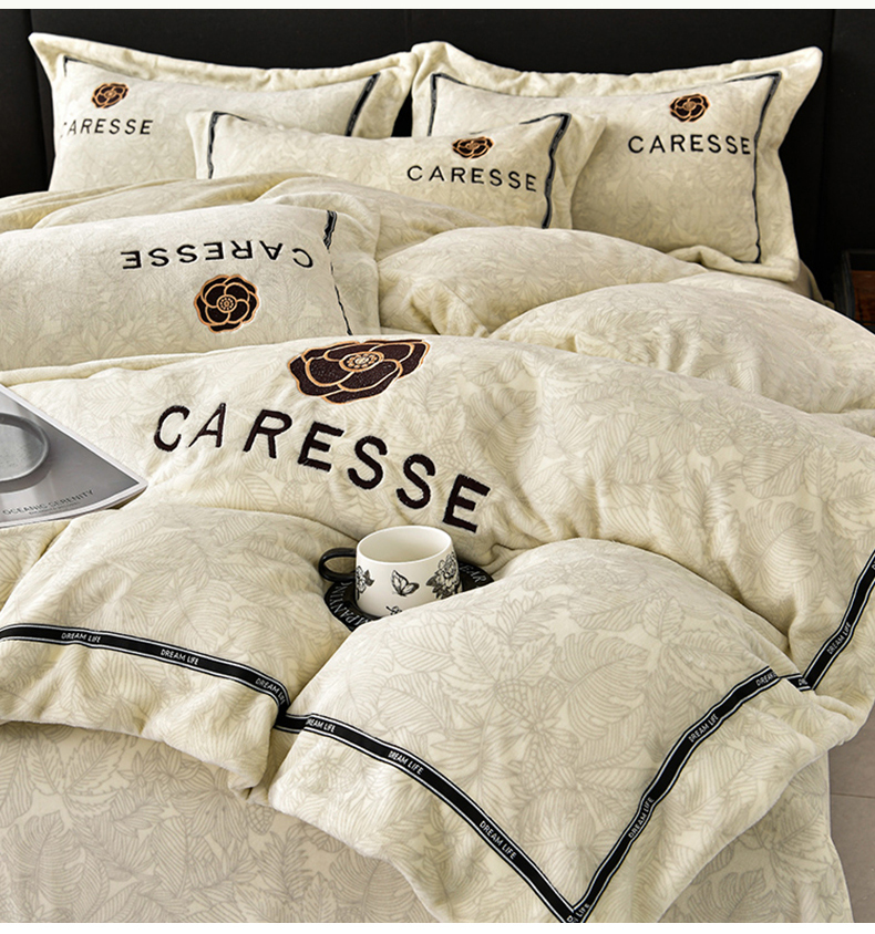 妮恒美家纺 2025新款高克重牛奶绒刺绣四件套-山茶花-白奶咖