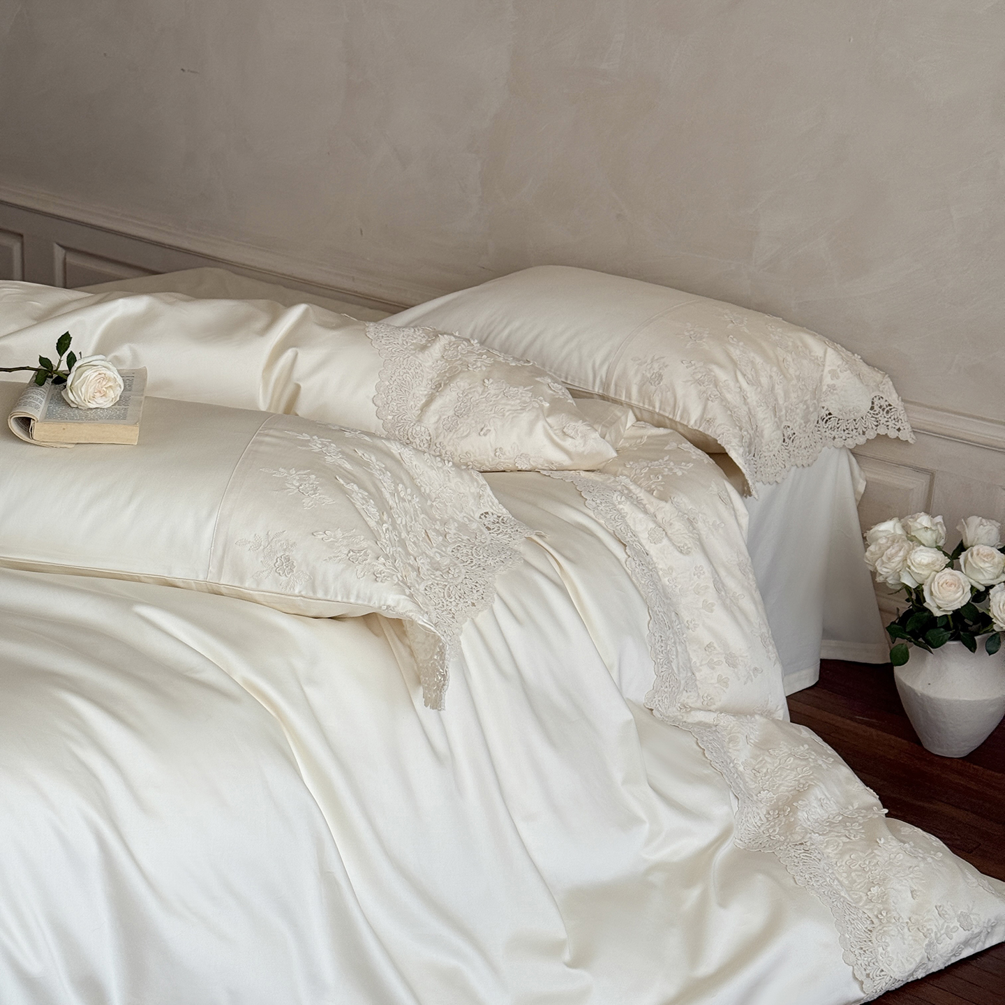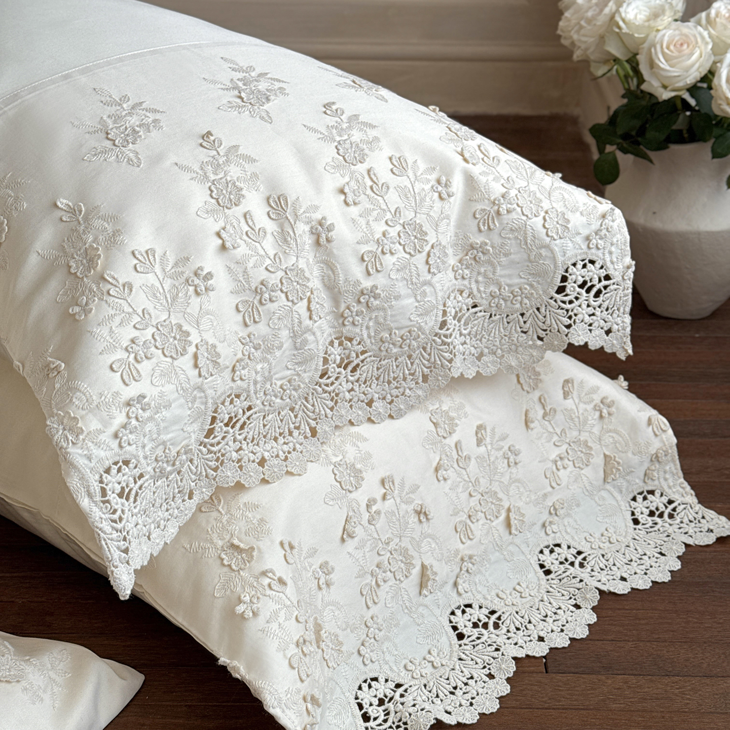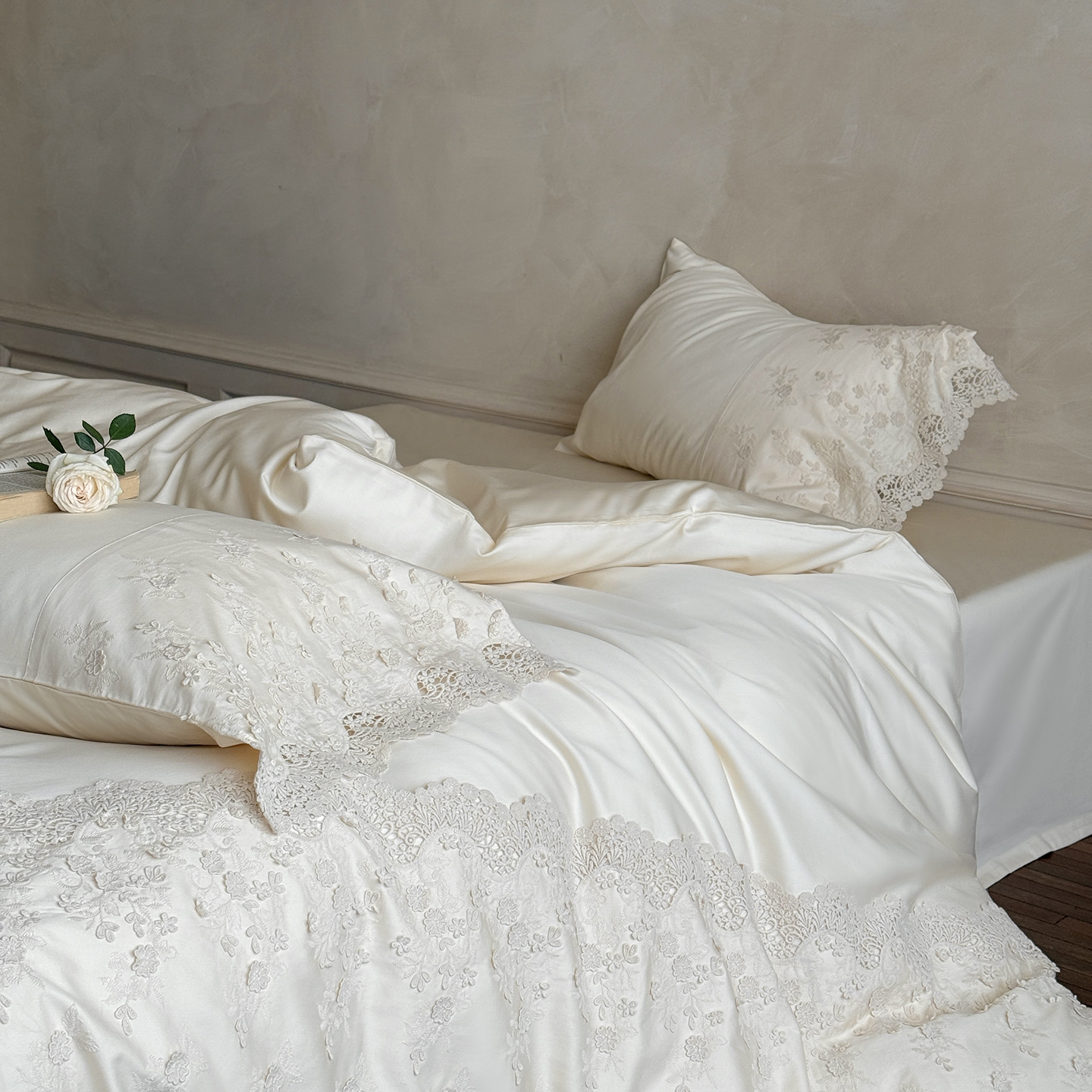 (总)佳汐蓝 2025春夏新品双层皱皱纱刺绣+织带+荷叶边四件套--白茶花,奶白,曲奇