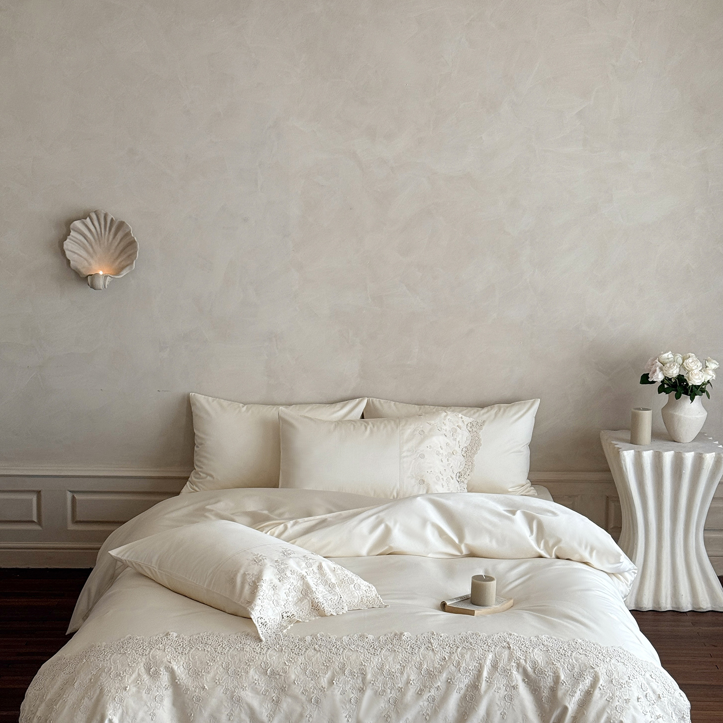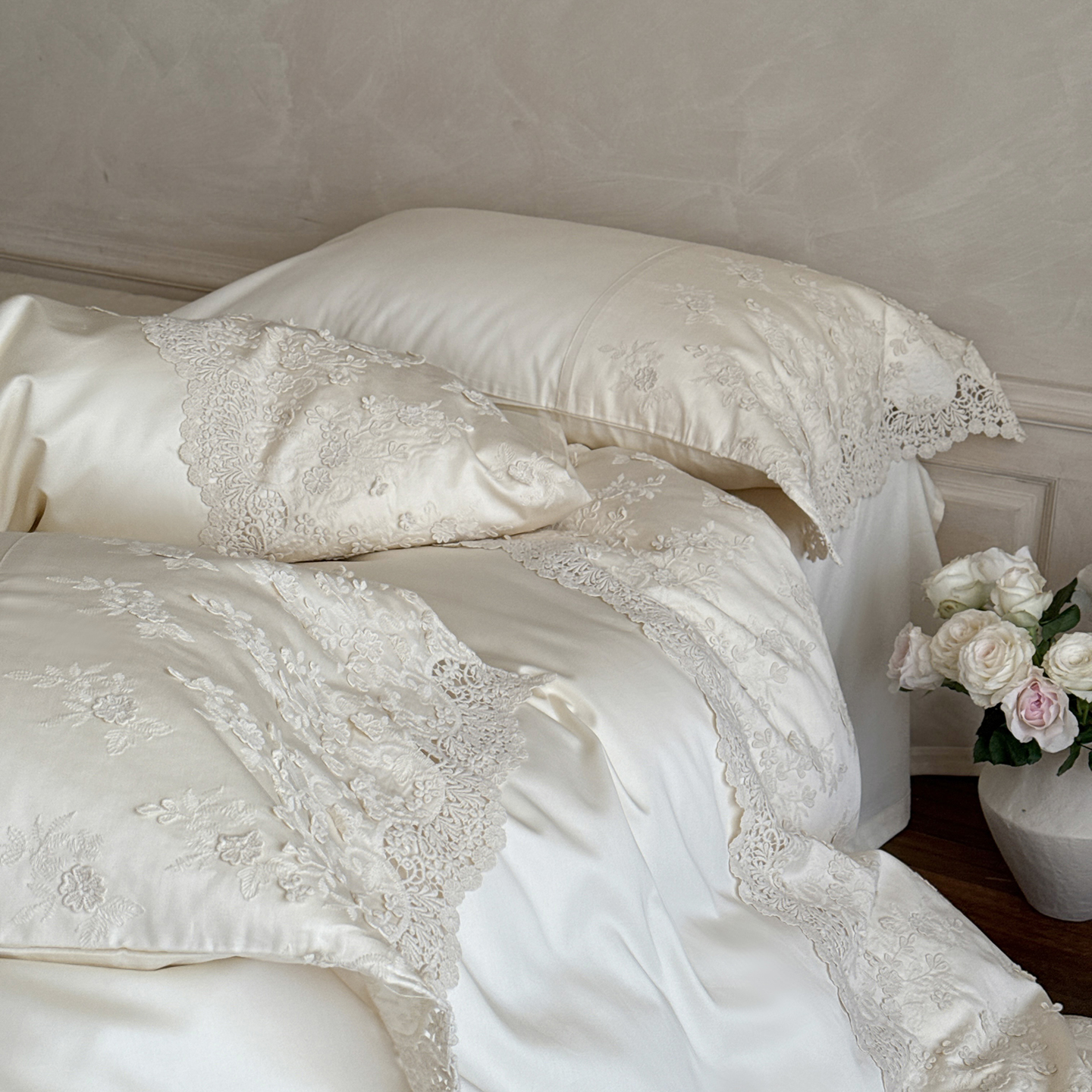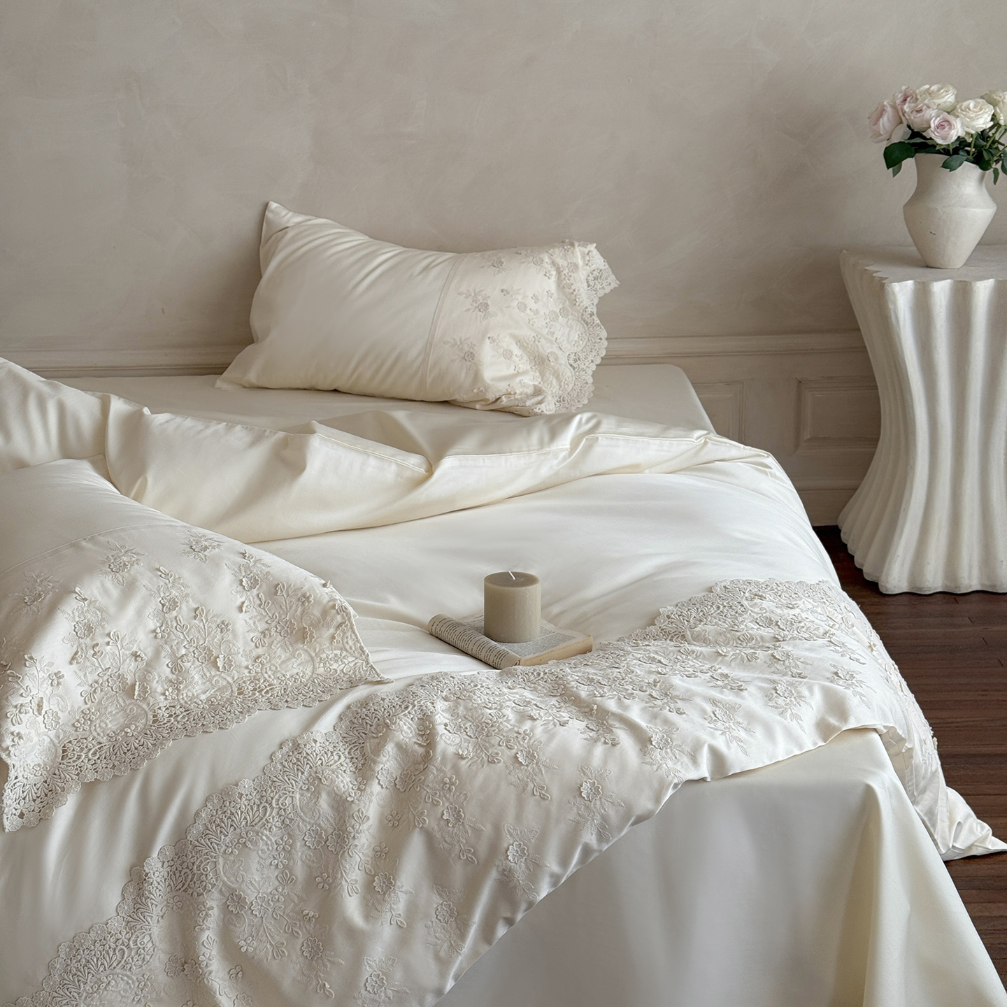 (总)佳汐蓝 2025春夏新品双层皱皱纱刺绣+织带+荷叶边四件套--白茶花,奶白,曲奇