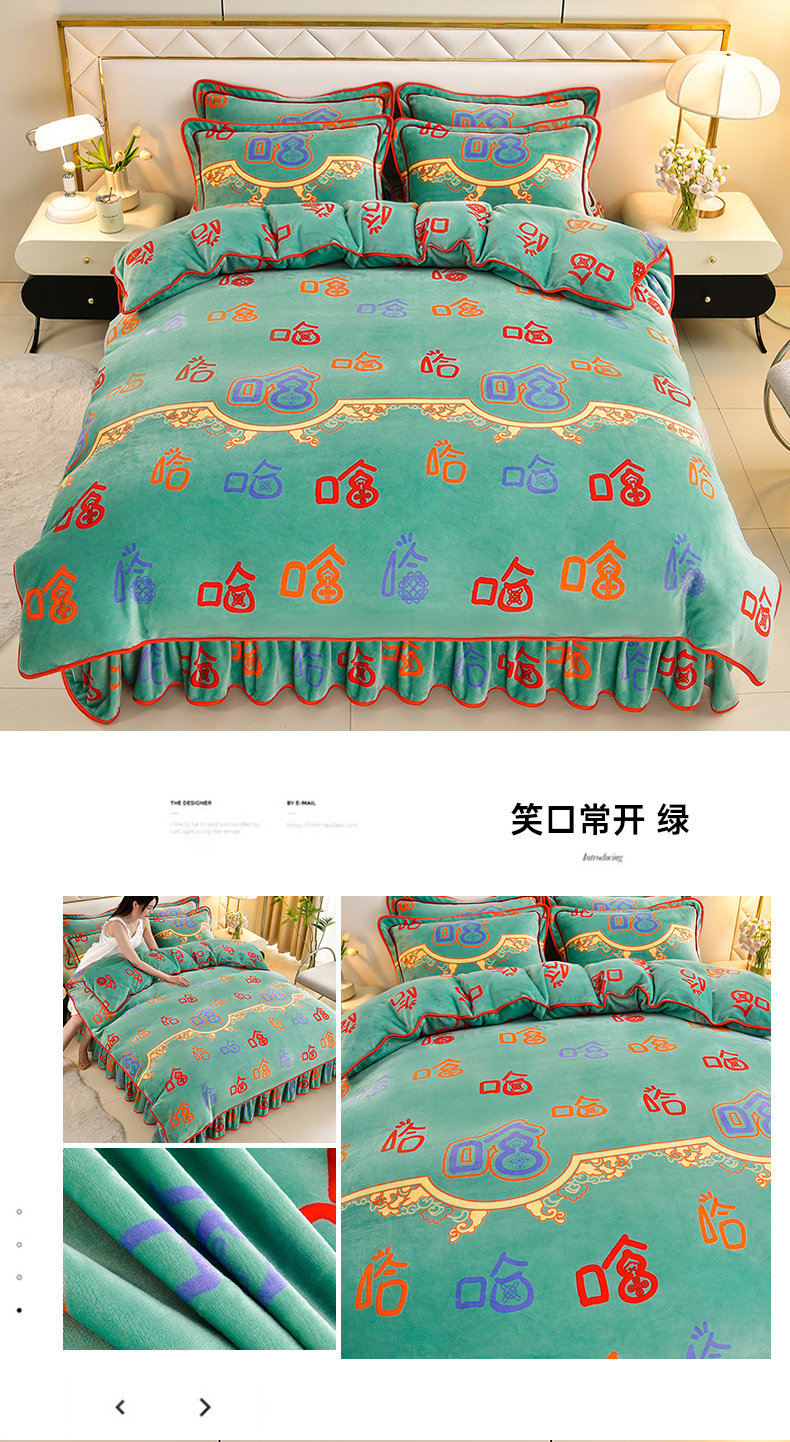 商品名称:馨梦缘 2025直播爆款8.5斤牛奶绒四件套加厚保暖床裙金貂绒 笑口常开 绿