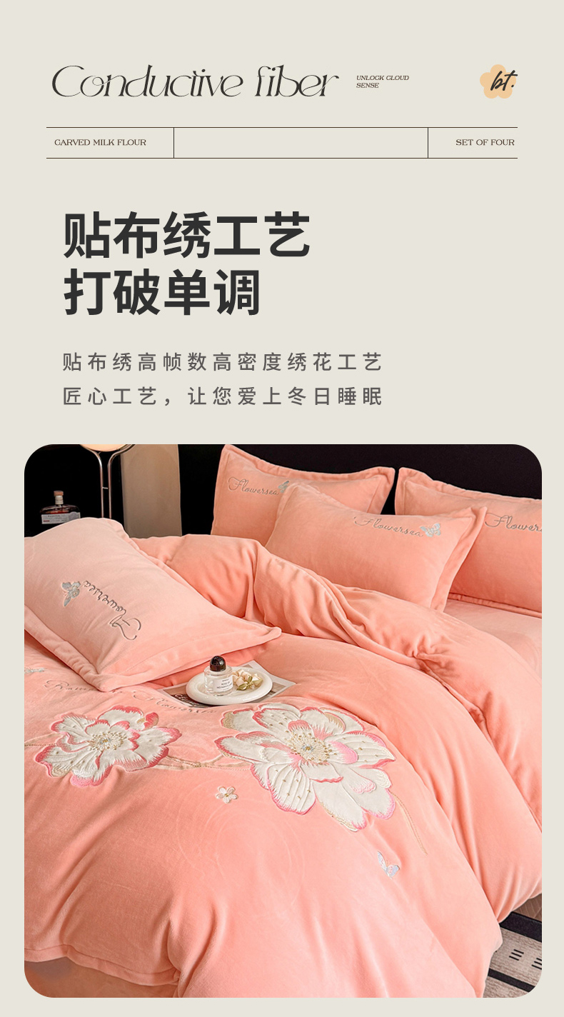 商品名称:喜梦缘家纺 2025新款牛奶绒大版贴布绣四件套 富贵花开-玉色