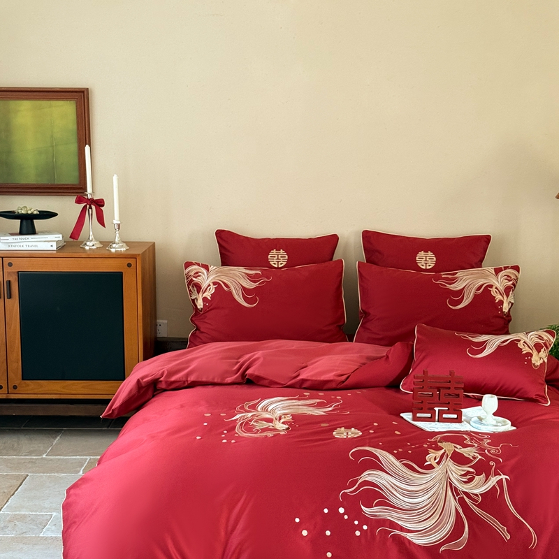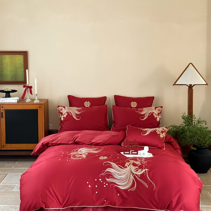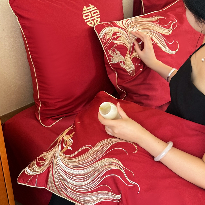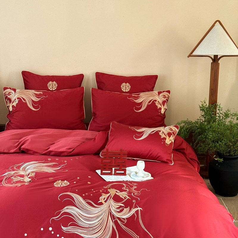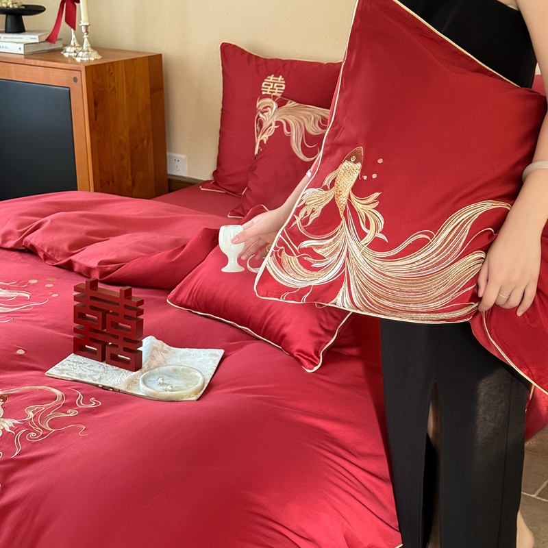(总)西西家居 2025新款100支长绒棉纯棉高精密提花拼接婚庆四件套-吉庆有鱼