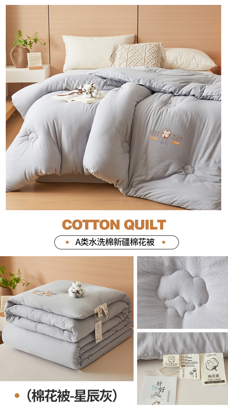 • 91家纺网 家纺一手货源 找家纺 富艺隆 2025新款A类新疆棉花被水洗棉被子被芯加厚冬被春秋被学生宿舍被子(高克重面料,带检测口) 棉花被-星辰灰