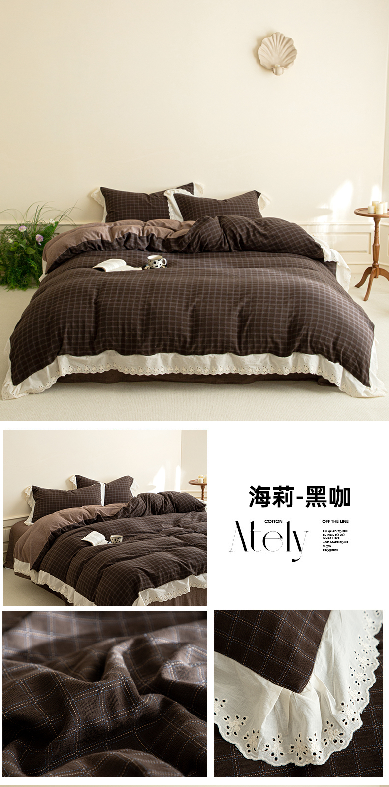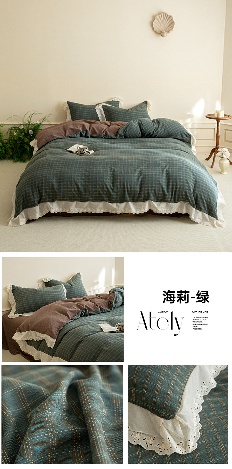 (总)棉眠 2025新款全棉色织双层纱格子法式大花边款,海莉-黑咖,海莉-绿,蕾拉