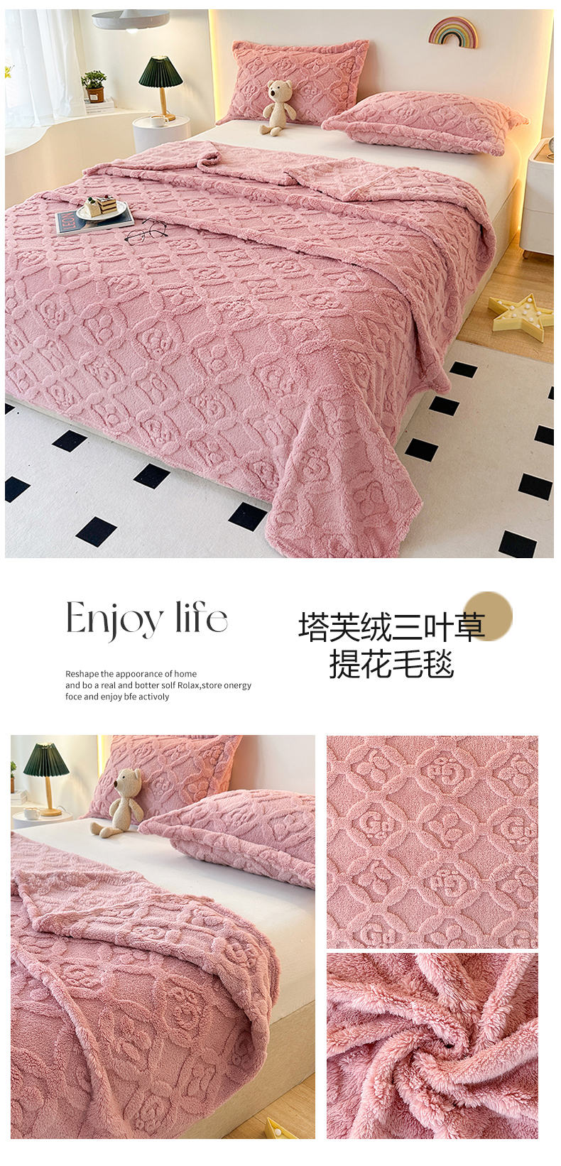 商品名称:栩裕纺织 2025新款塔芙绒三叶草提花毛毯-卷边款 浅卡其