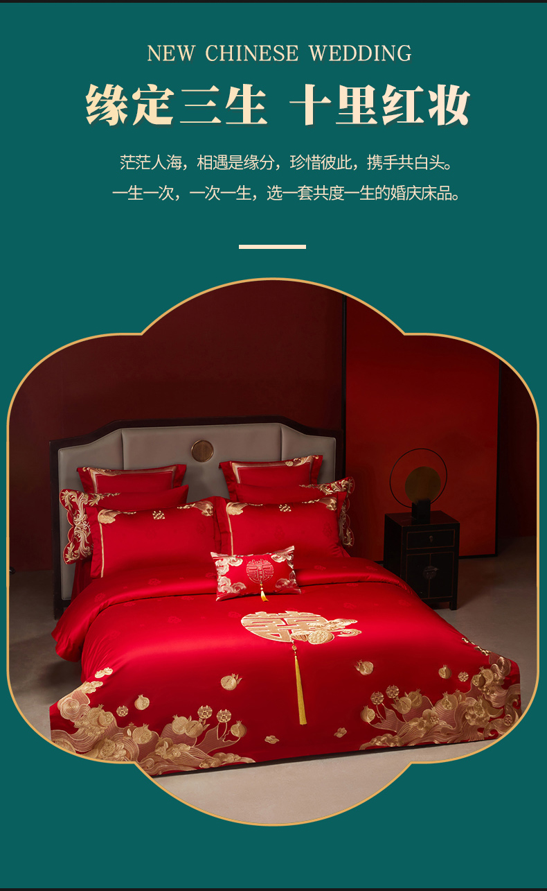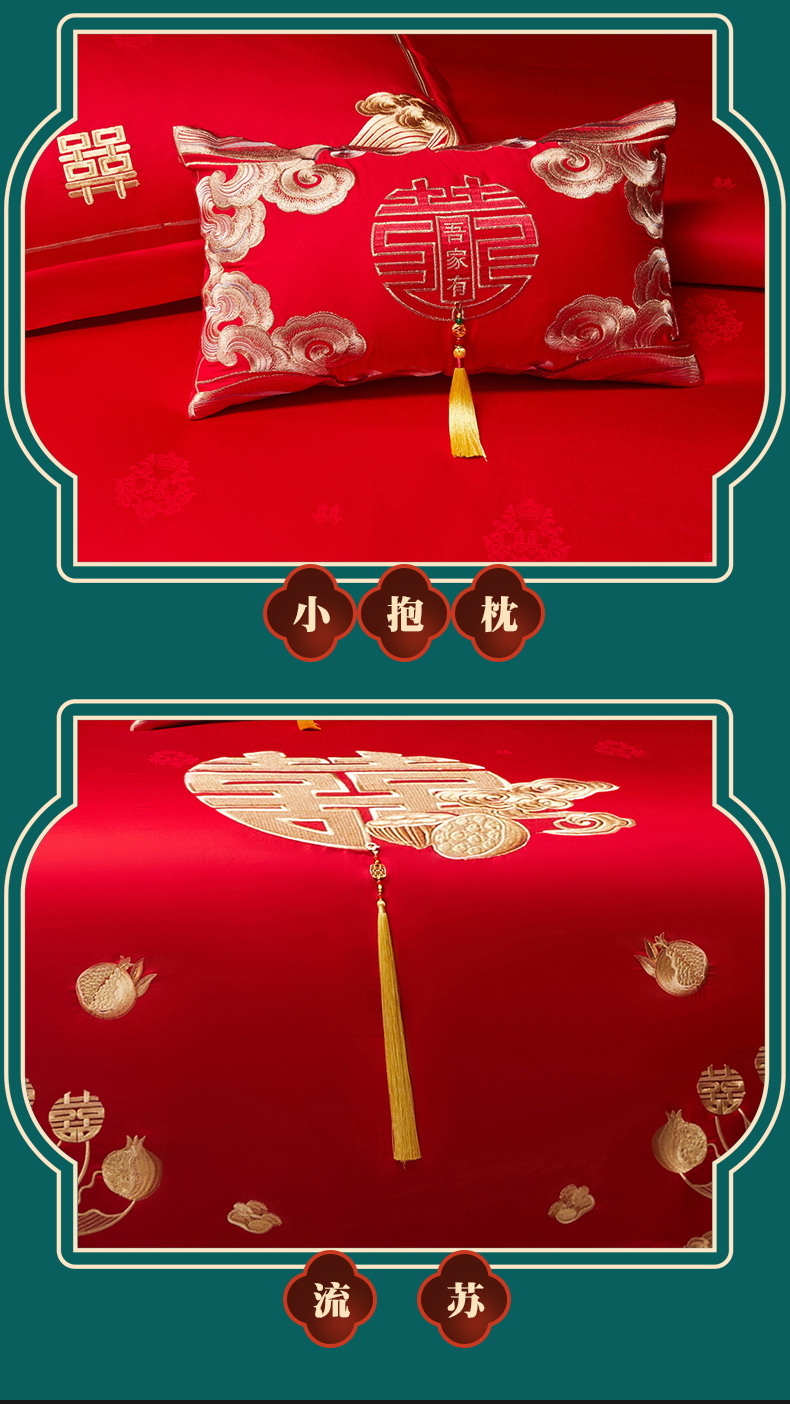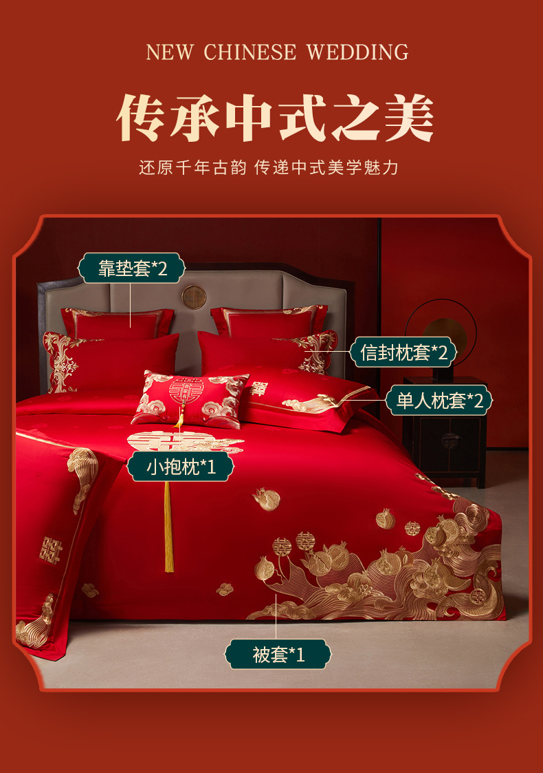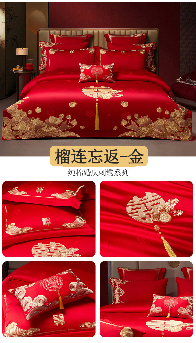 当前位置: 91家纺网 > 商品网购 > 床品套件 > 四件套 > 婚庆四件套 > 宏羽纺家纺 2025新款高支高密全棉提花新中式婚庆多件套 高支高密榴连忘返-金