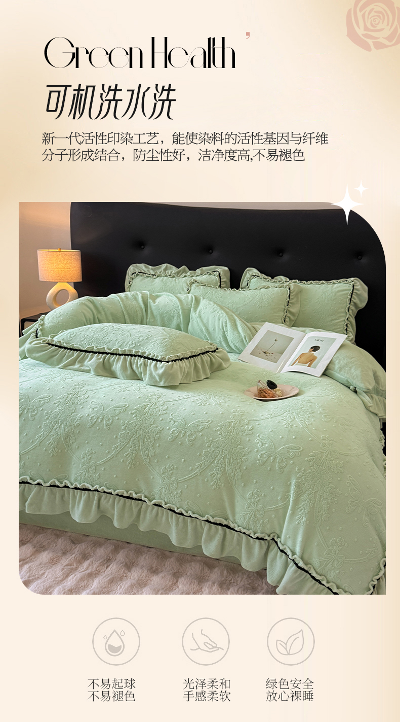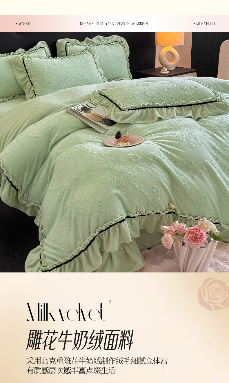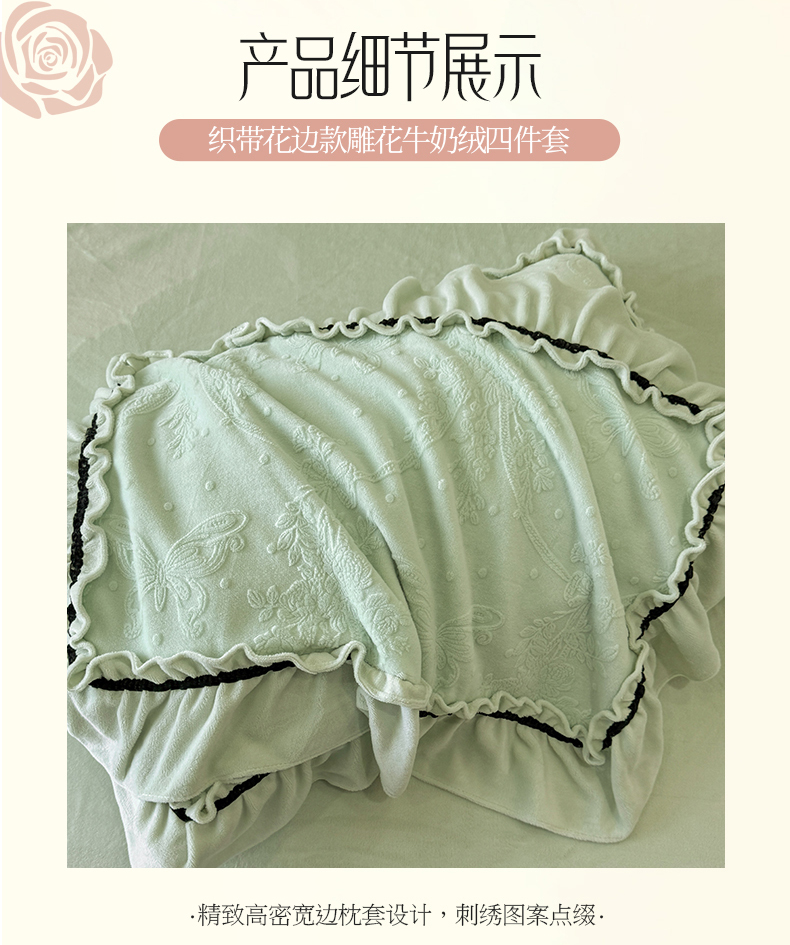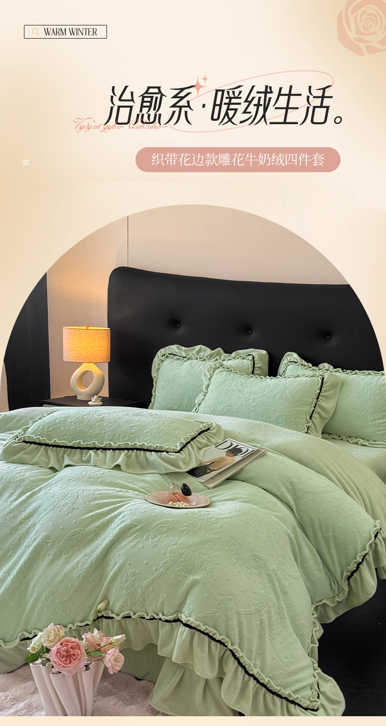 绘萱家居 2025新款新品爆款高密消光织带花边款雕花牛奶绒四件套 妮娜-绿