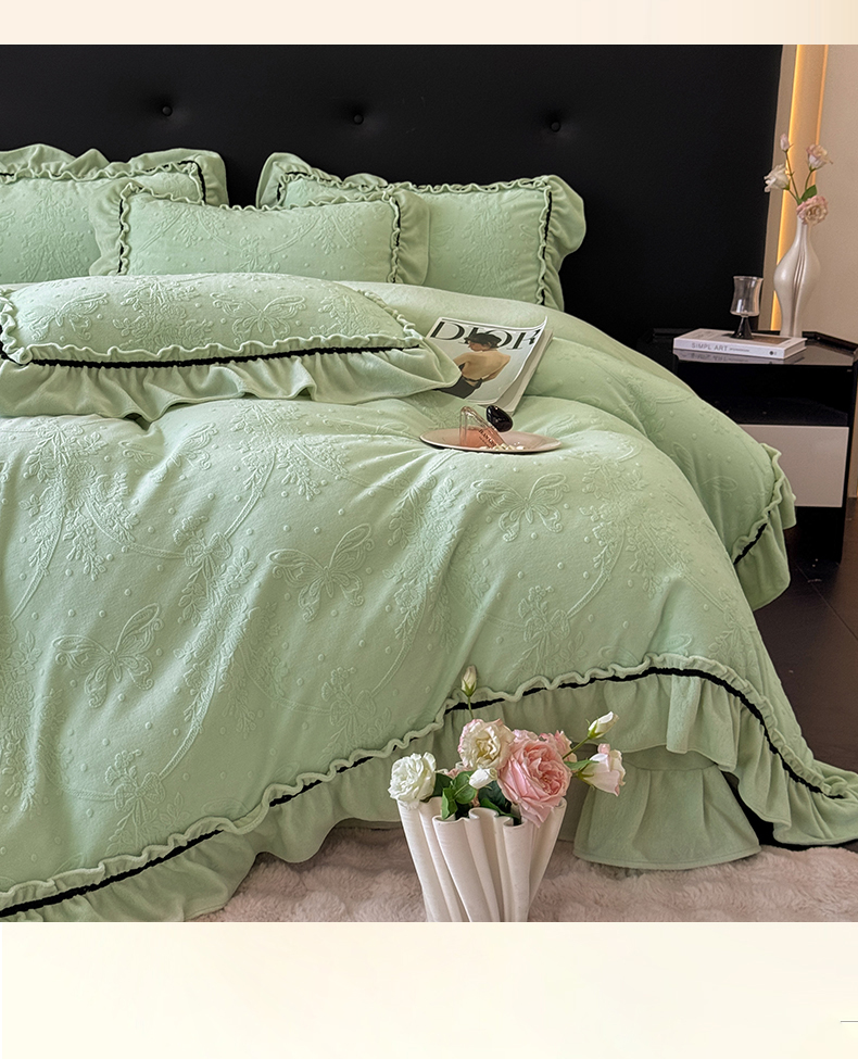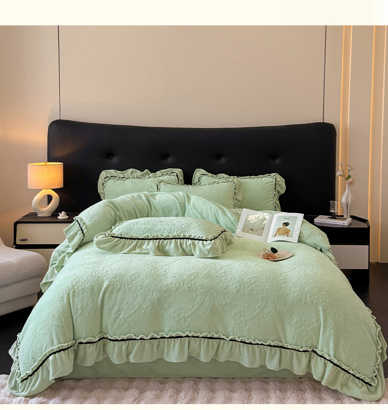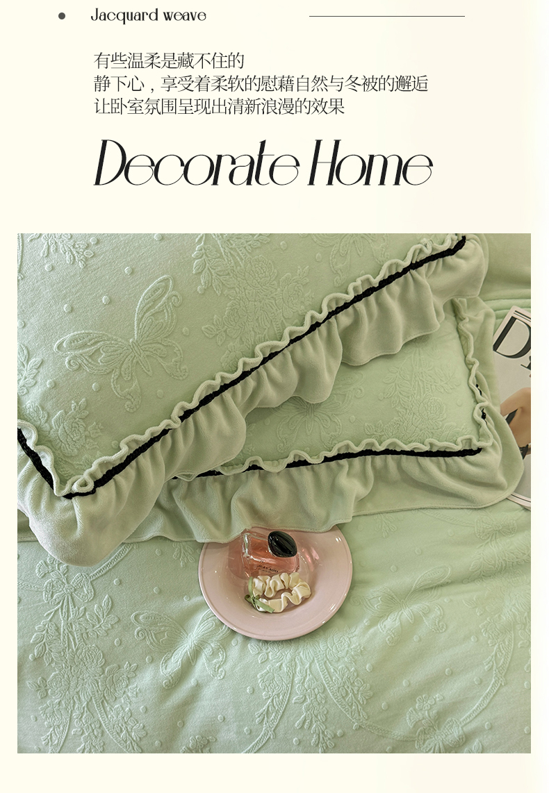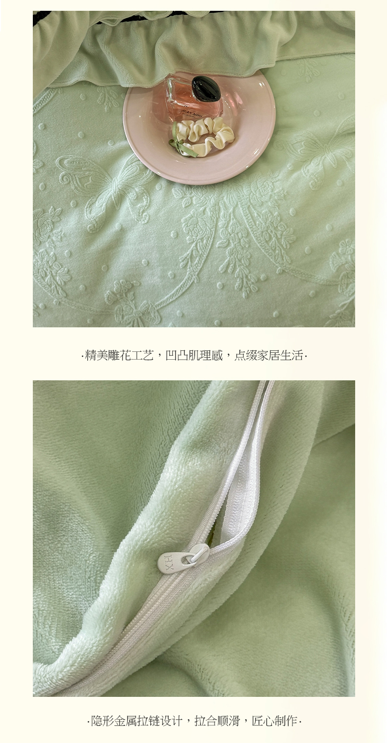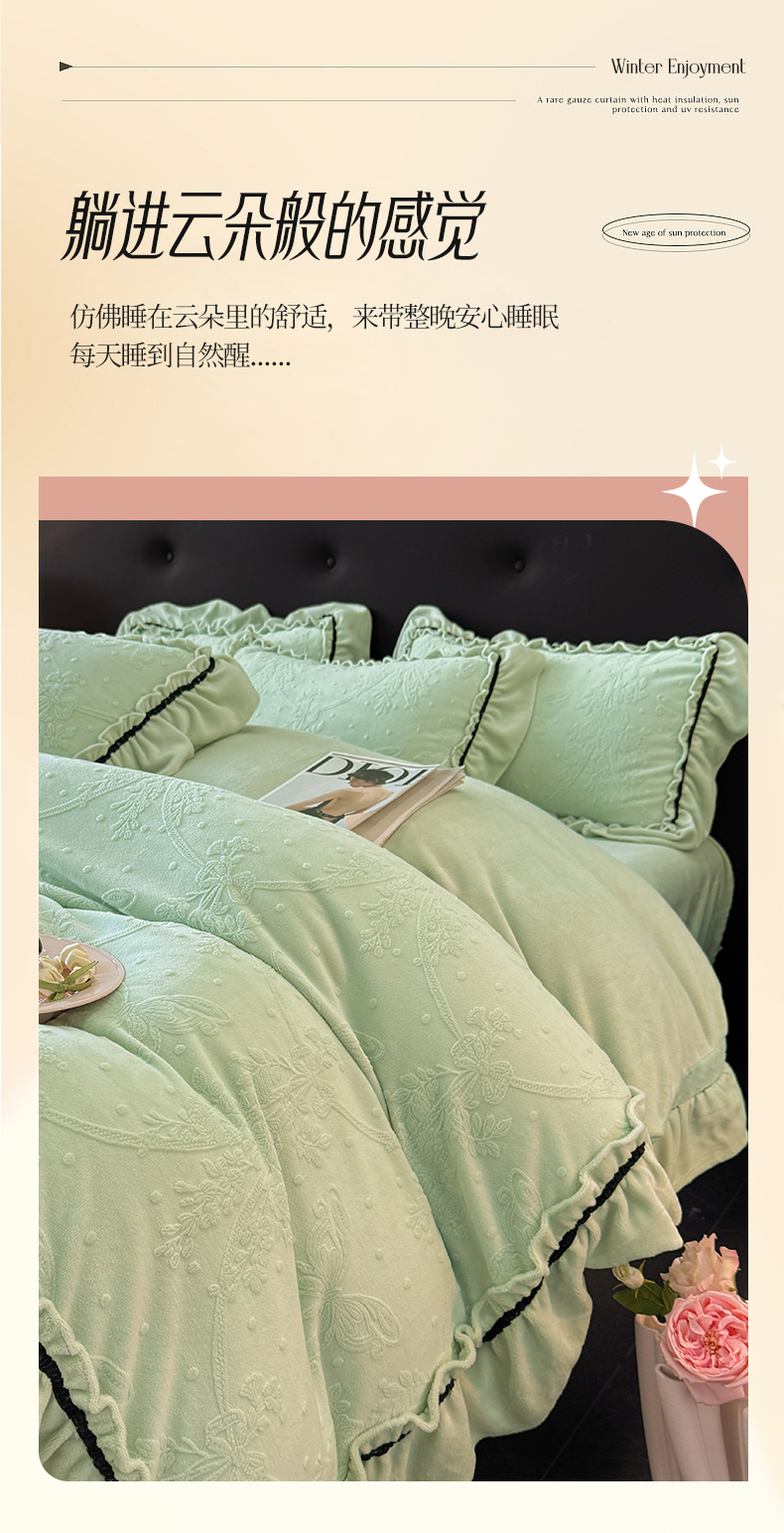 绘萱家居 2025新款新品爆款高密消光织带花边款雕花牛奶绒四件套 妮娜-绿