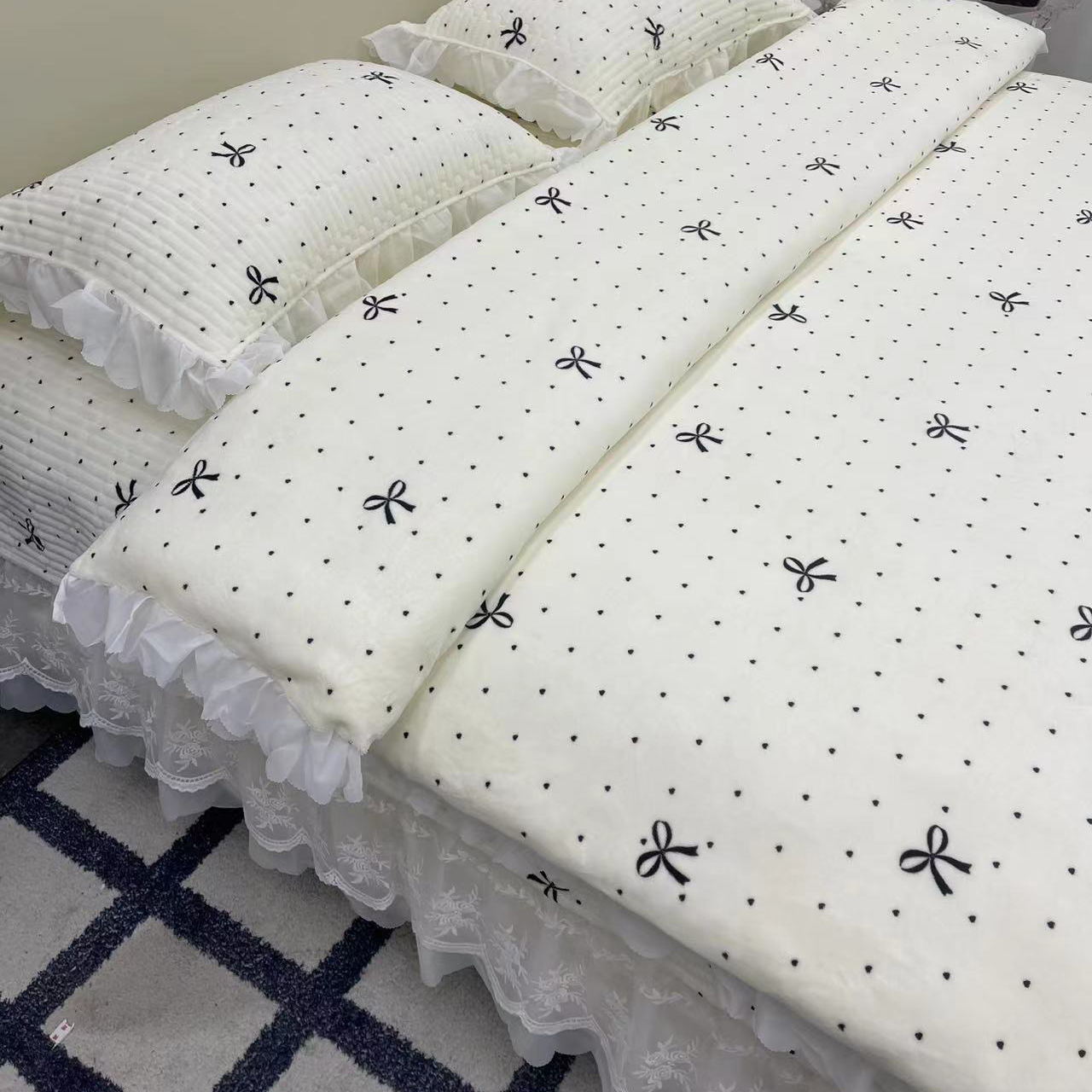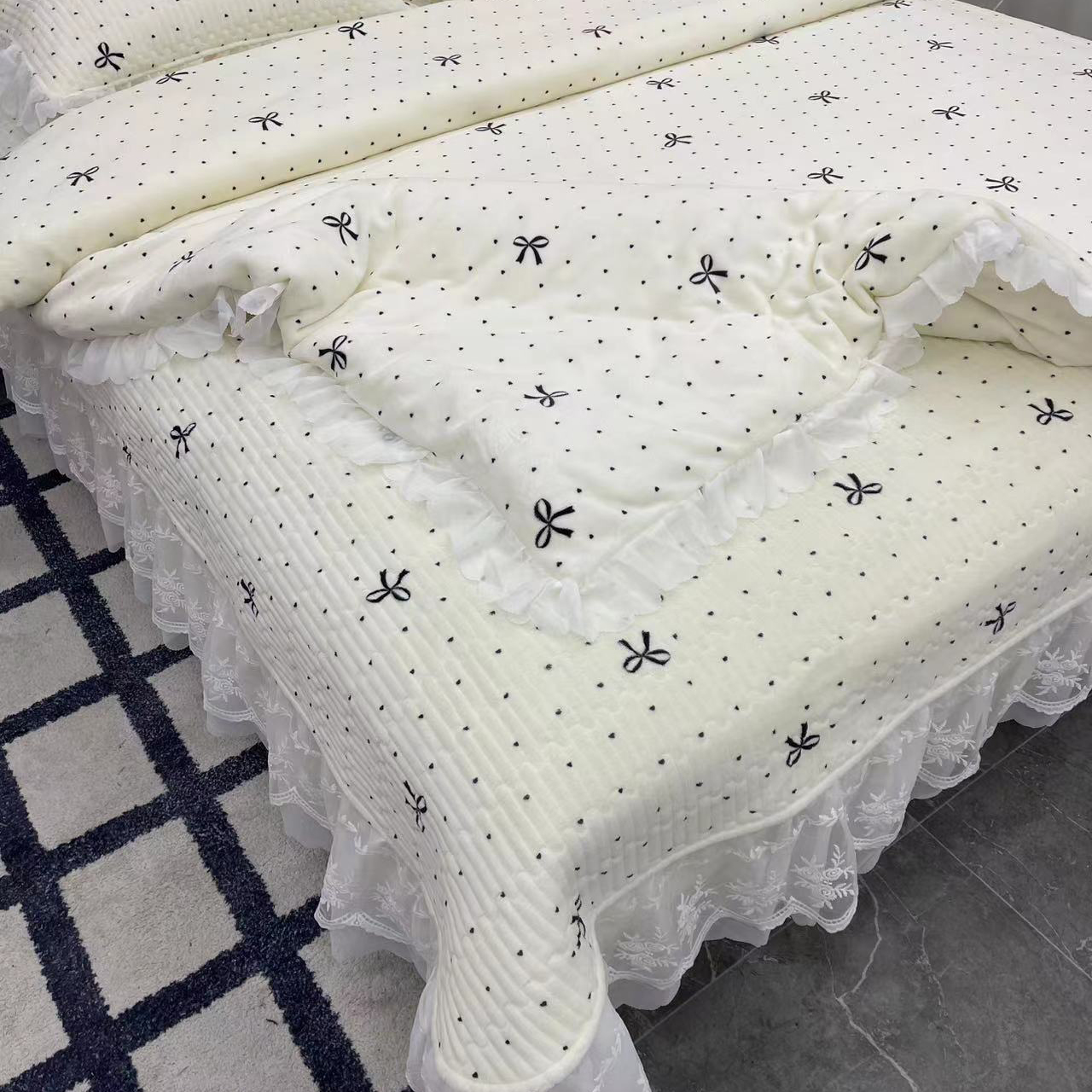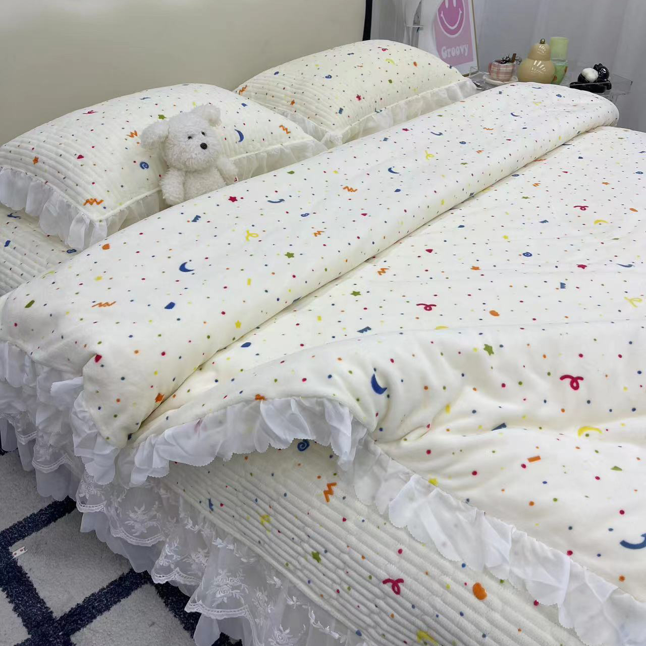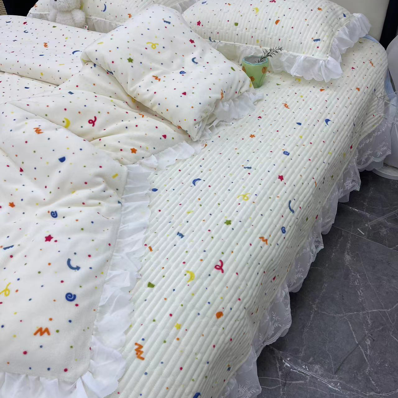 商品名称:禧瑞谷 2025新款冬季牛奶绒双层蕾丝花边床盖三件套床盖四件套 星月小确幸