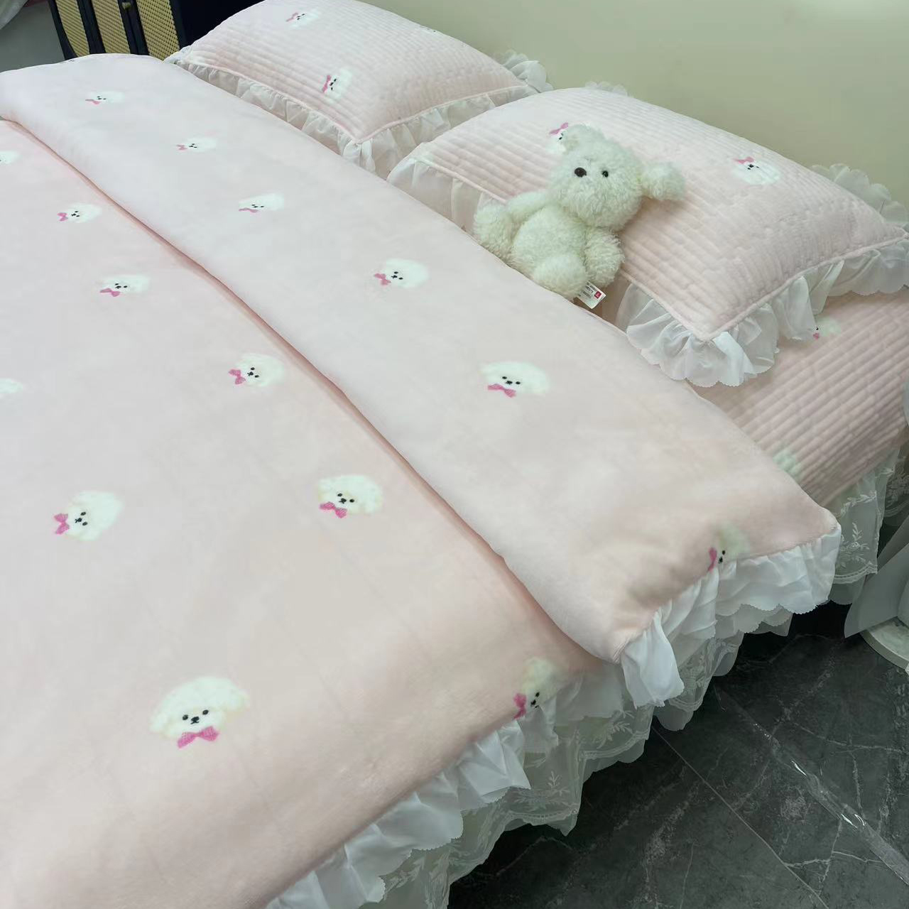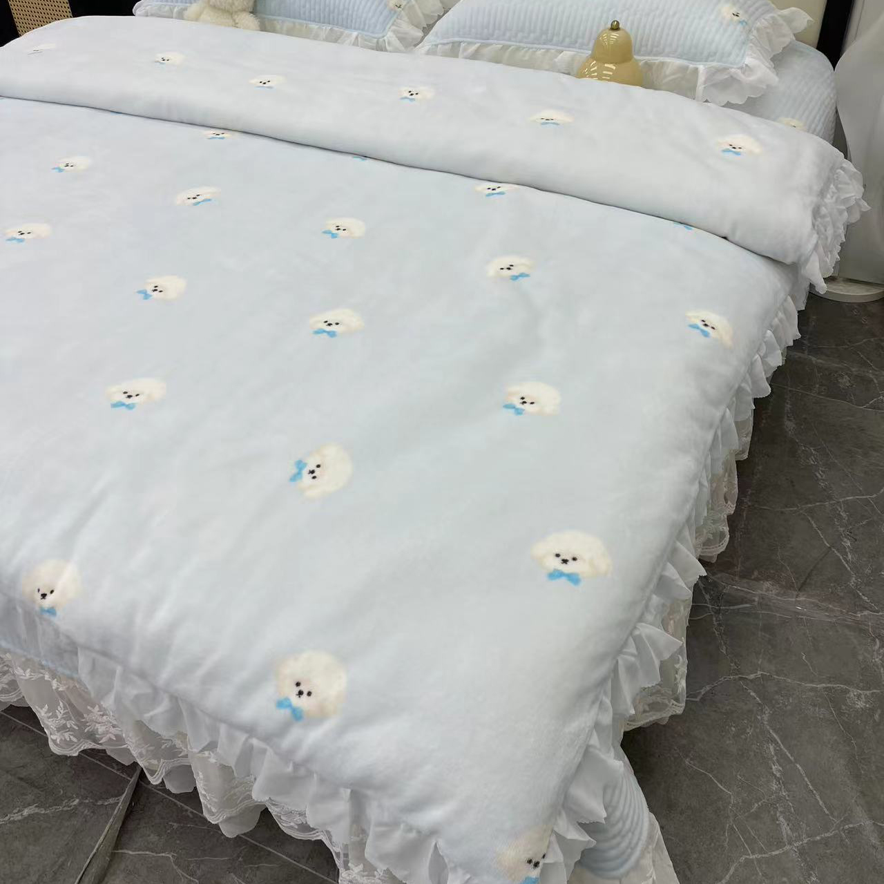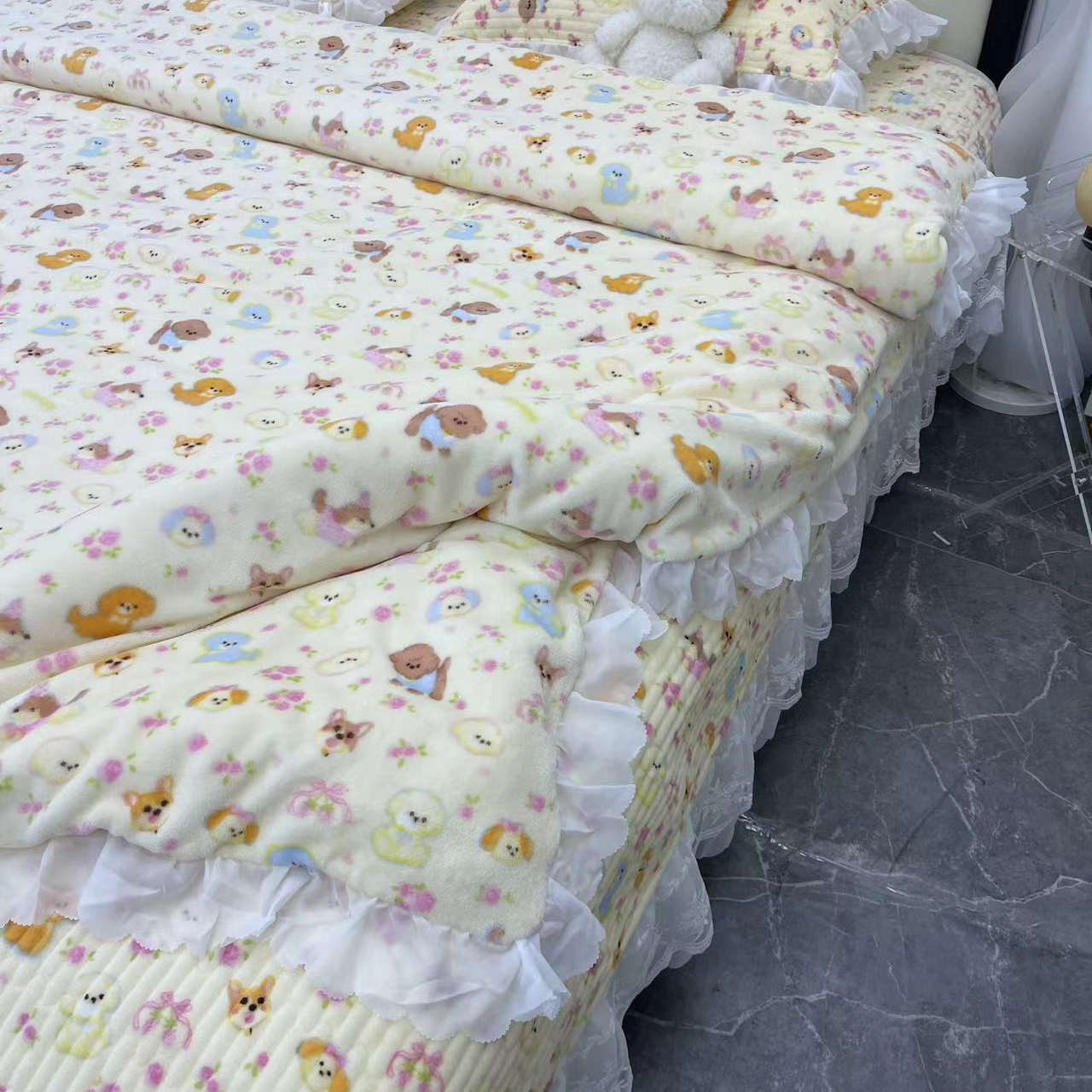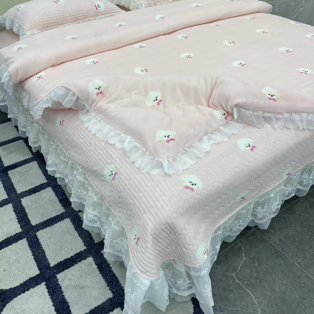 (总)禧瑞谷 2025新款冬季牛奶绒双层蕾丝花边床盖三件套床盖四件套,点点蝴蝶结,粉底小狗,蓝底小狗,奶油小狗,星月小确幸,KT猫,蝶舞白色,蓝底爱心,洛丽塔蓝,碎花小女孩,波点,草莓蝴蝶结,蓝色蝴蝶结,奶糖少女,蛋糕猫