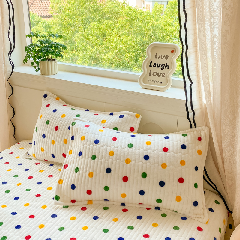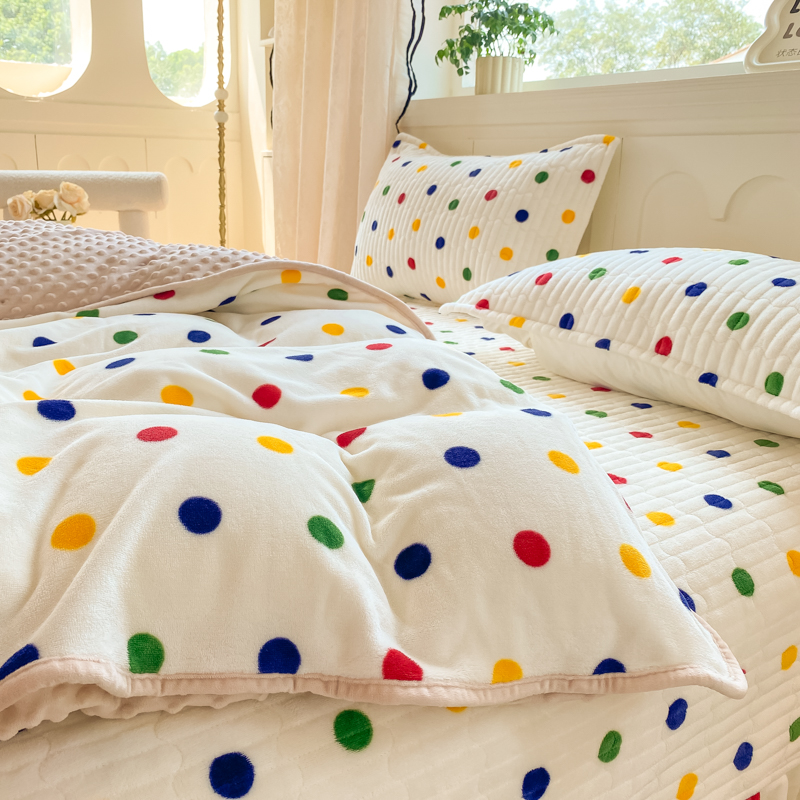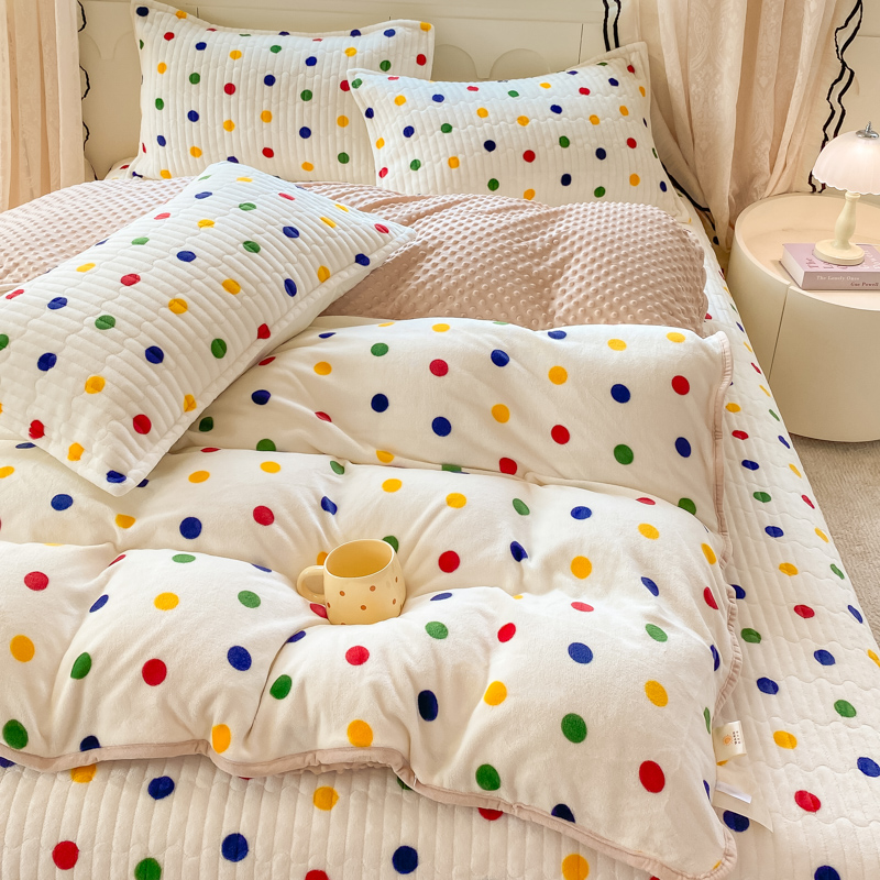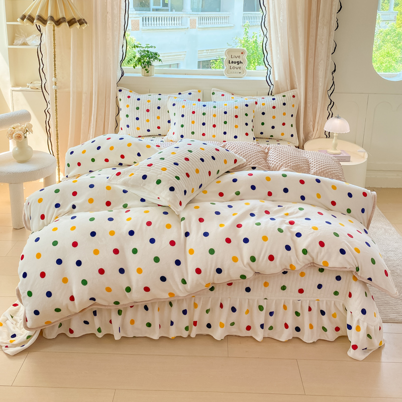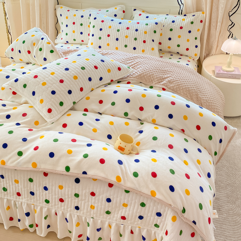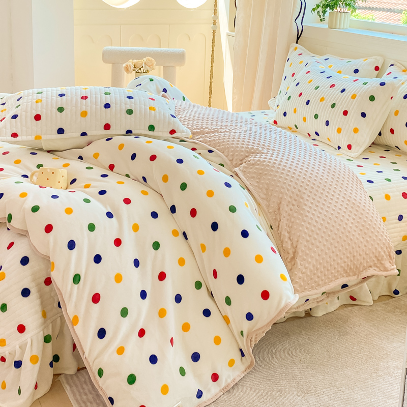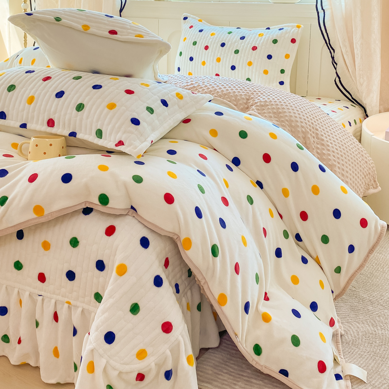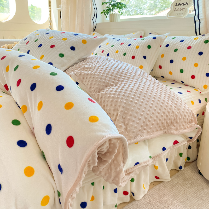 商品名称:尚美 2025新款豆豆绒牛奶绒大花边床盖四件套-系列2(床盖花边随机) 彩色波点