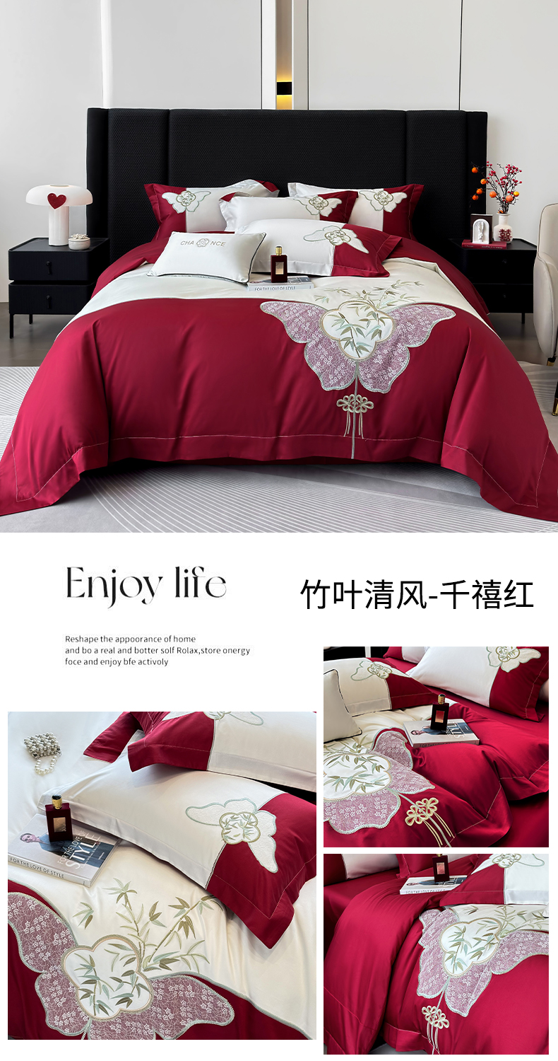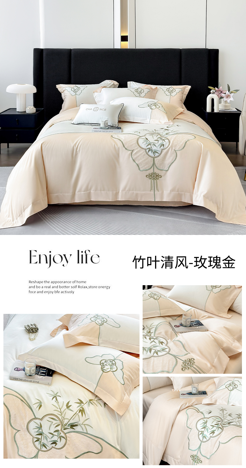 商品名称:丞音 新中式轻奢风A类长绒棉50s双股100支贡缎绣花全棉被套刺绣纯棉四件套床笠高档礼盒包装 竹叶清风-清新绿