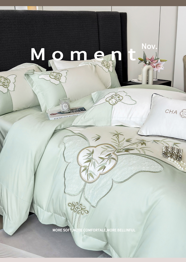 丞音 新中式轻奢风A类长绒棉50s双股100支贡缎绣花全棉被套刺绣纯棉四件套床笠高档礼盒包装 竹叶清风-清新绿