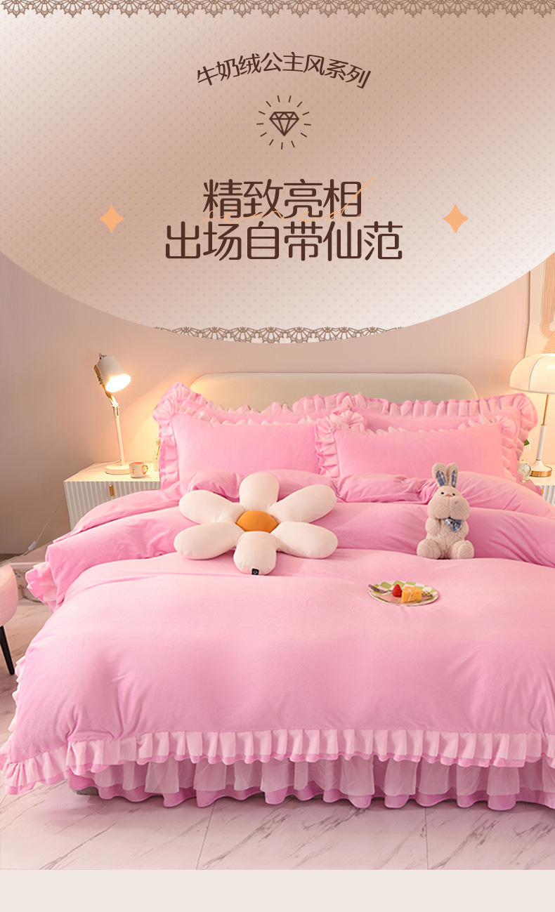 商品名称:后庭寝室 2025新款韩式花边牛奶绒四件套-香香公主系列 香香公主-粉色