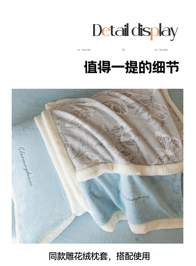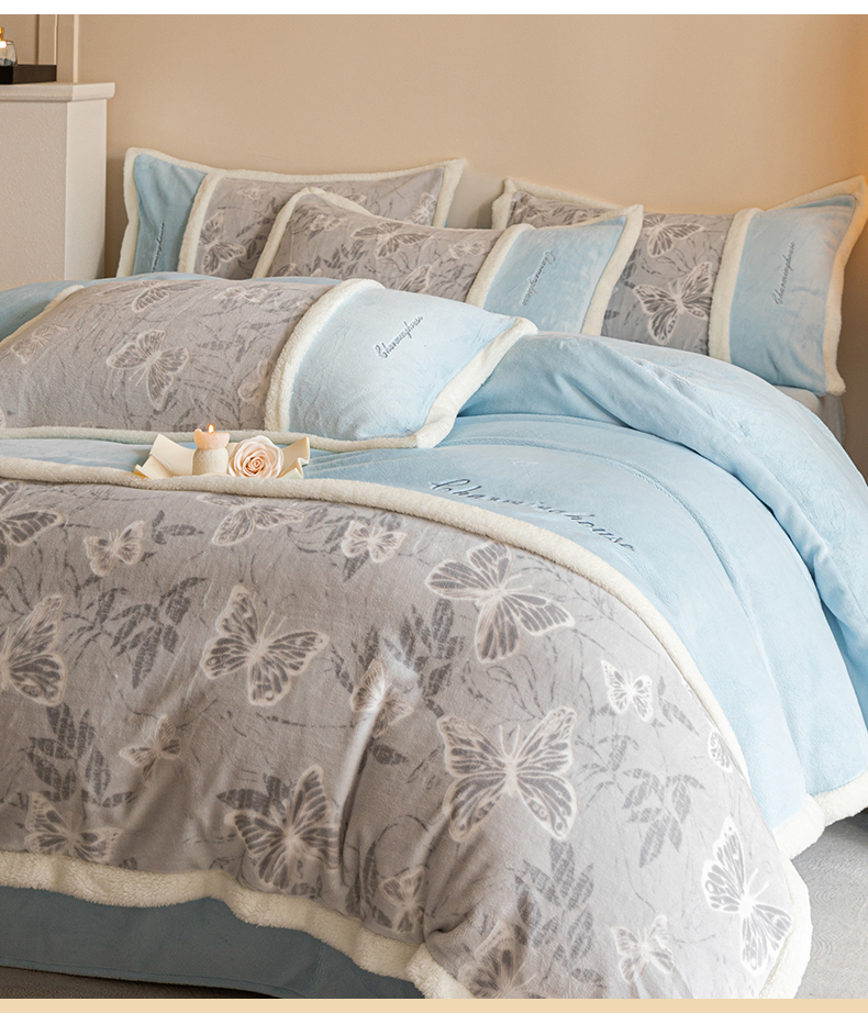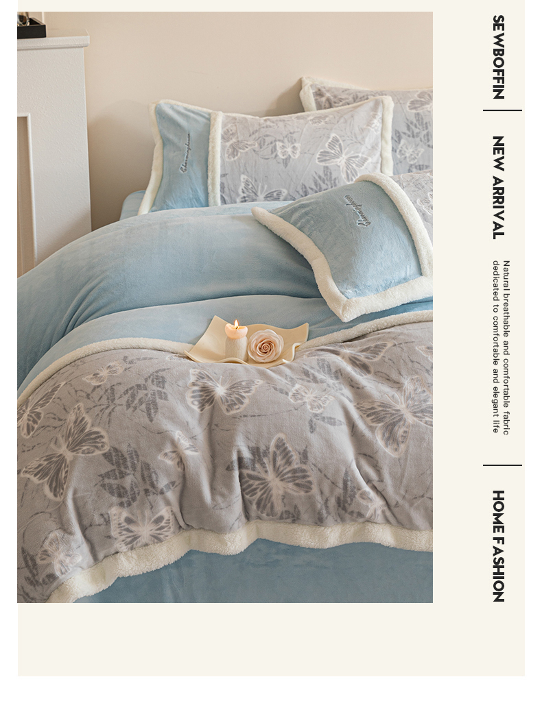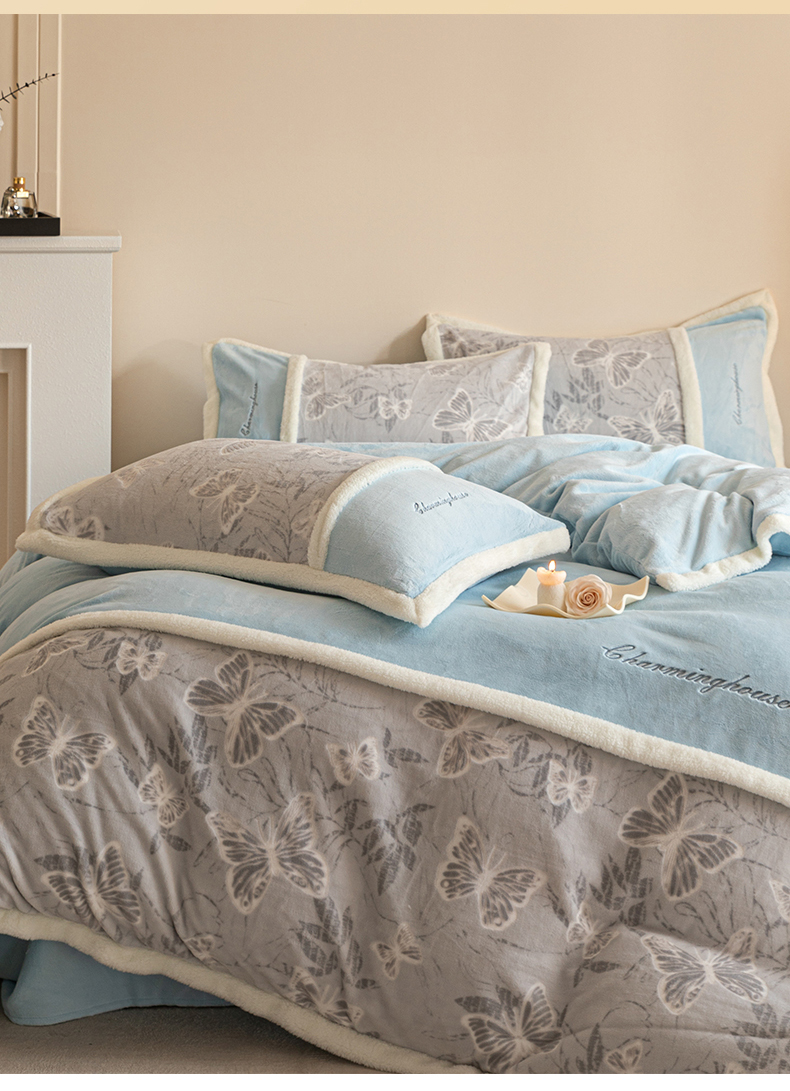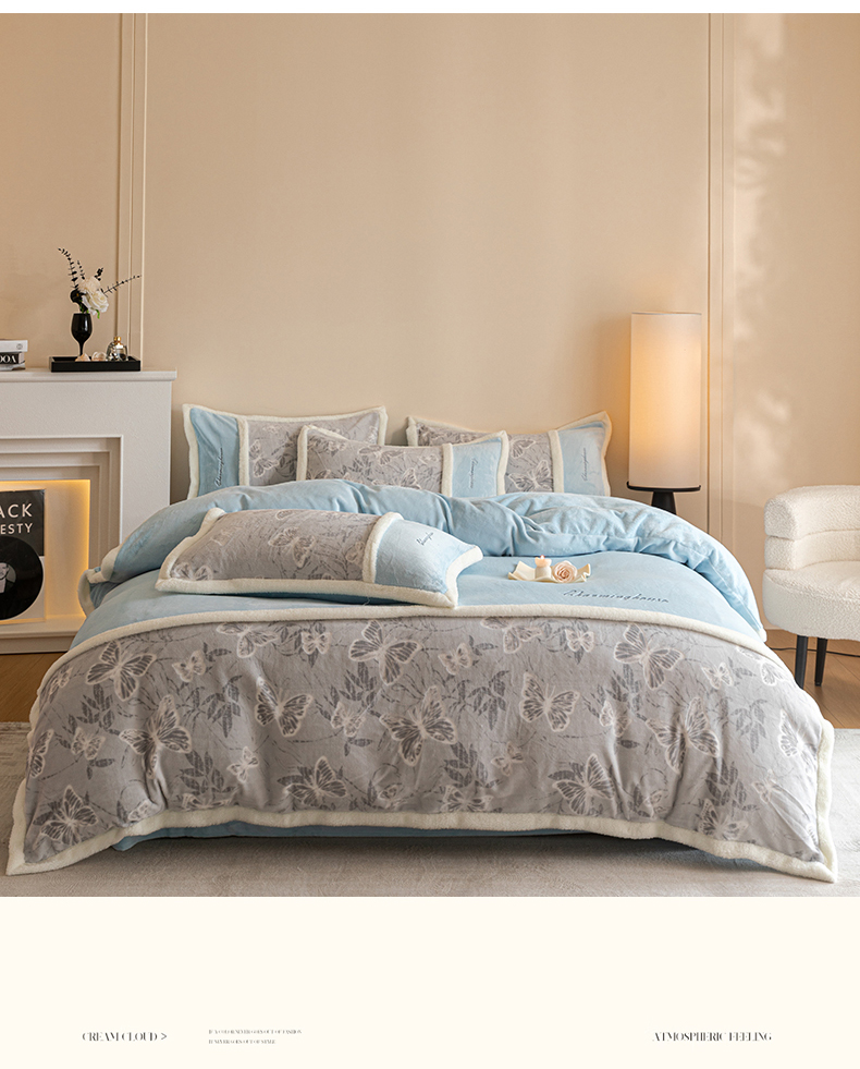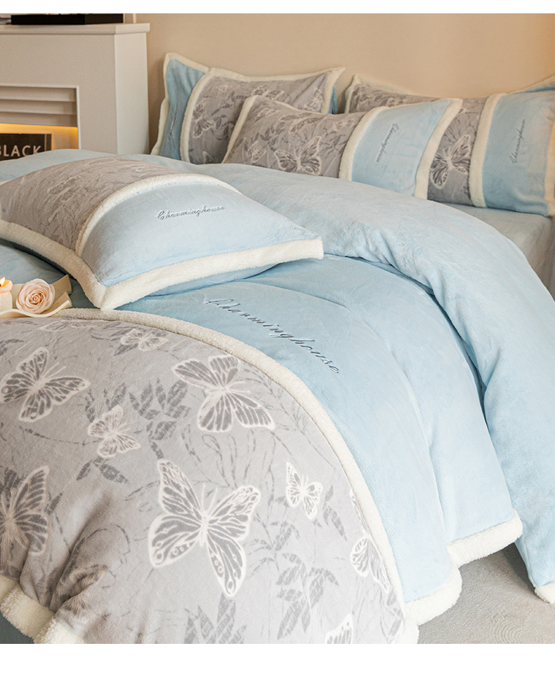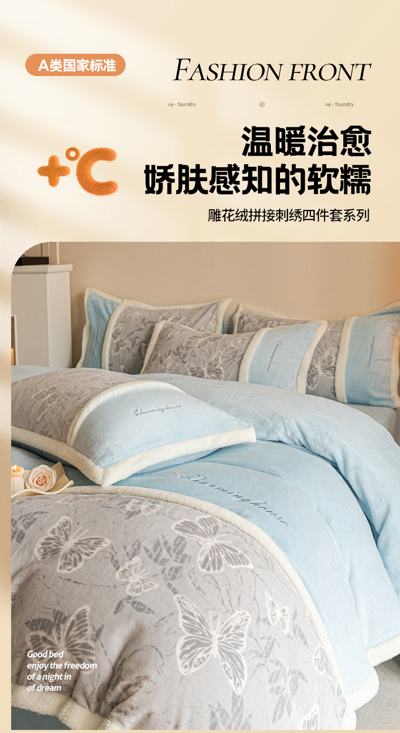 遇见家居生活馆 2025新款高克重雕花绒拼接刺绣四件套系列-艾菲妮 蝴蝶-天空蓝