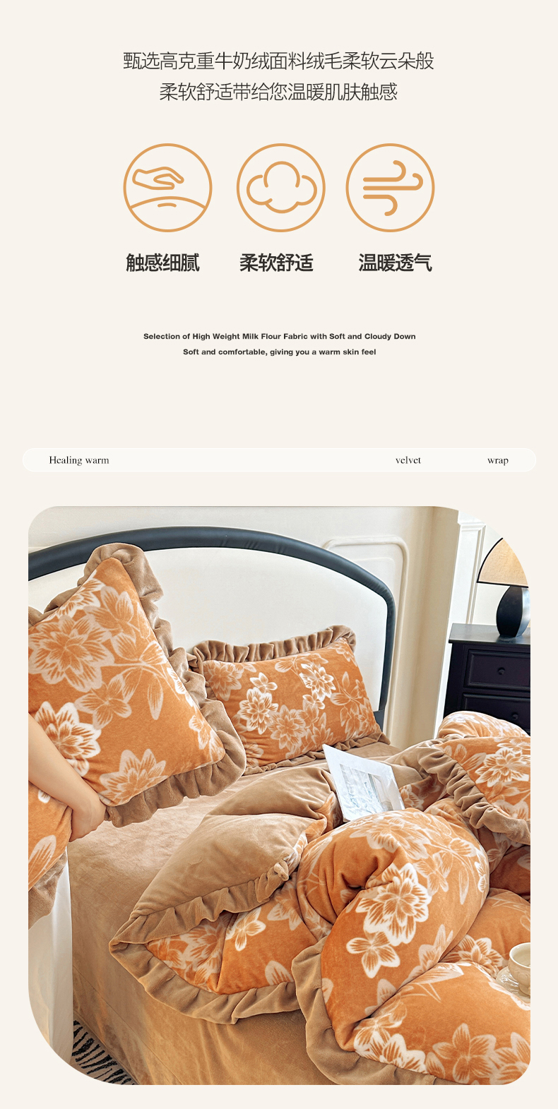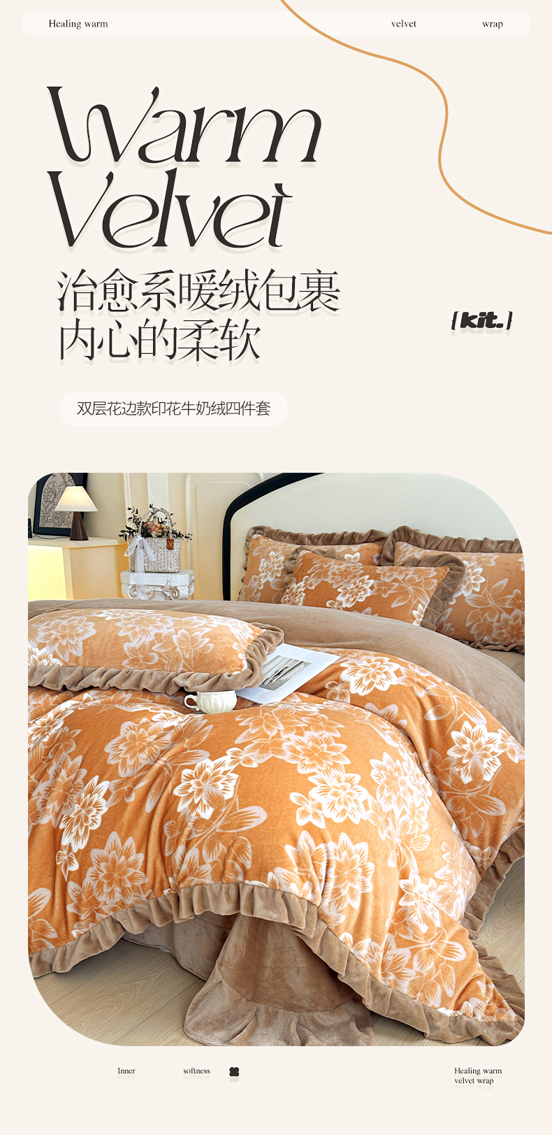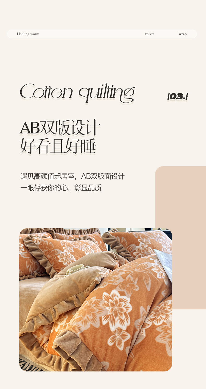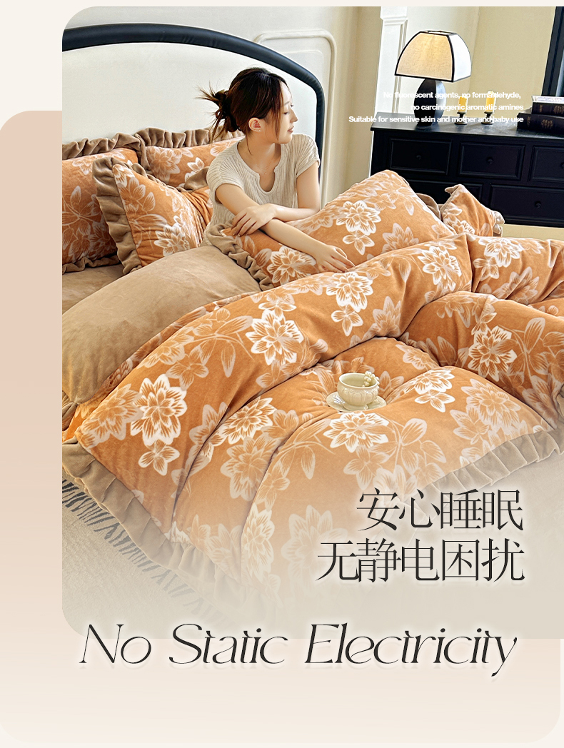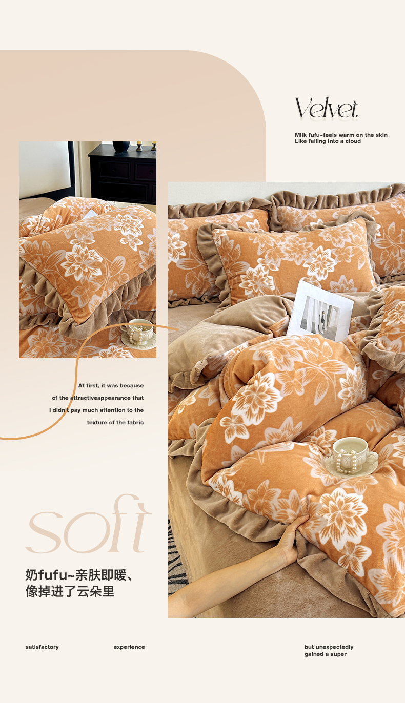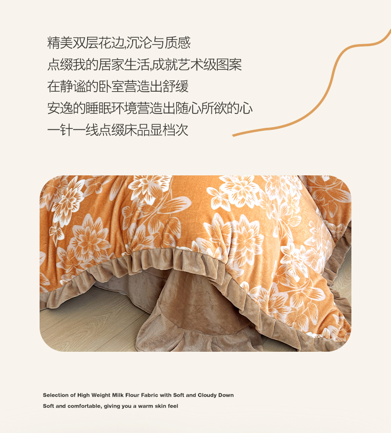 商品名称:绘萱家居 2025新款爆款高密消光双层花边牛奶绒四件套印花 灵动花语