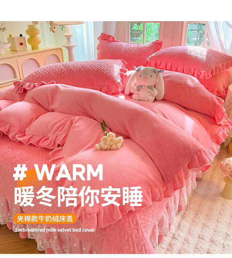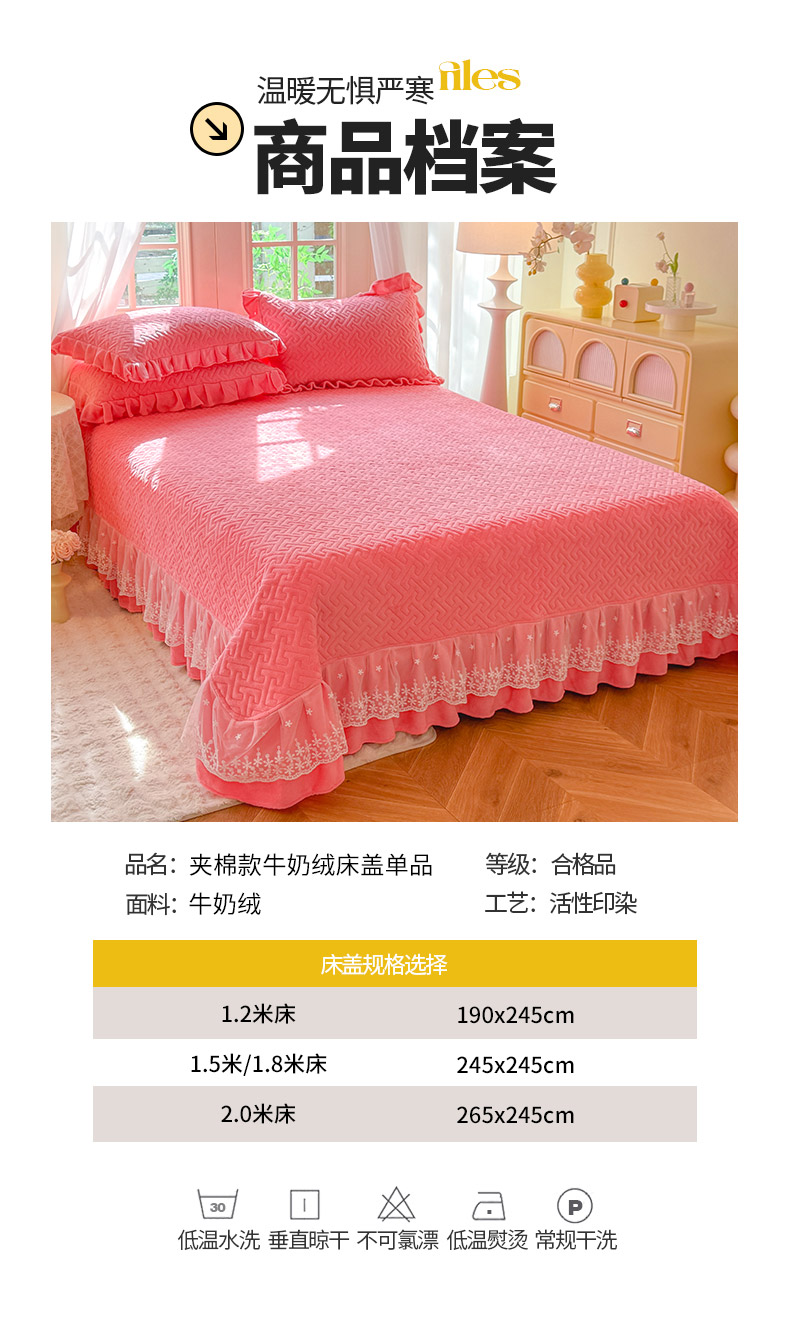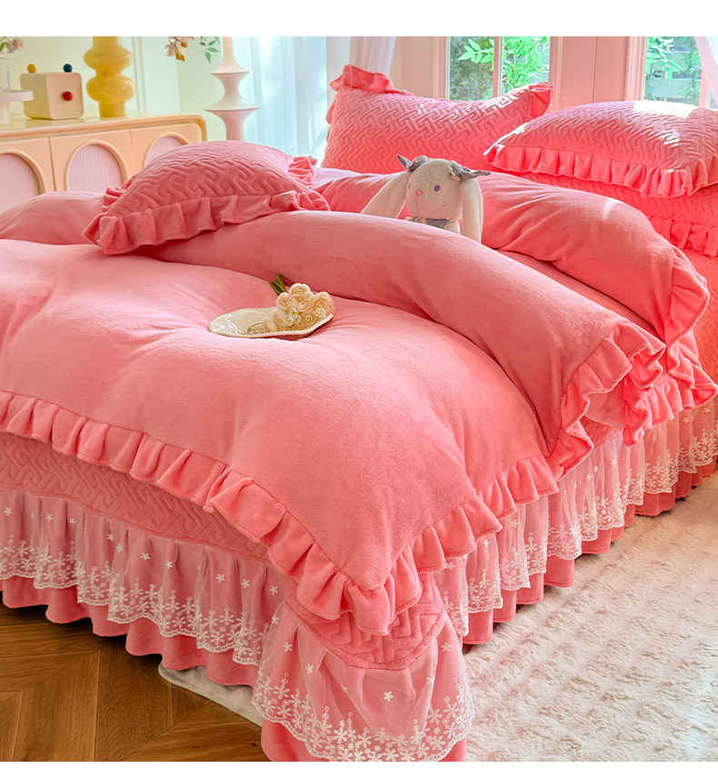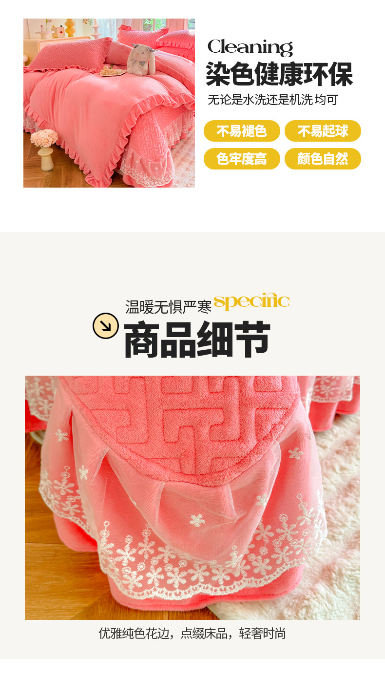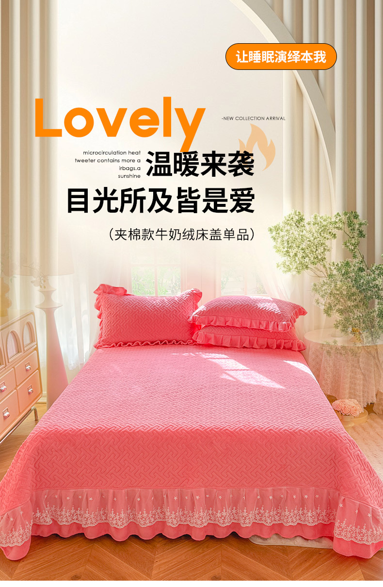 商品名称:优家居 2025秋冬高克重牛奶绒床盖夹棉床裙纯色蕾丝边花边刺绣法式公主风床罩夹棉床盖 甜心粉