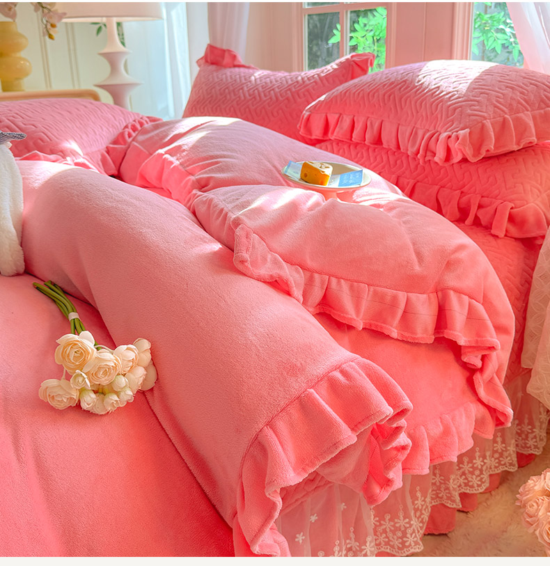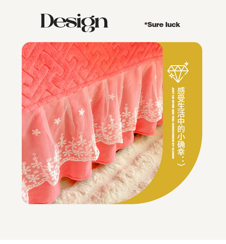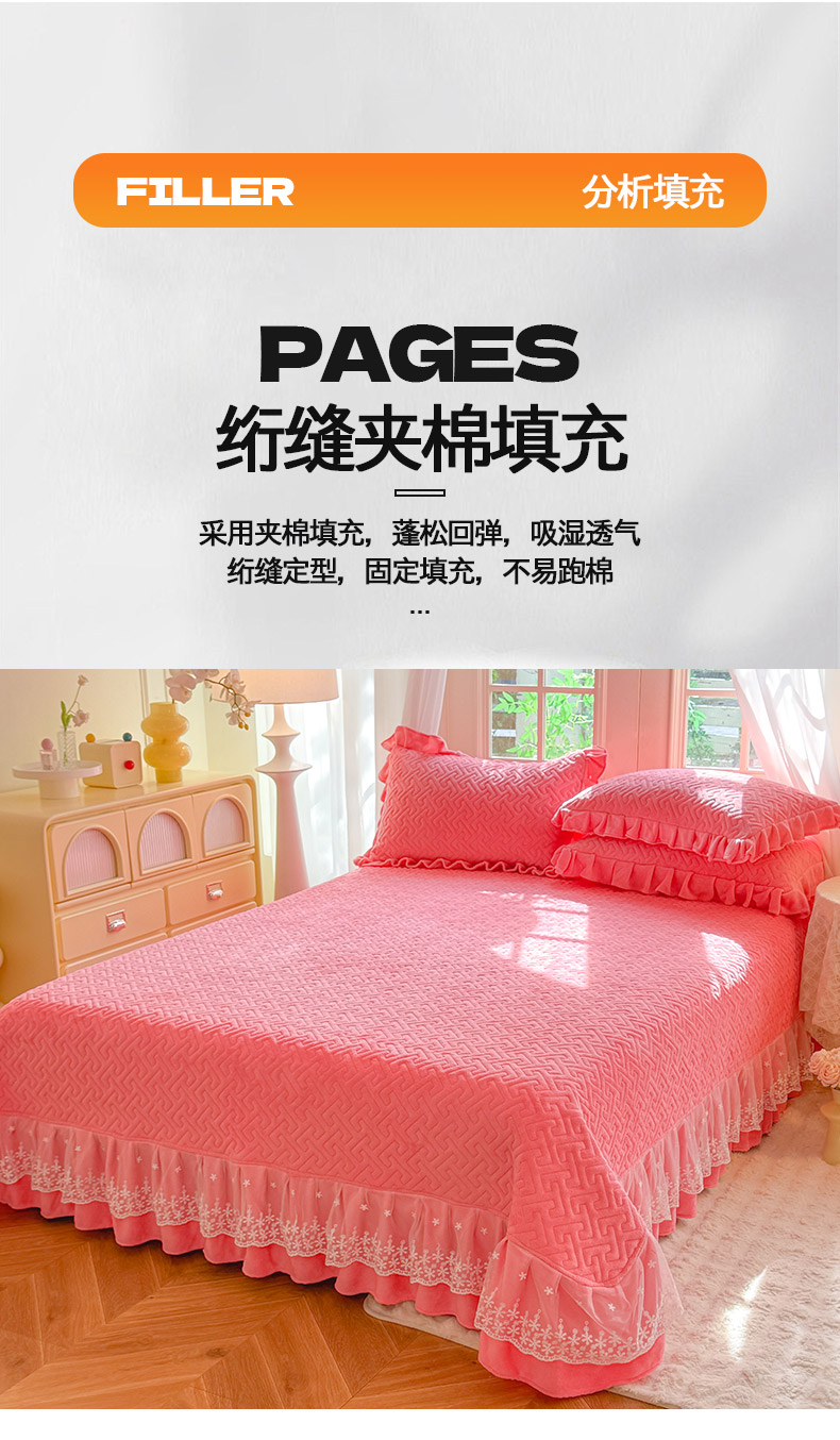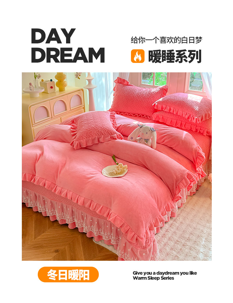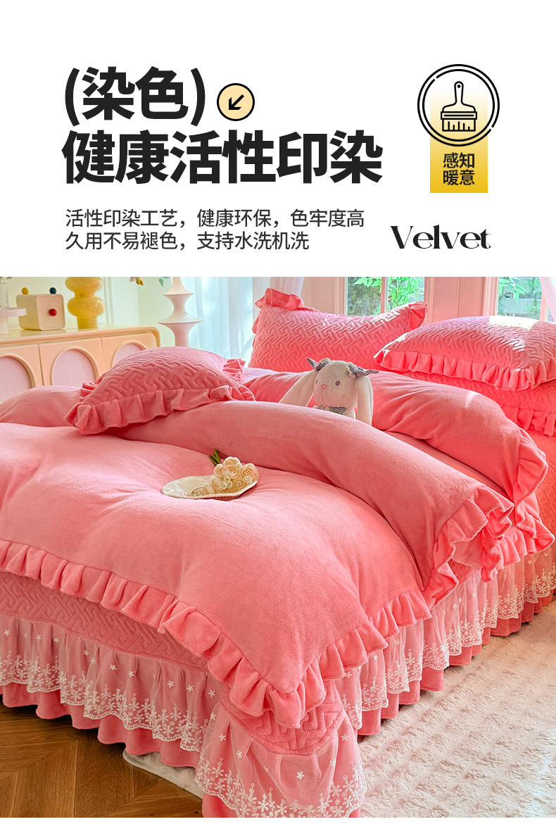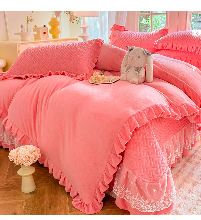 商品名称:优家居 2025秋冬高克重牛奶绒床盖夹棉床裙纯色蕾丝边花边刺绣法式公主风床罩夹棉床盖 甜心粉
