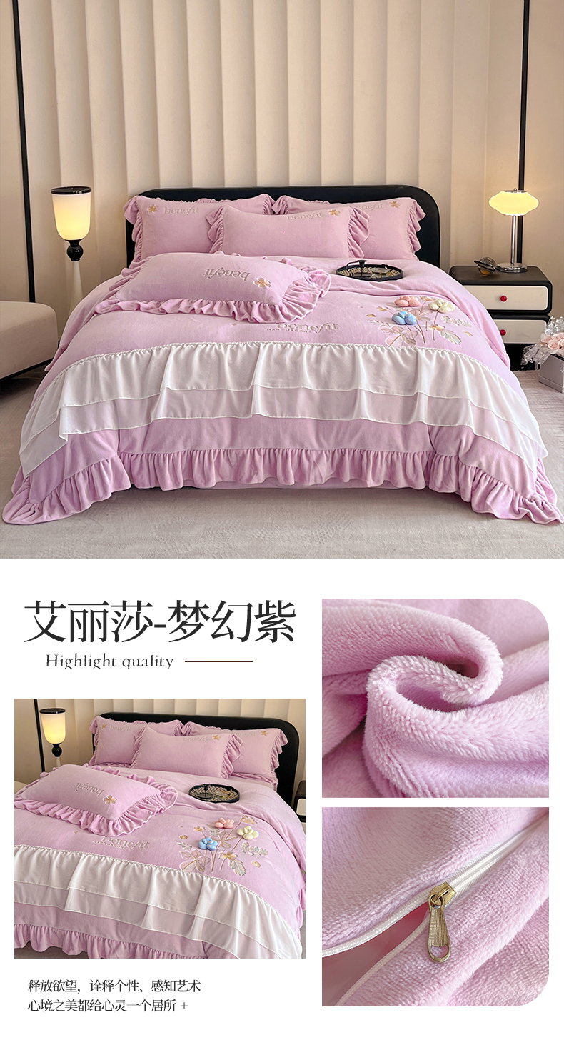 (总)爱家(原缔乐家纺) 2025新款牛奶雕花绒四件套-香香公主,香香公主-公主粉,香香公主-梦幻紫,香香公主-奶油黄