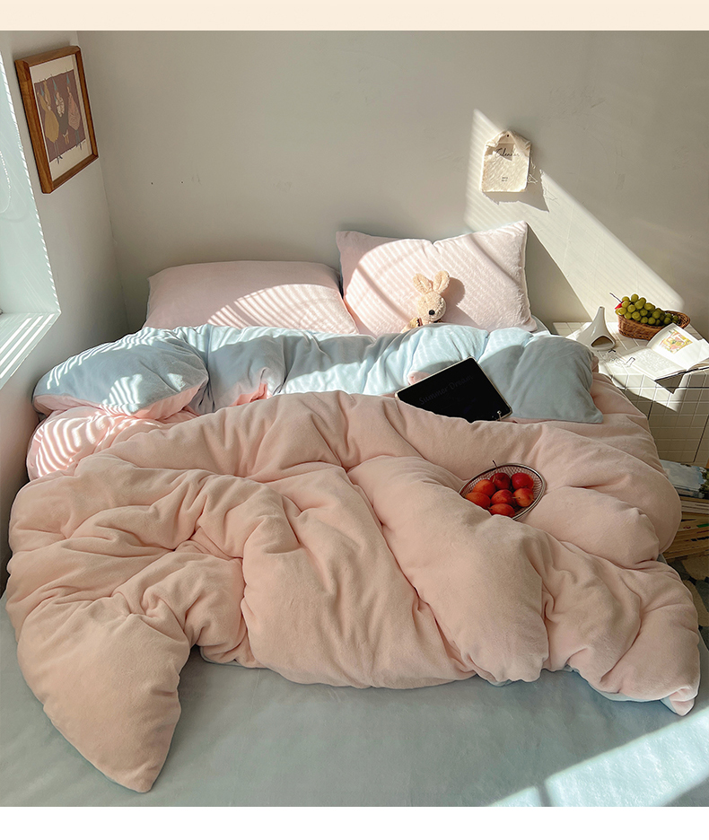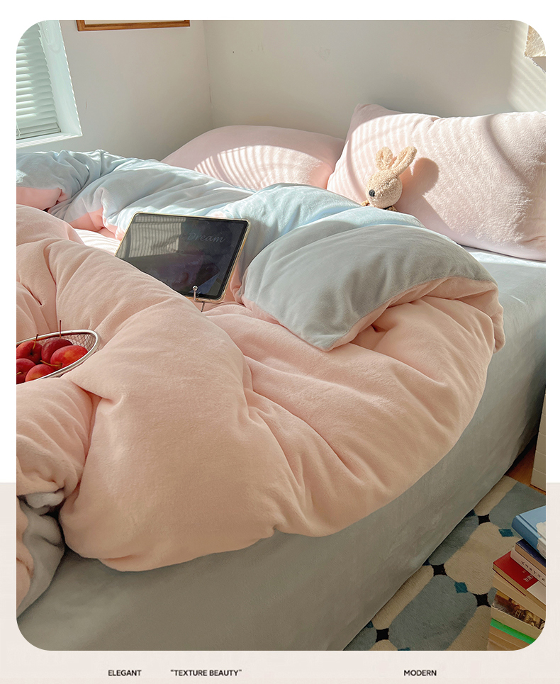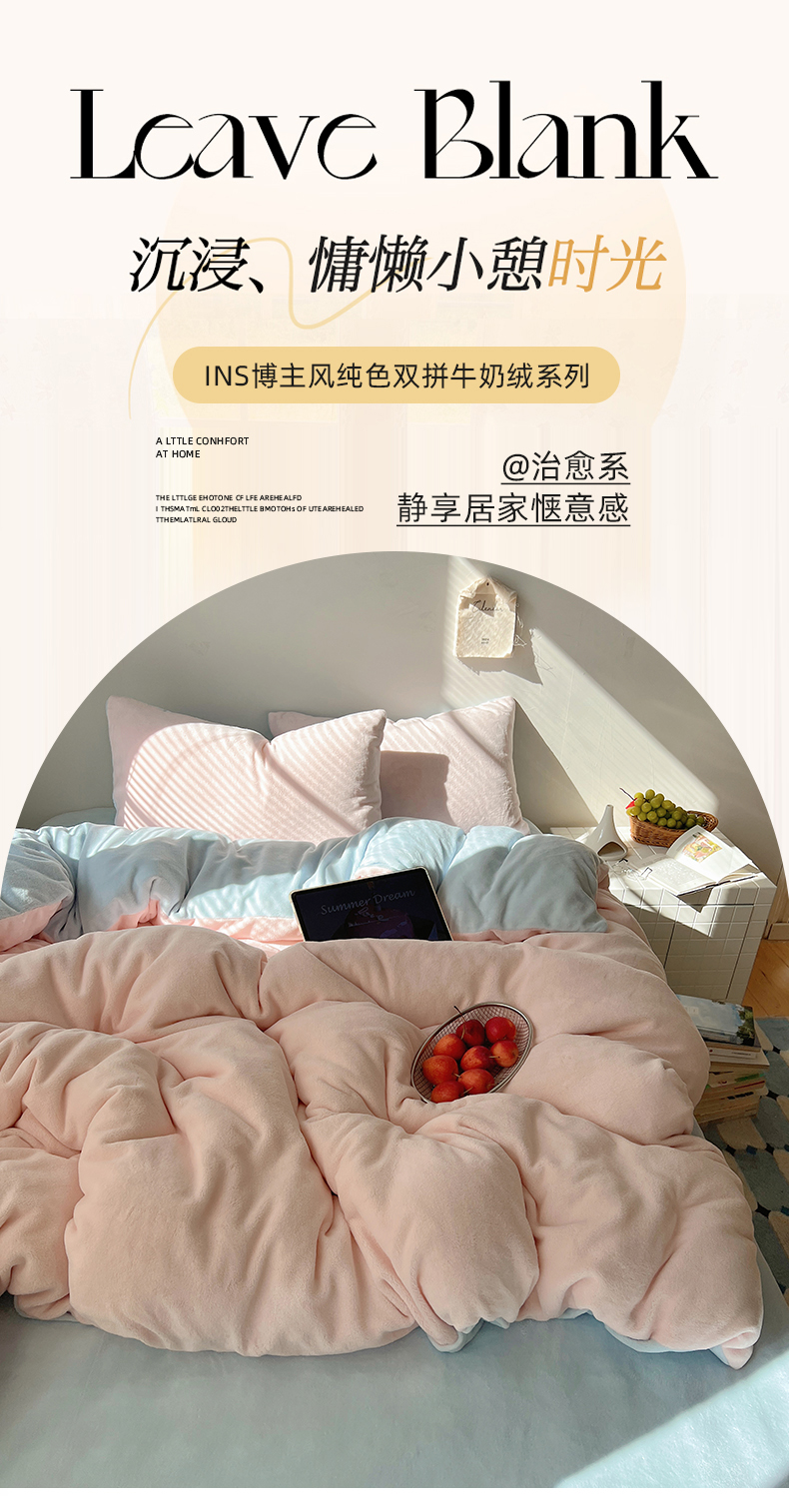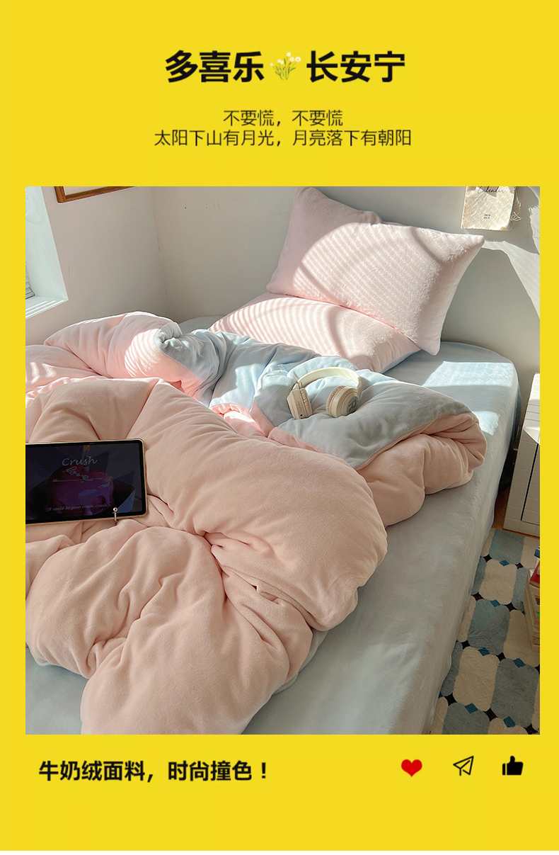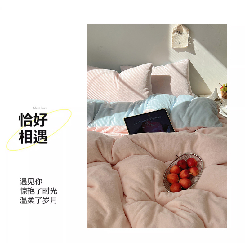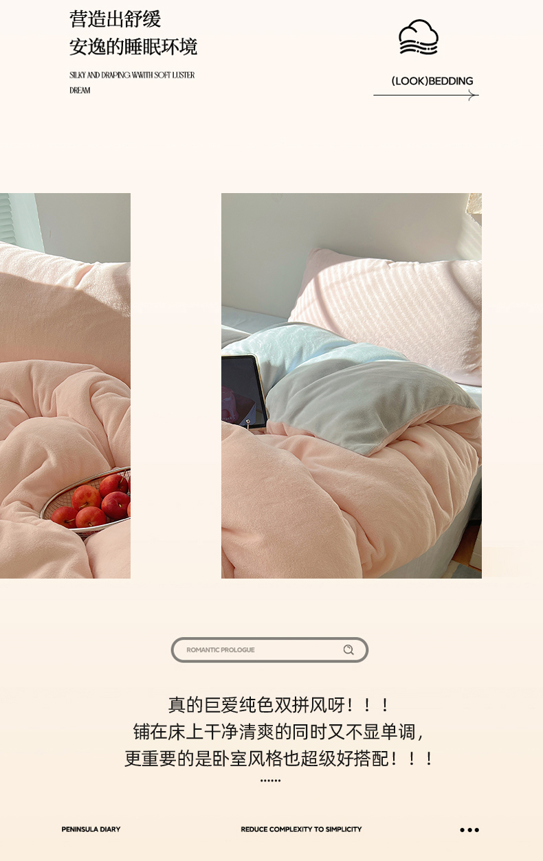 当前位置: 91家纺网 > 商品网购 > 床品套件 > 四件套 > 牛奶绒四件套 > 六巷胡同 2025新款INS博主风纯色双拼A类牛奶绒四件套 粉椰蓝海
