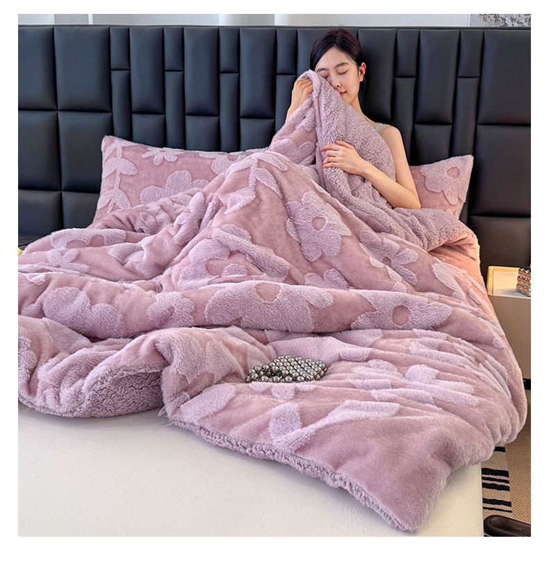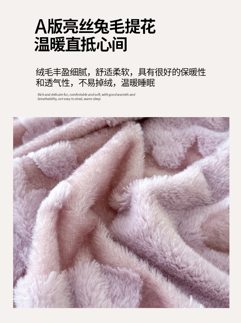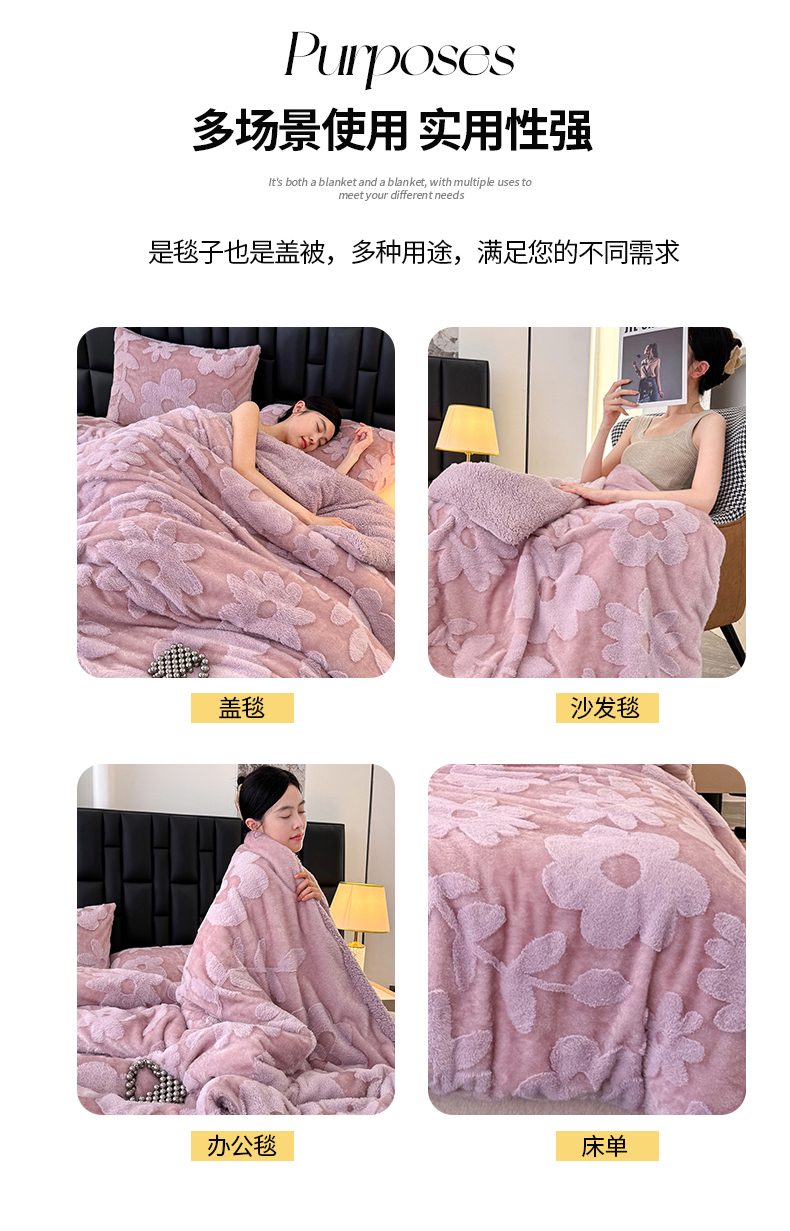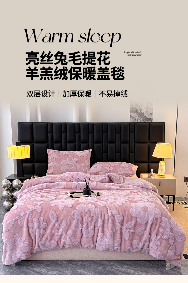 商品名称:枋梢家纺 2025新款亮丝兔毛绒兔毛提花暖居花漾羊羔绒 双层加厚保暖盖毯 居家午睡保暖毯 花漾-紫色
