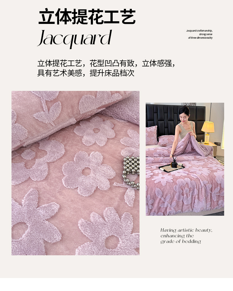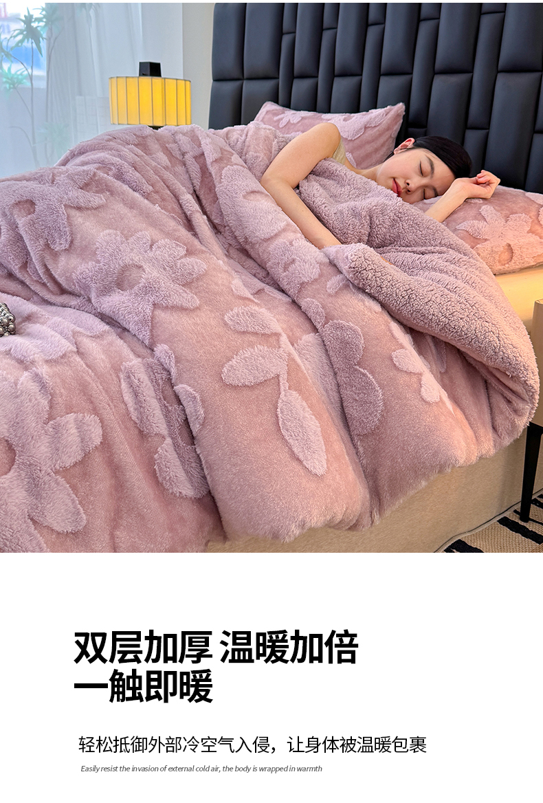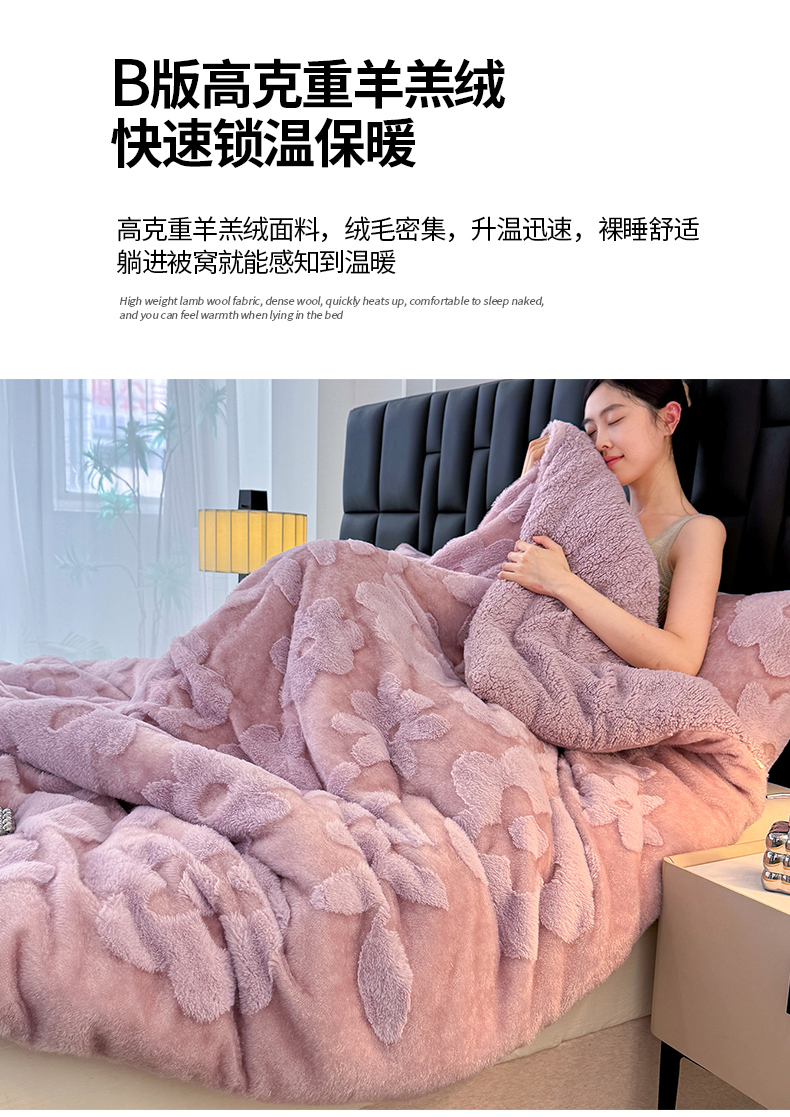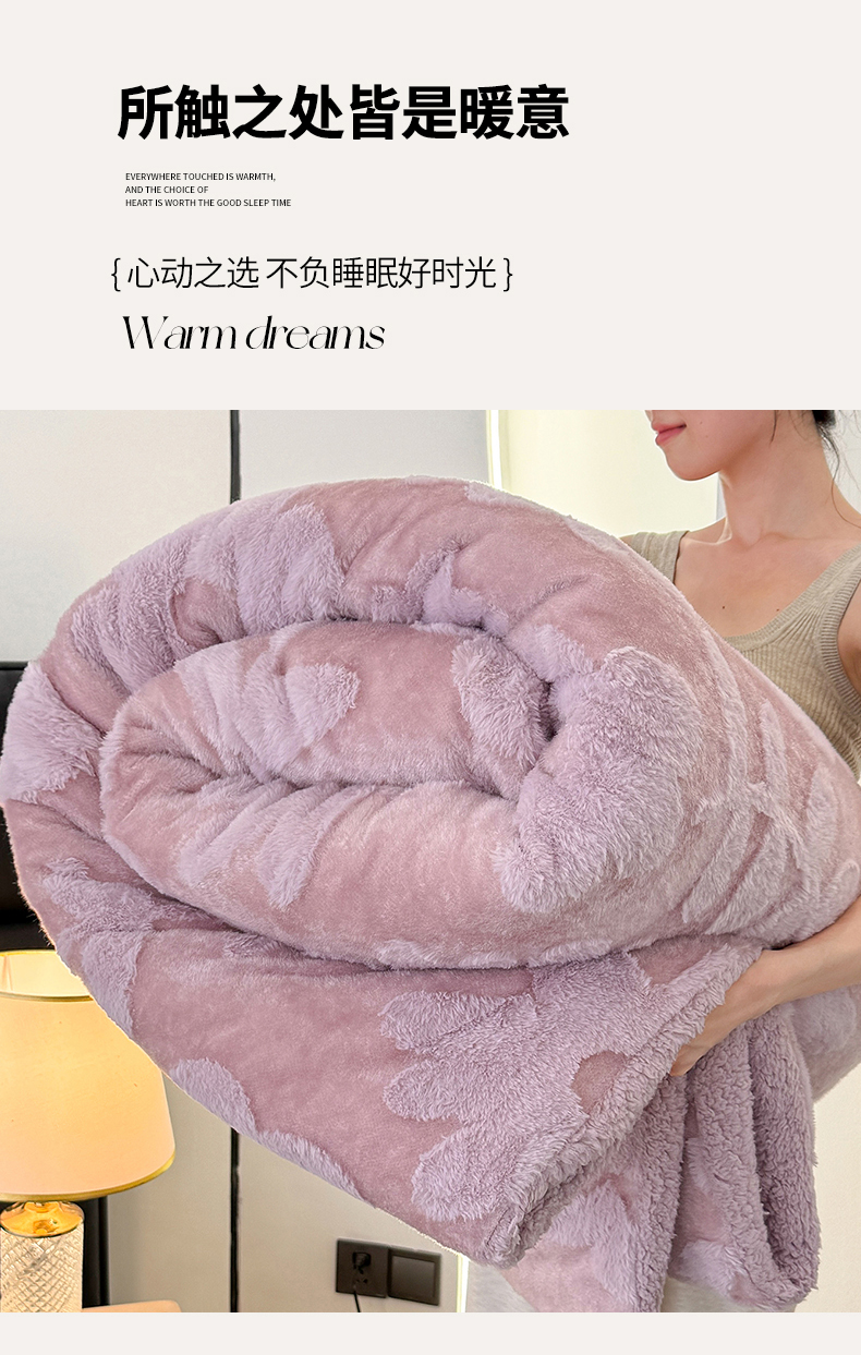 商品名称:枋梢家纺 2025新款亮丝兔毛绒兔毛提花暖居花漾羊羔绒 双层加厚保暖盖毯 居家午睡保暖毯 花漾-紫色