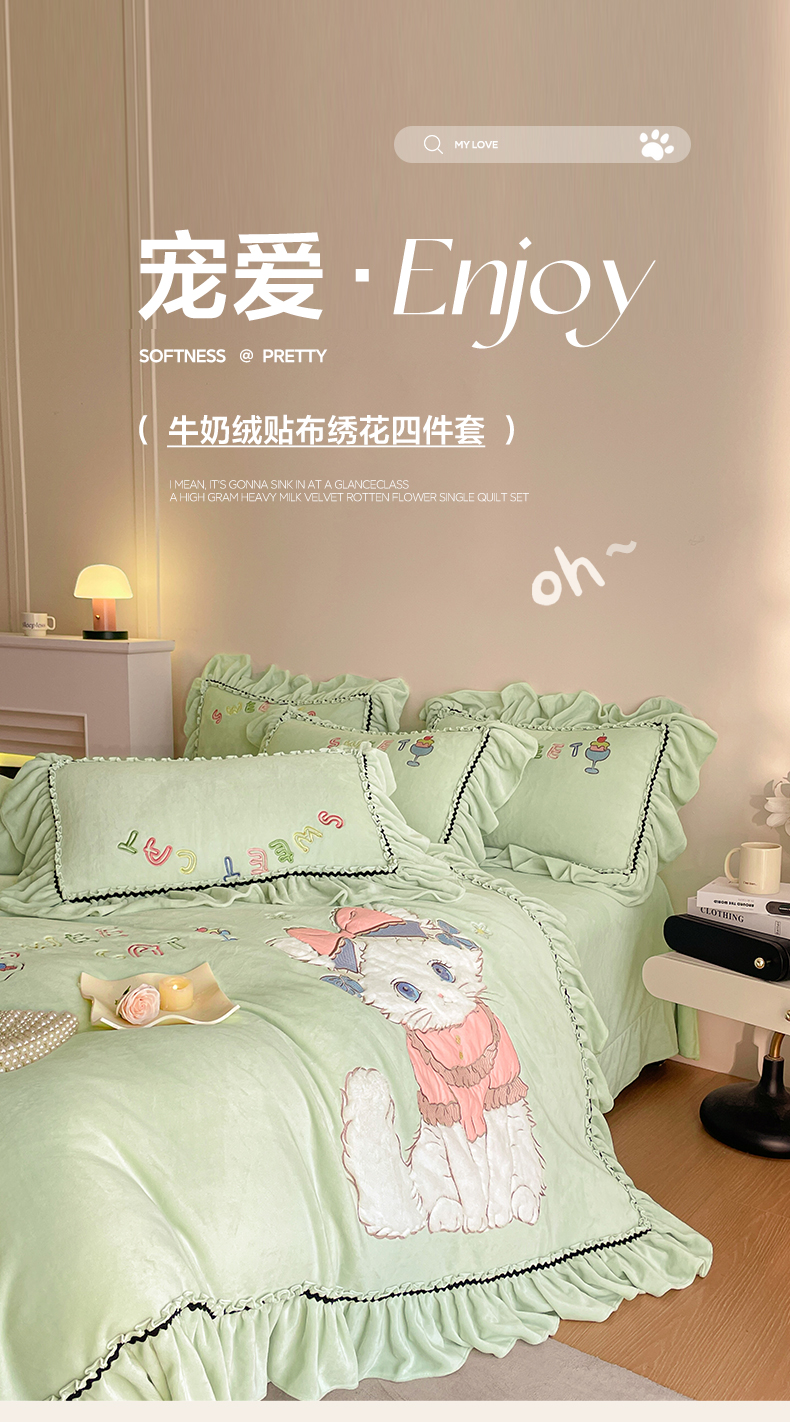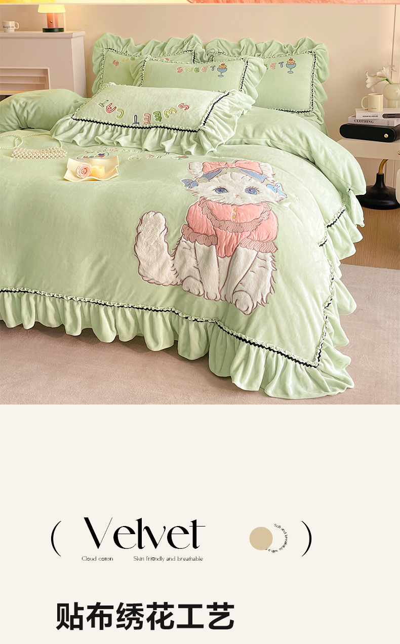 商品名称:畅畅家纺 2025新款轻奢高档冬季工艺款牛奶绒毛巾绣床单床笠四件套 蜜语-青柠绿