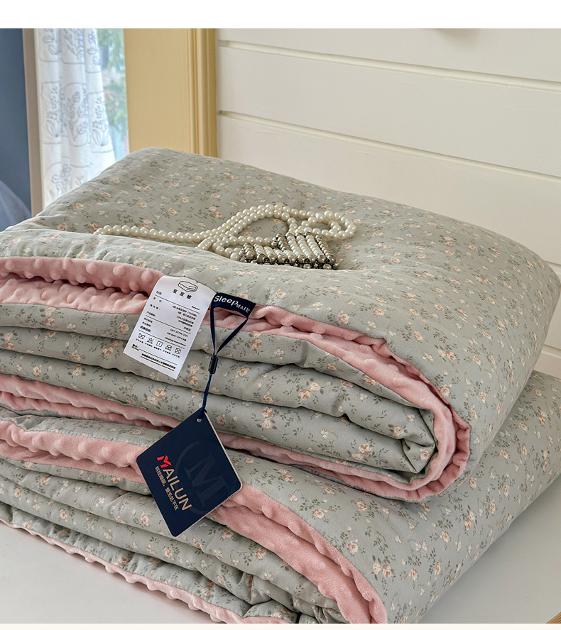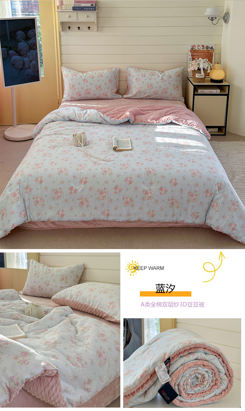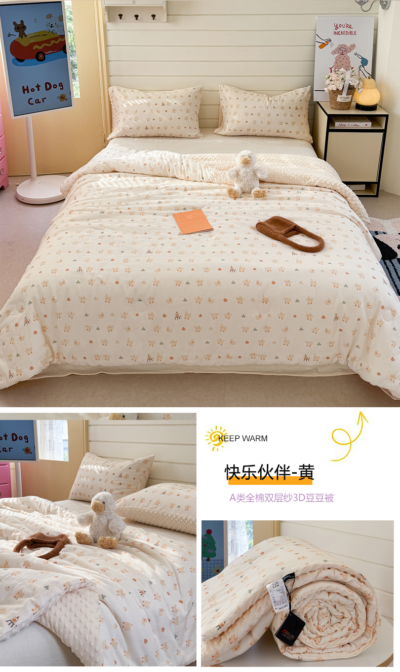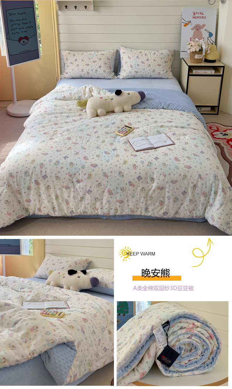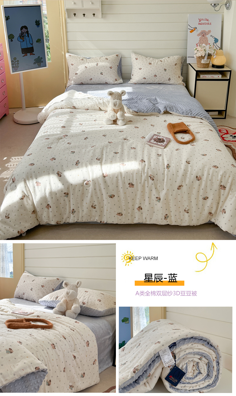 • 91家纺网 家纺一手货源 找家纺 麦伦家居 2025新款全棉双层纱3D豆豆被系列被子被芯(可配四件套) 星奈绿