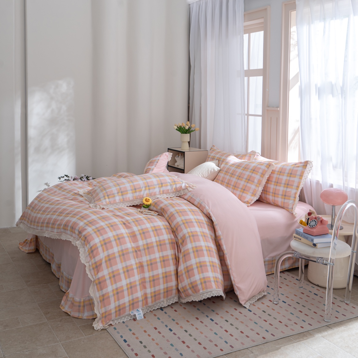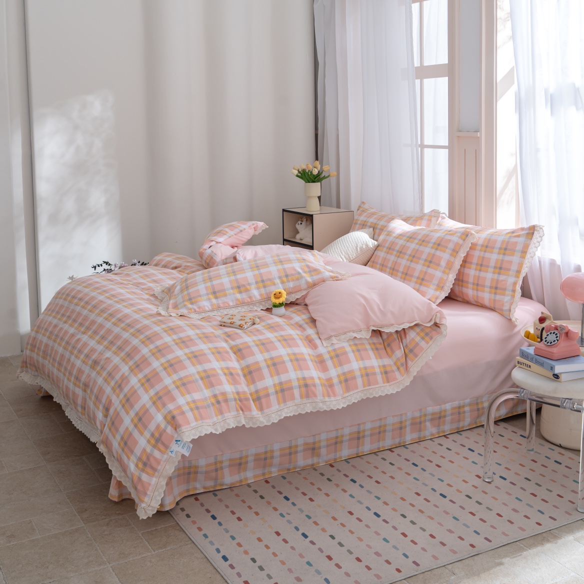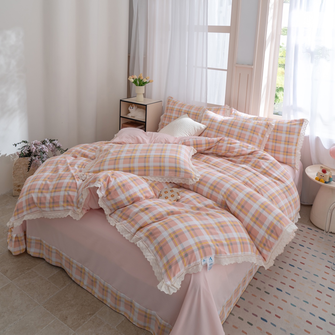 商品名称:玖琳家纺 2025新款云朵水洗棉皱皱纱精致花边款四件套 晨曦 粉