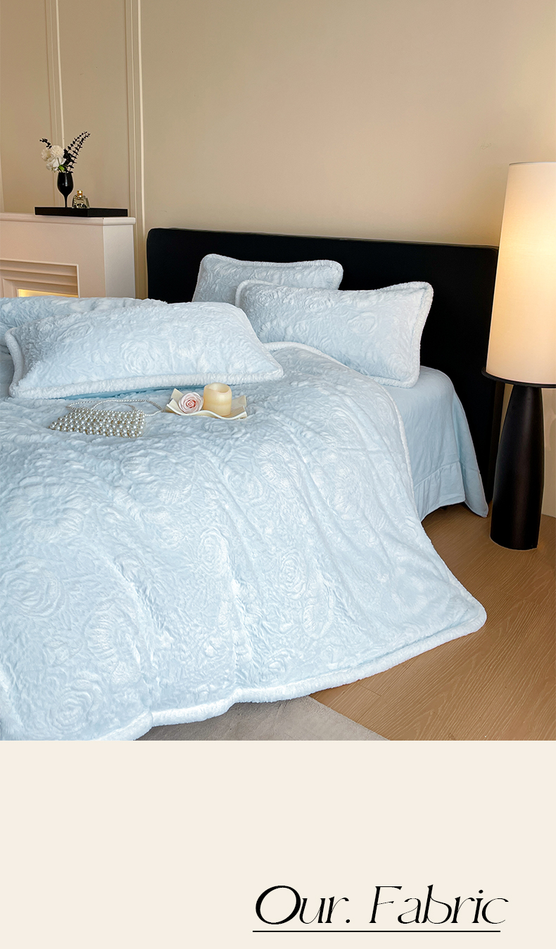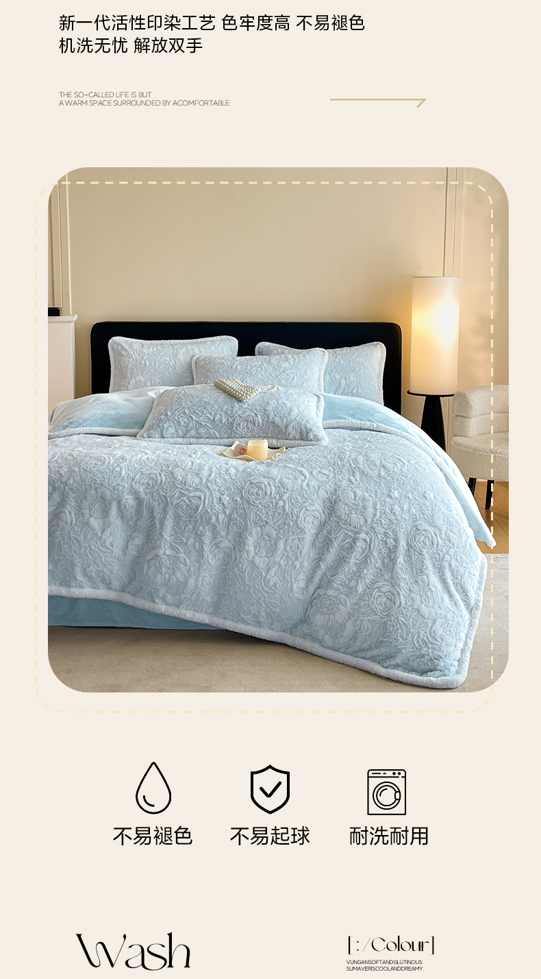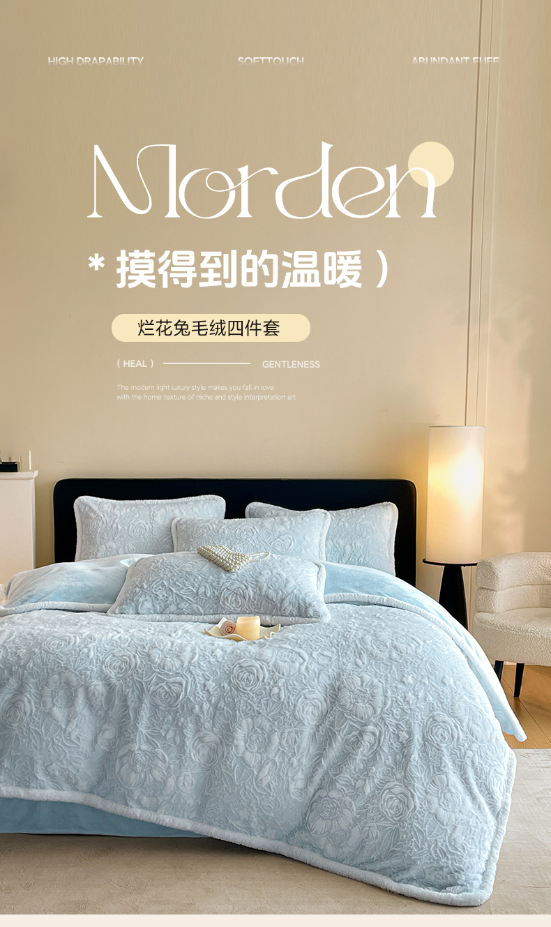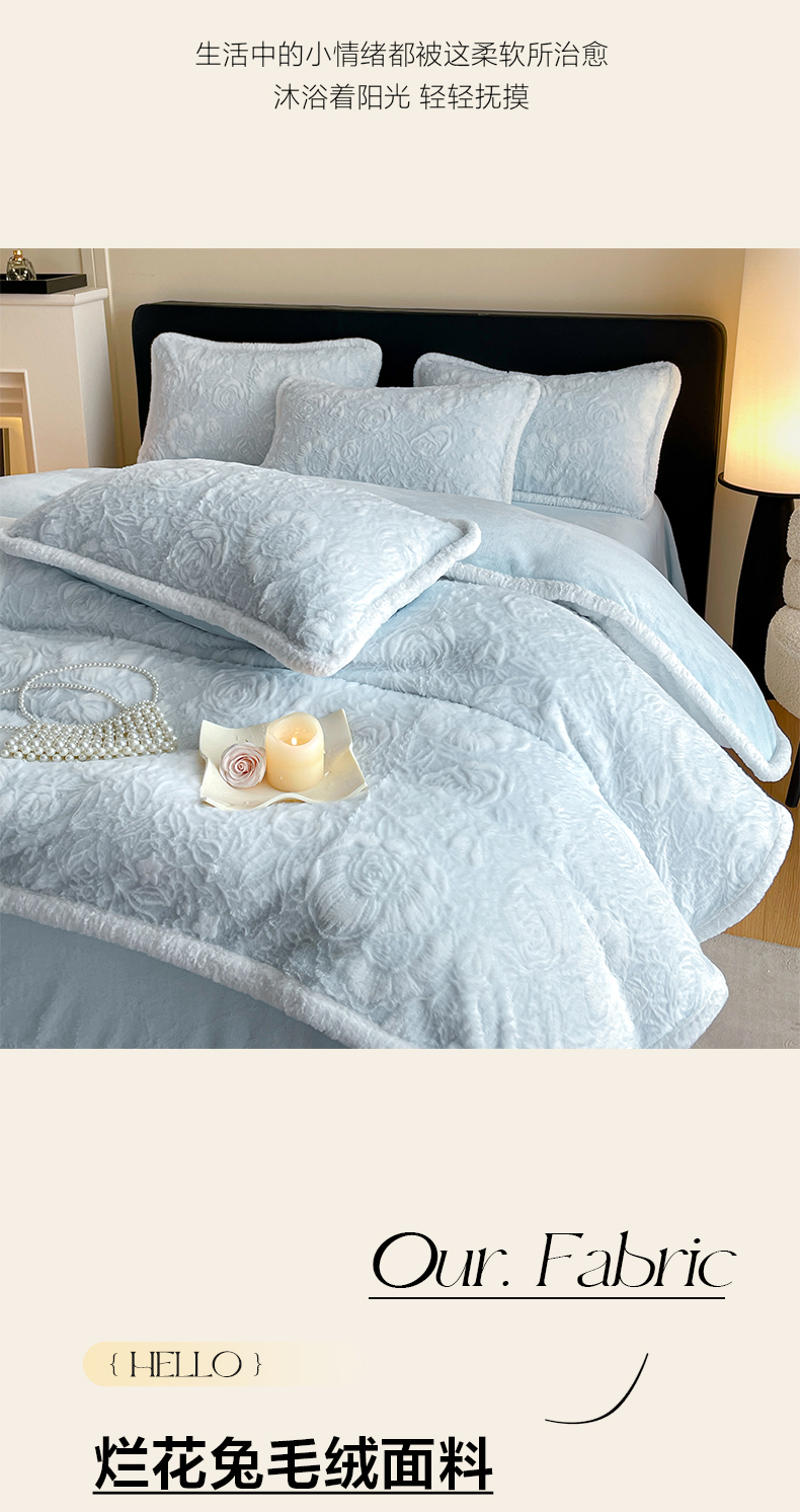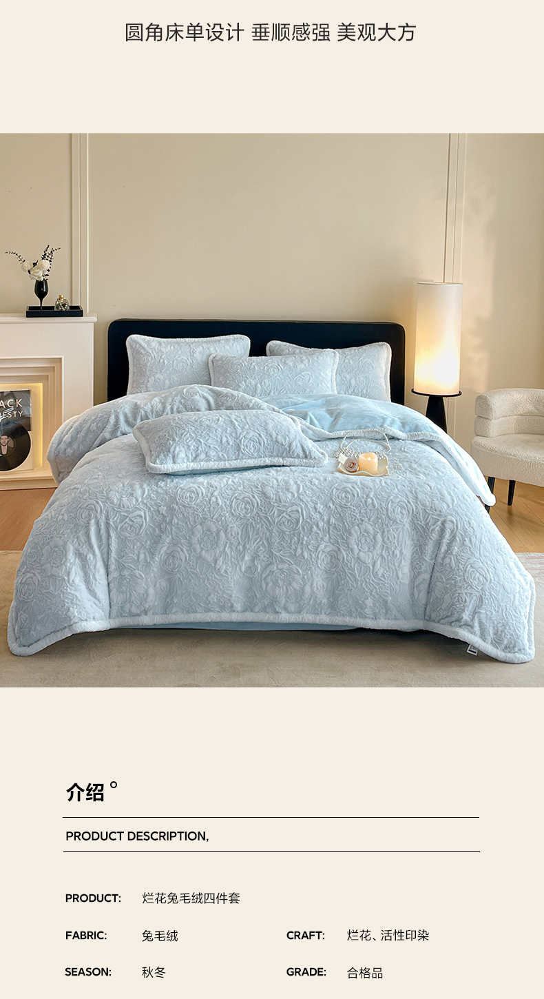 商品名称:民新家纺 2025新款立体烂花兔毛包边款四件套 经典玫瑰-浅蓝
