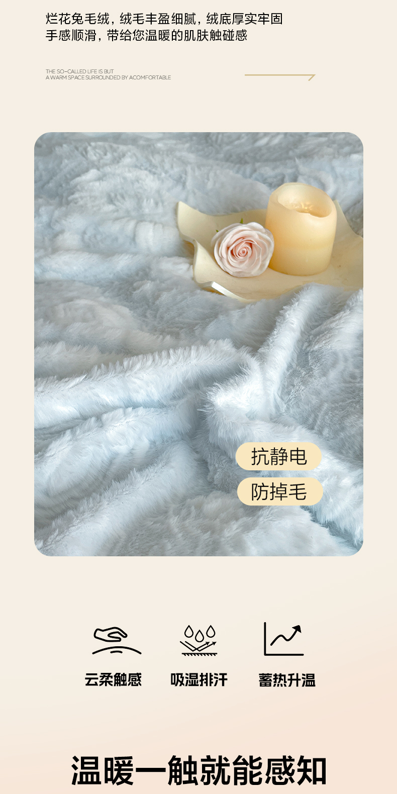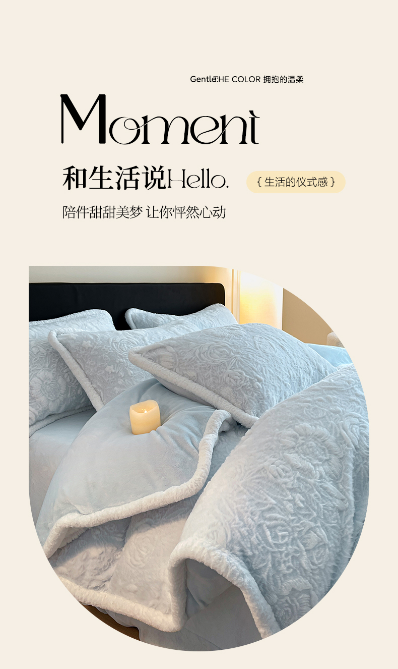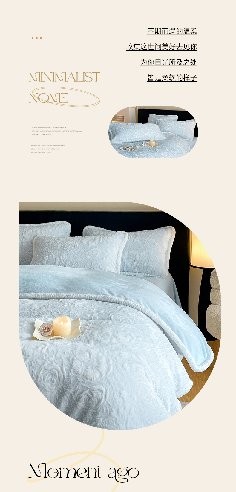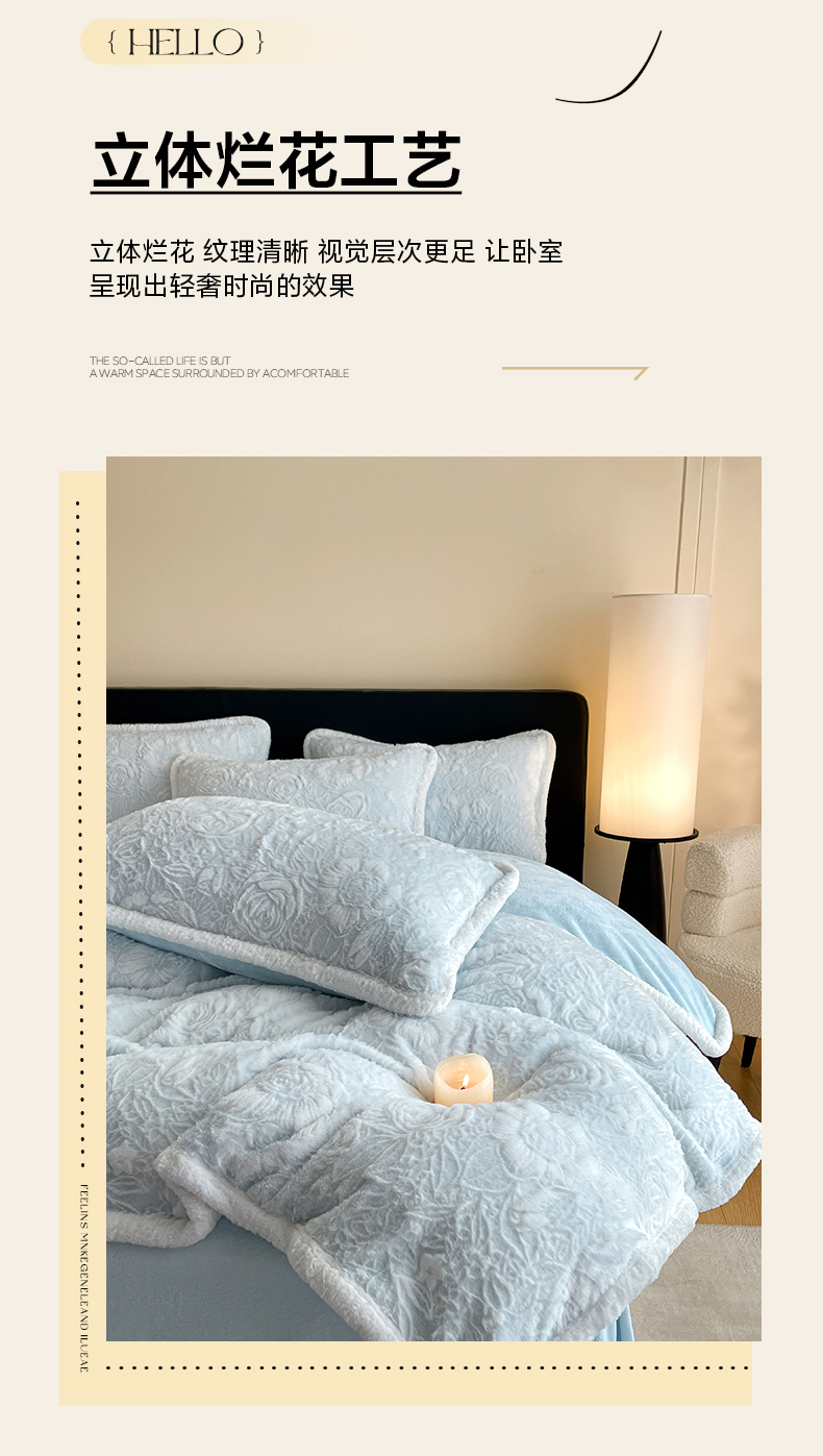 商品名称:民新家纺 2025新款立体烂花兔毛包边款四件套 经典玫瑰-浅蓝