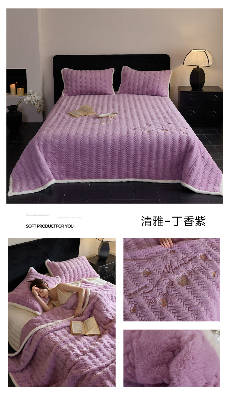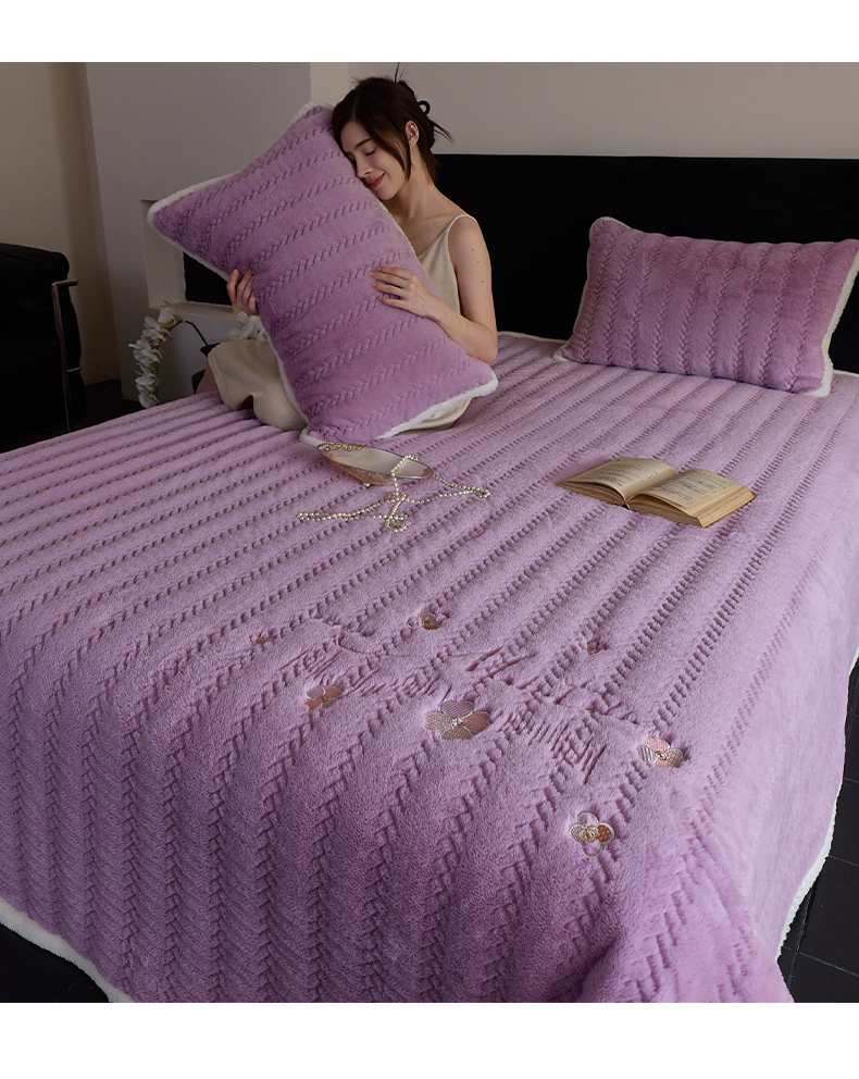 商品名称:鑫喜莱家纺 2025新款A版兔绒B版牛奶绒床盖绣花系列单件床褥垫软床垫床盖(三件套重量8.5斤) 典雅-丁香紫
