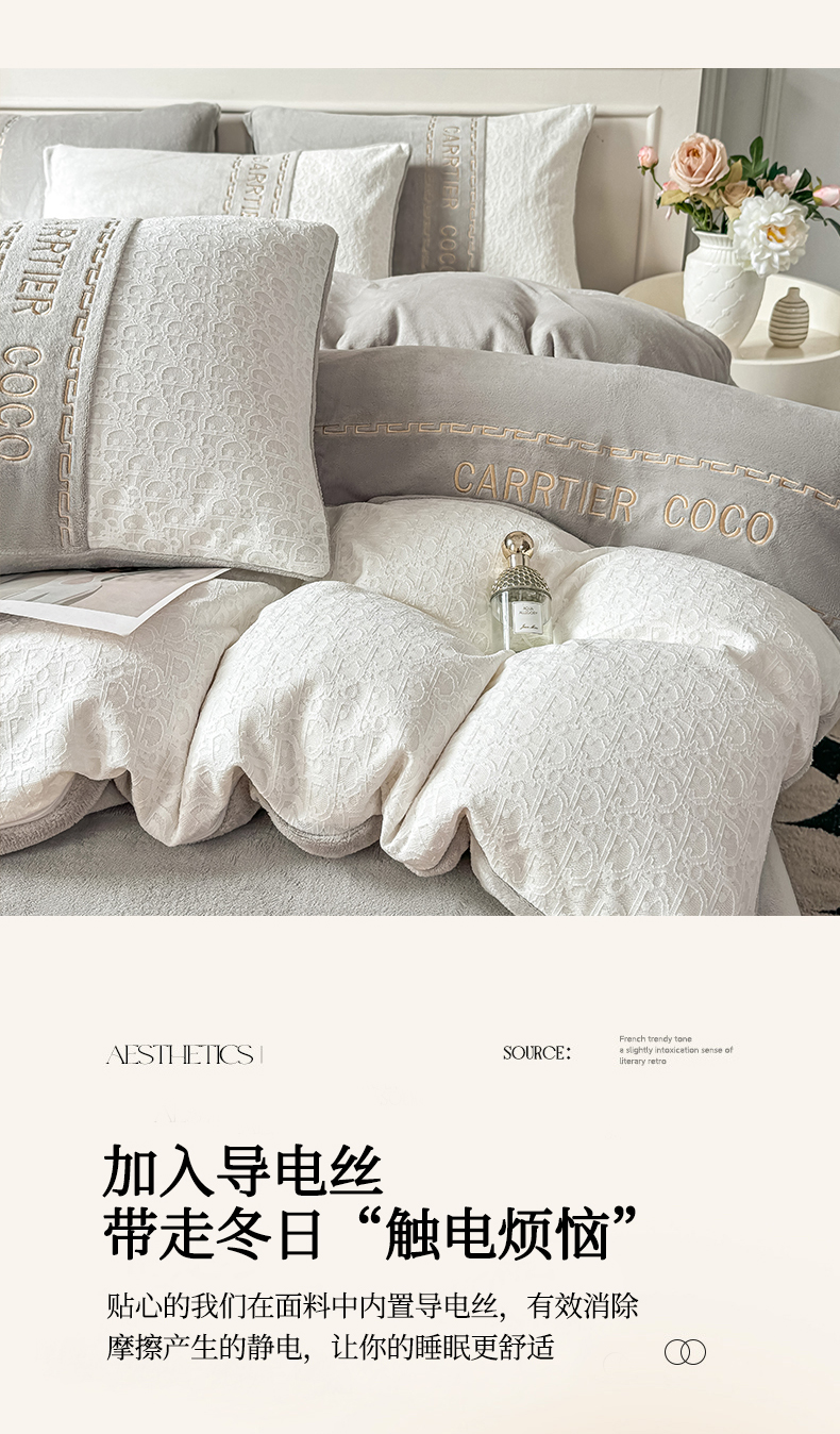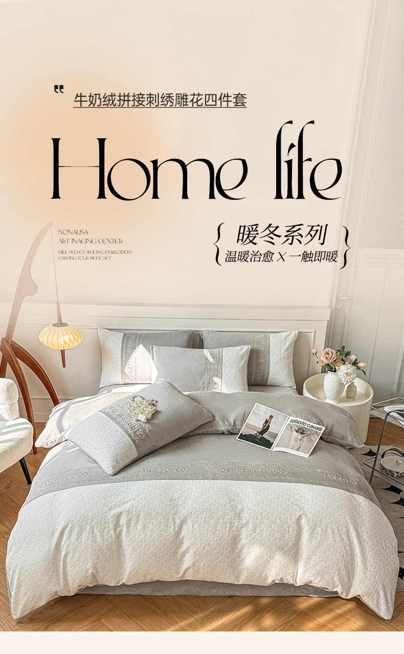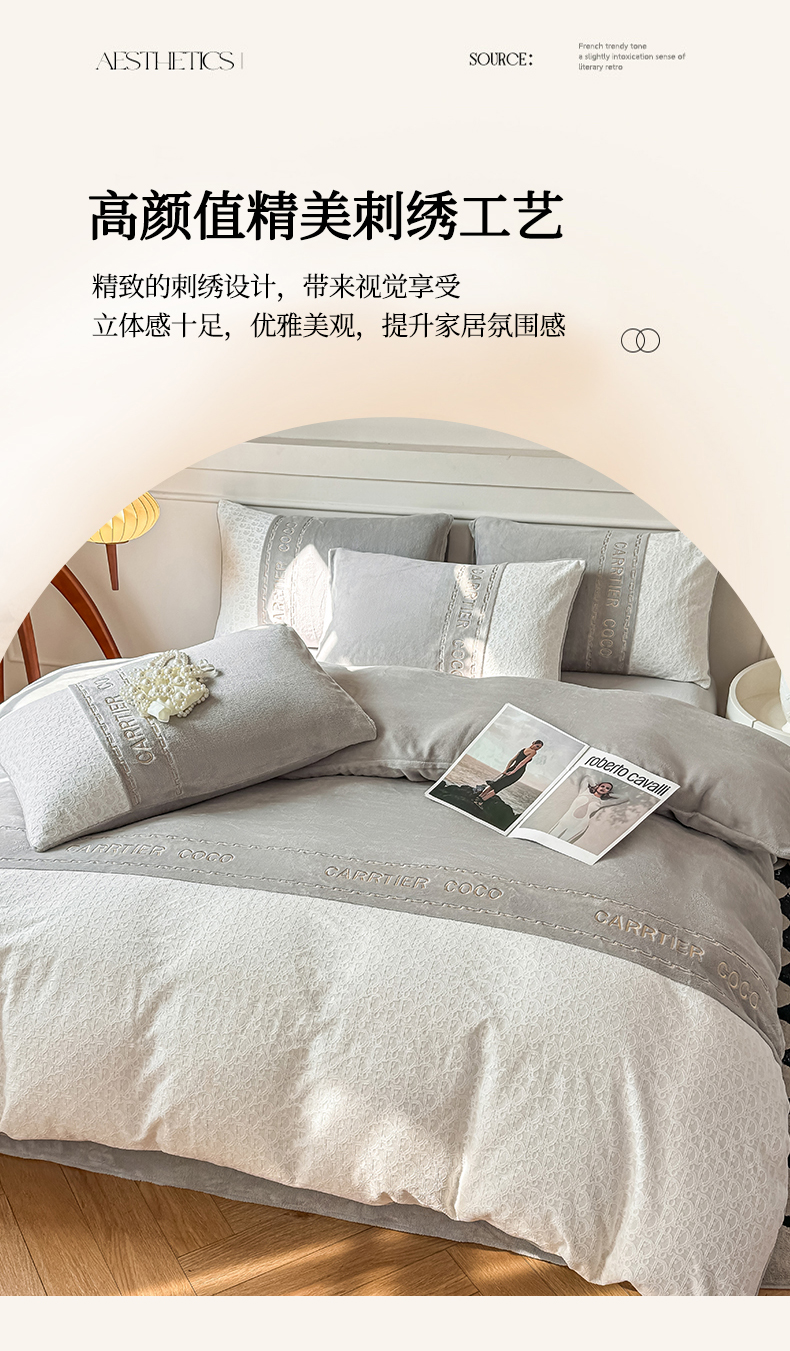 当前位置: 91家纺网 > 商品网购 > 床品套件 > 四件套 > 牛奶绒四件套 > 灰鲸 2025新款牛奶绒拼接刺绣雕花套件-露娜 露娜-纳多灰