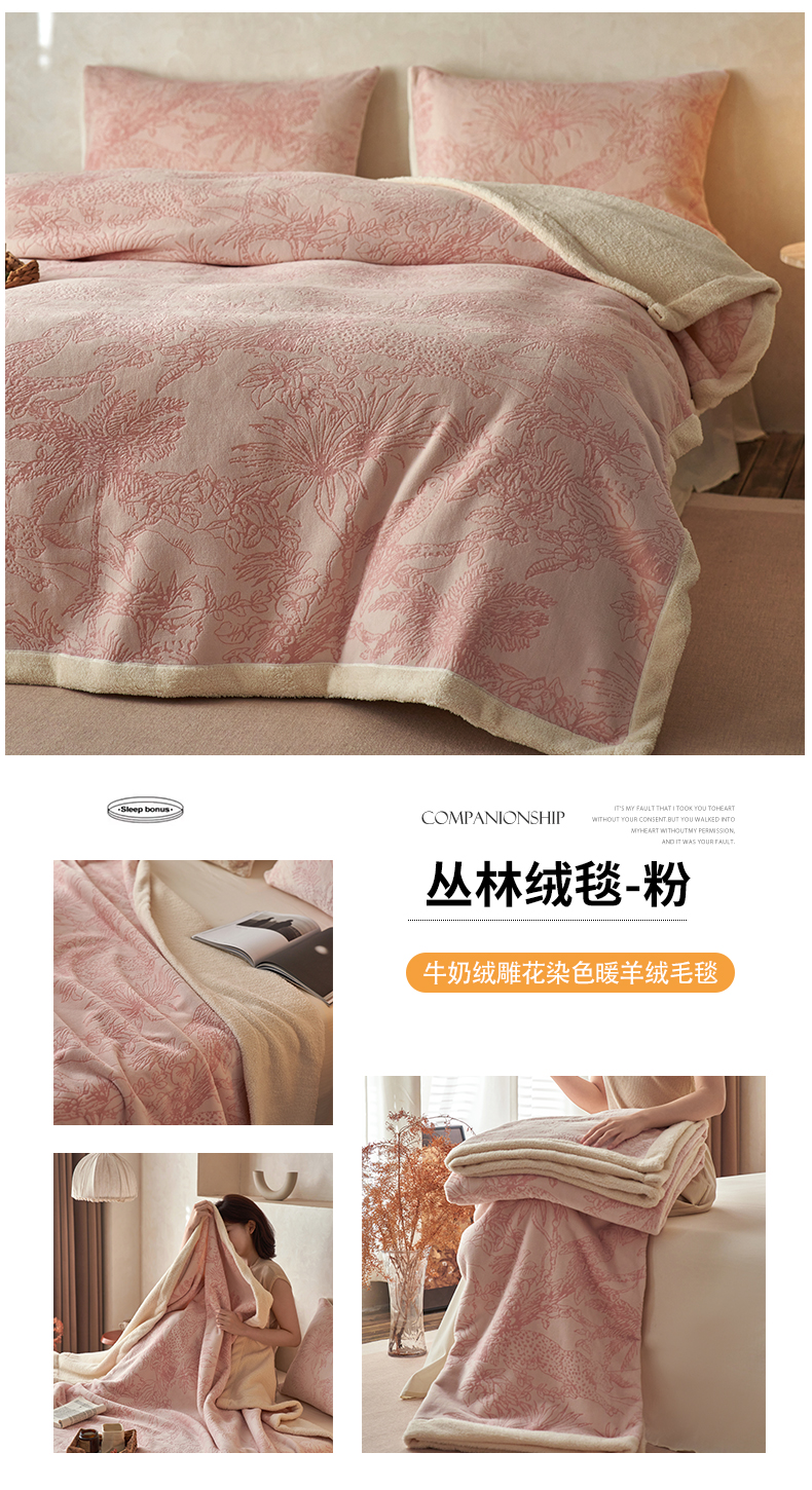 商品名称:宜代光年 2025新款牛奶绒雕花复合毛毯系列 繁花绒毯-粉