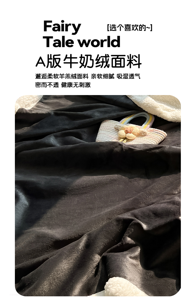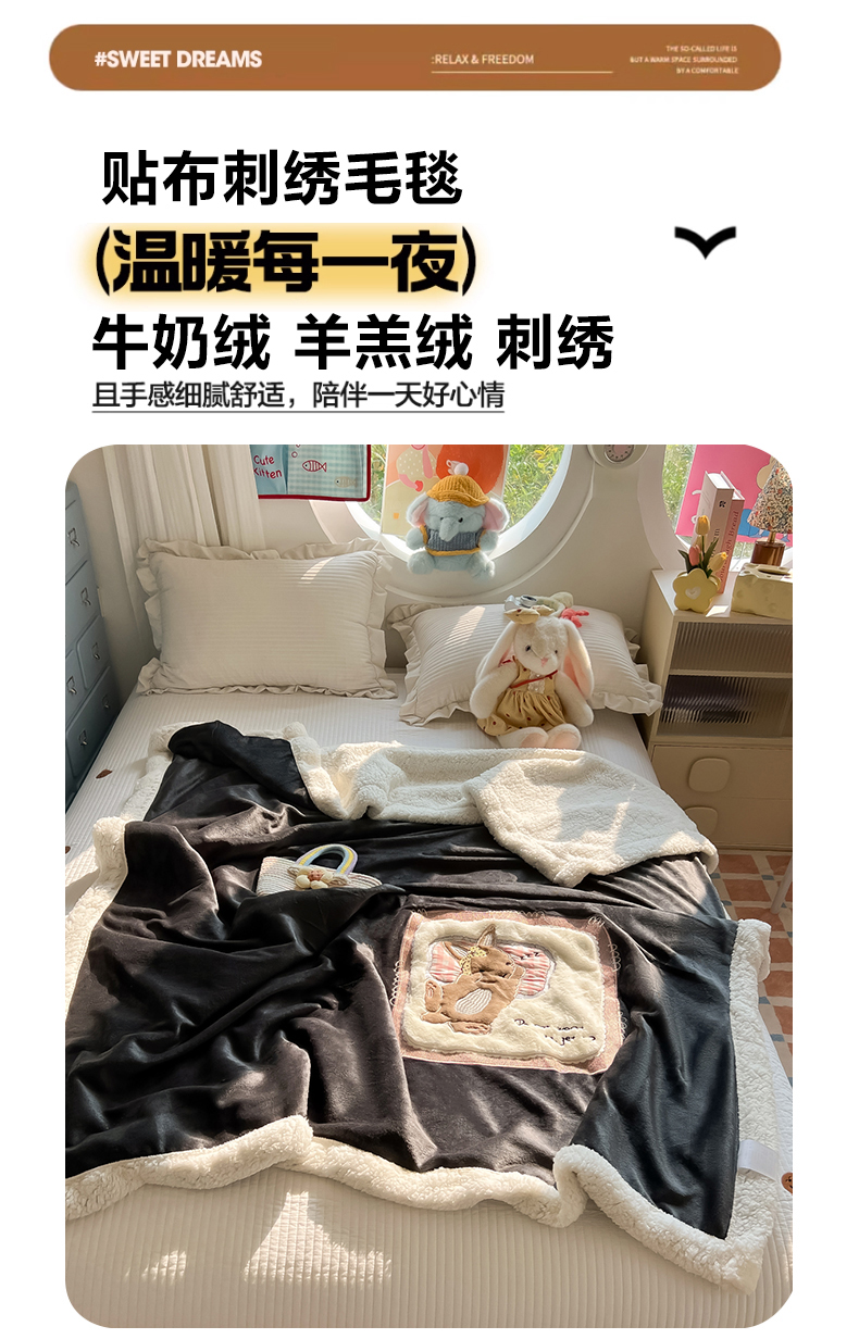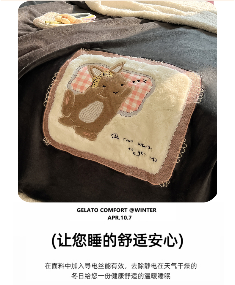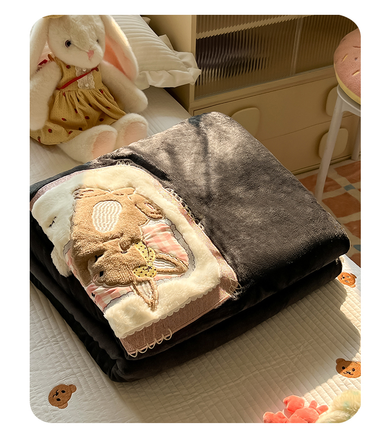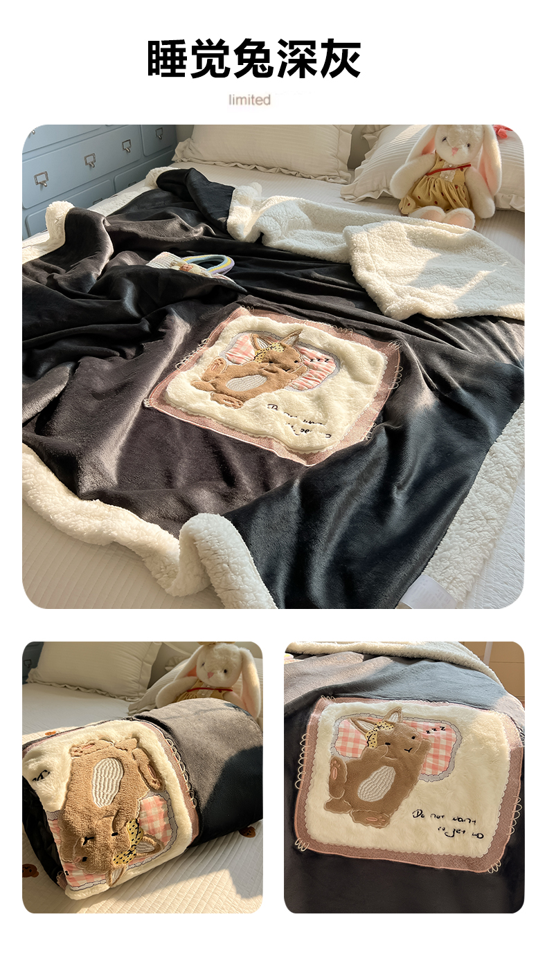 子钦家纺 2025新款秋冬加厚牛奶绒羊羔绒卡通贴布绣包边毛毯(第二波) 睡觉兔-深灰