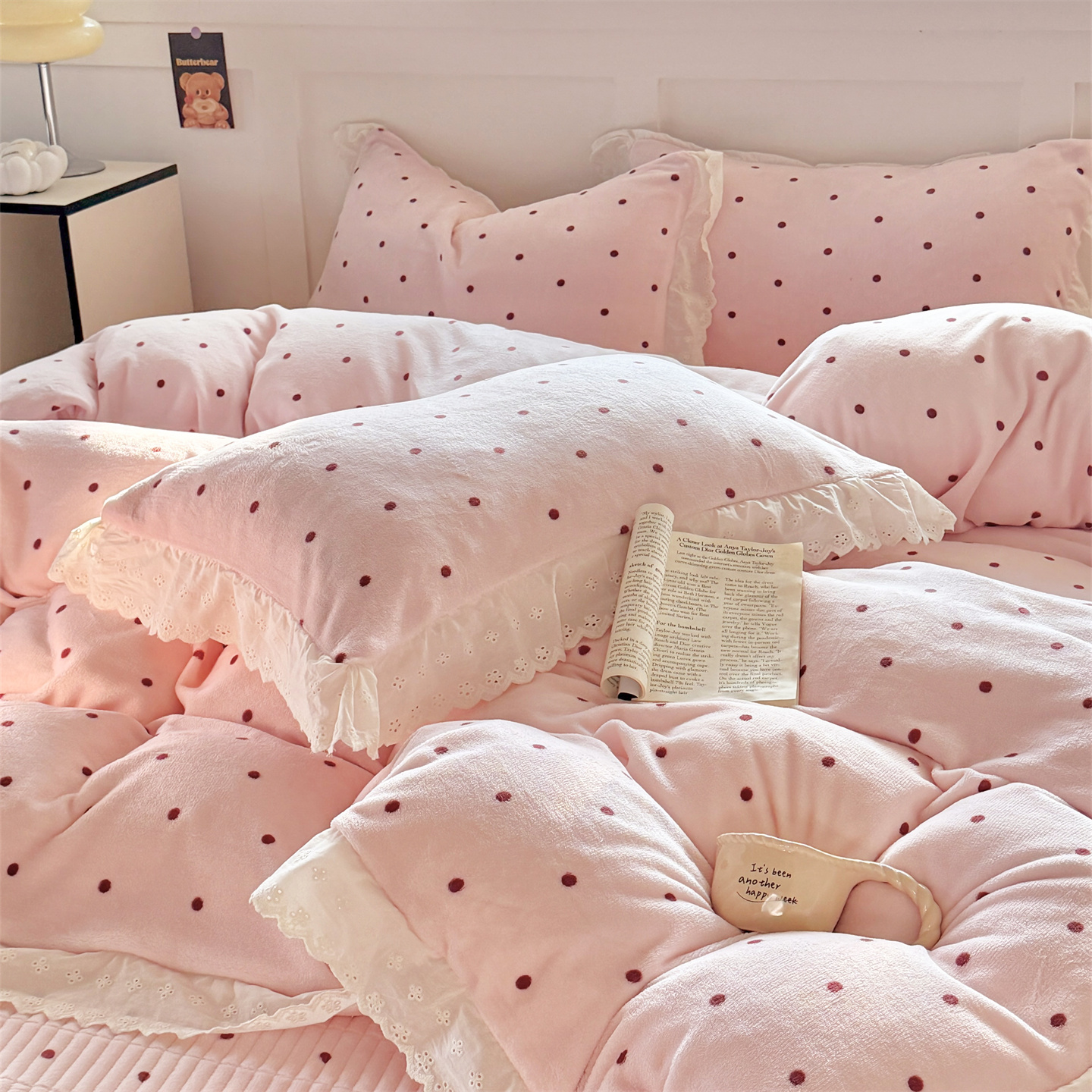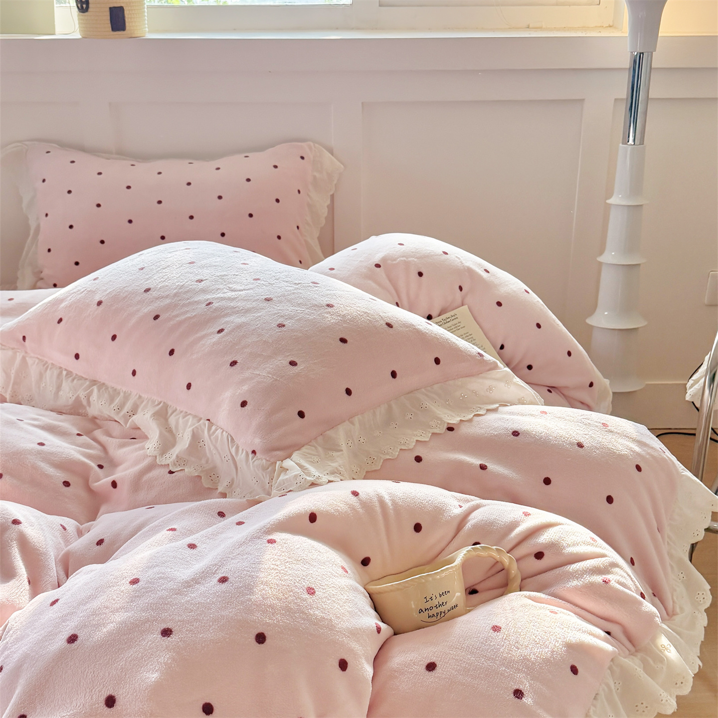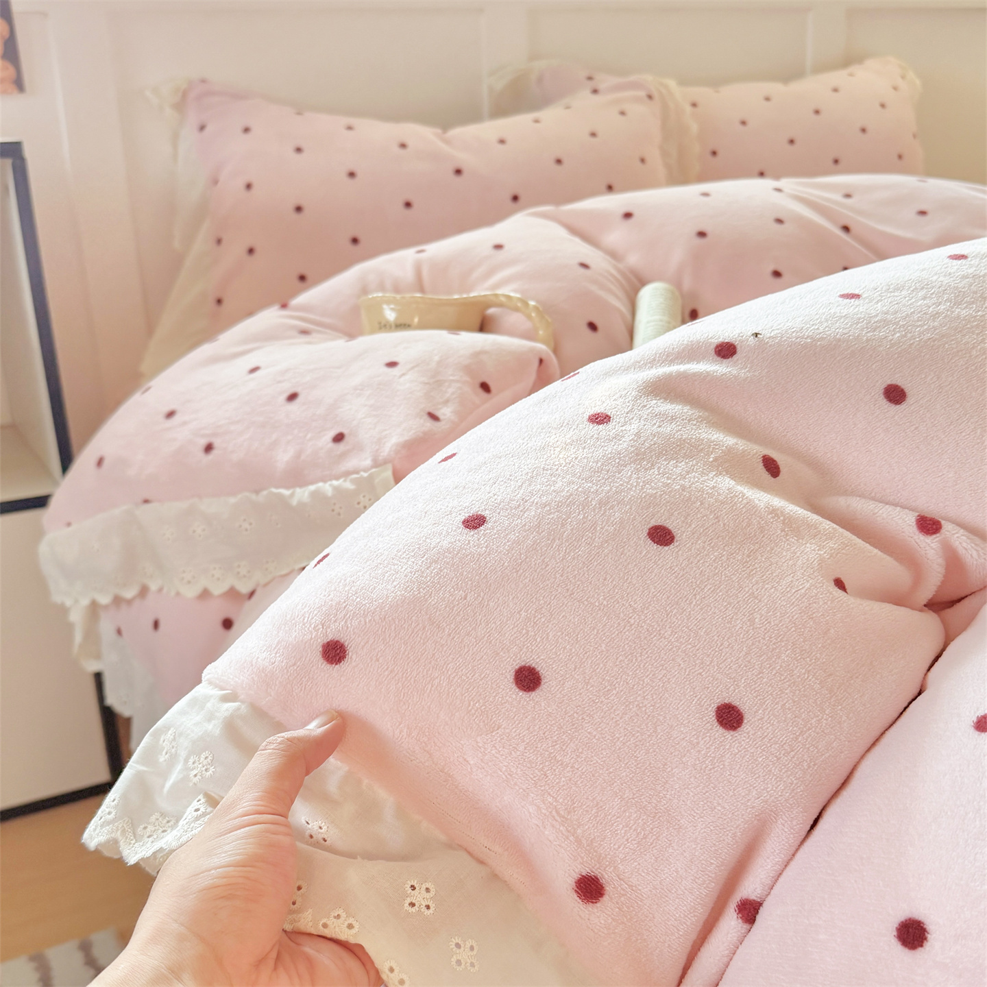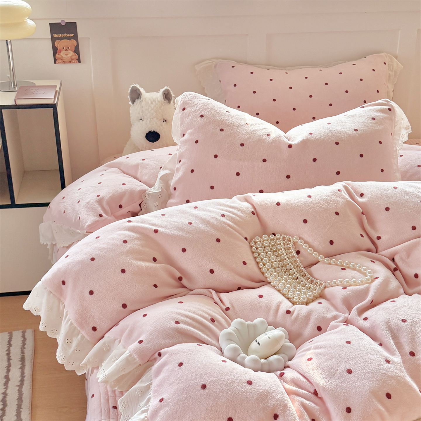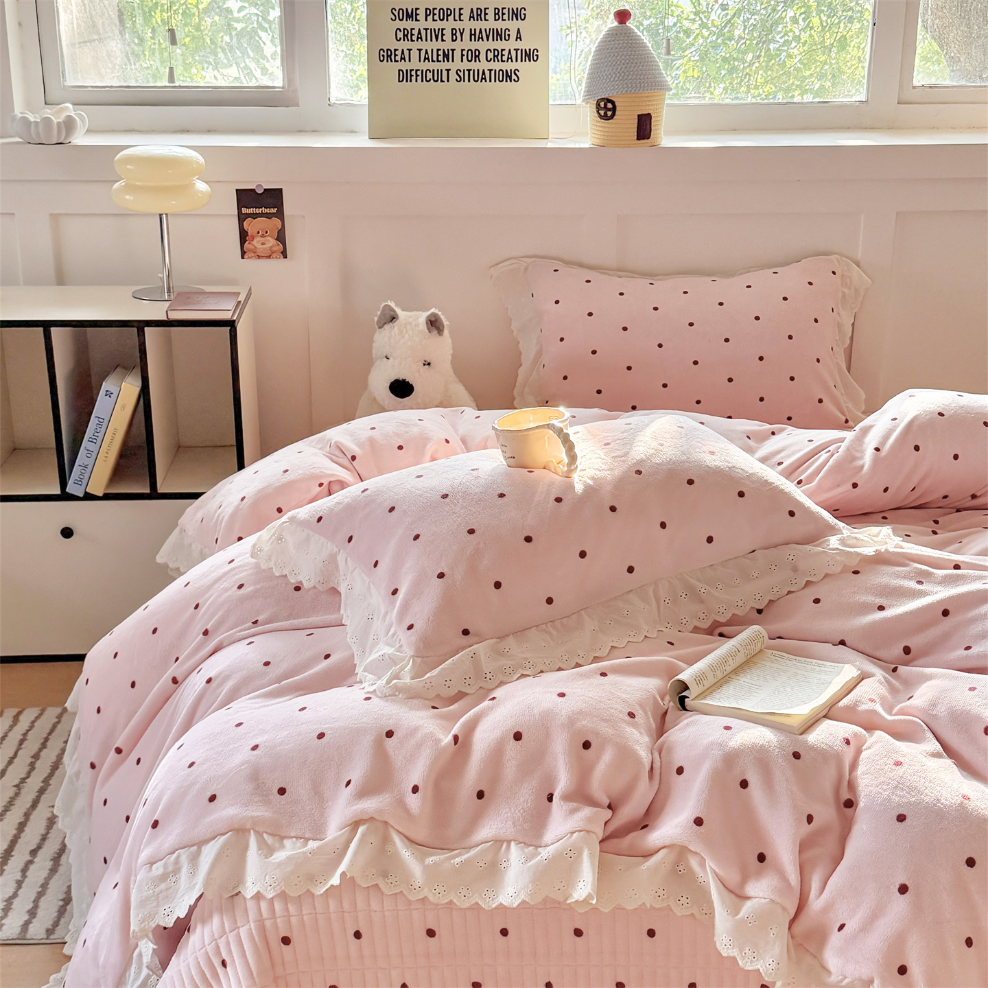 欧尚 2025新款牛奶绒花边床盖四件套 粉点点