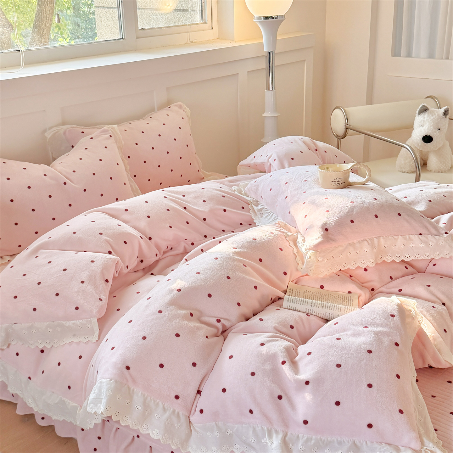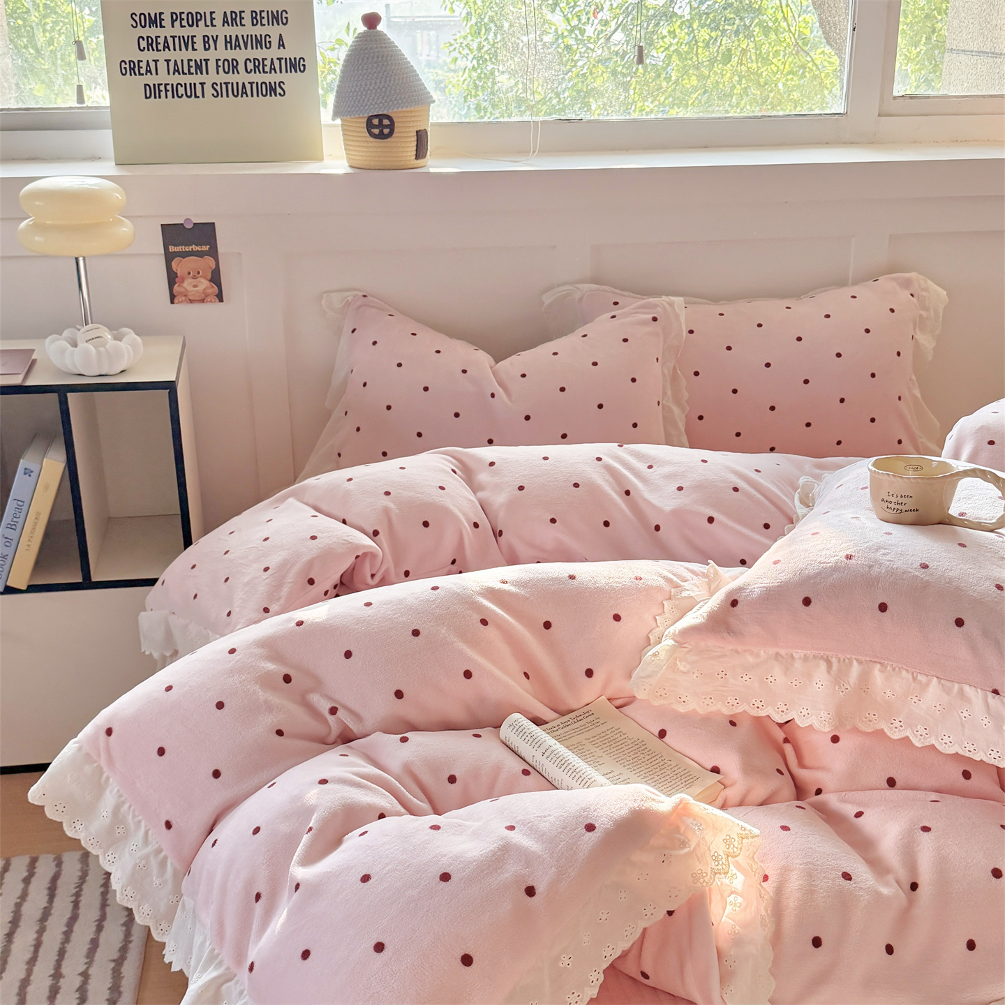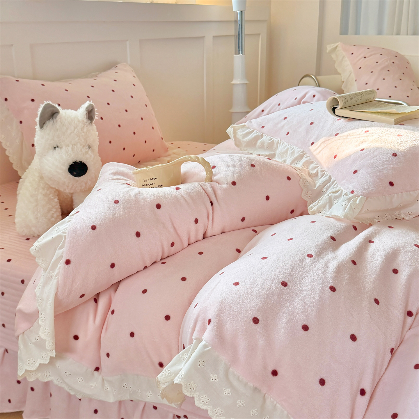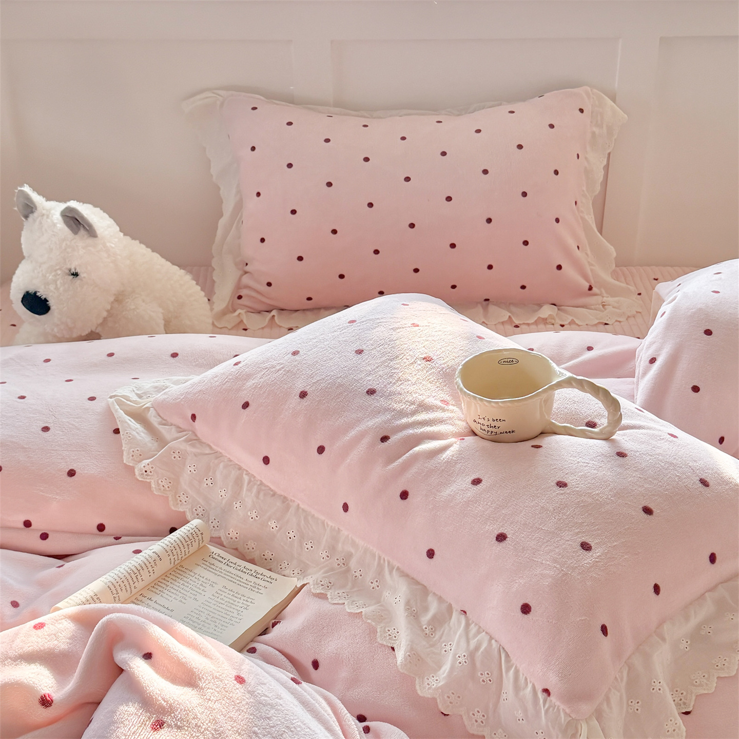 欧尚 2025新款牛奶绒花边床盖四件套 粉点点