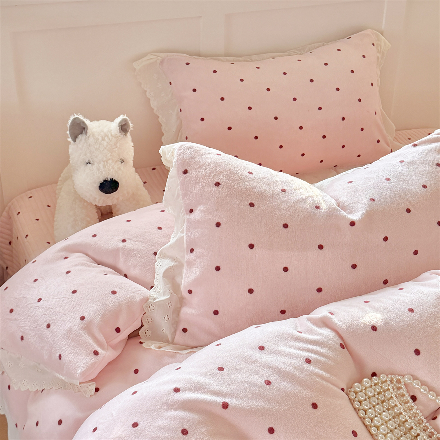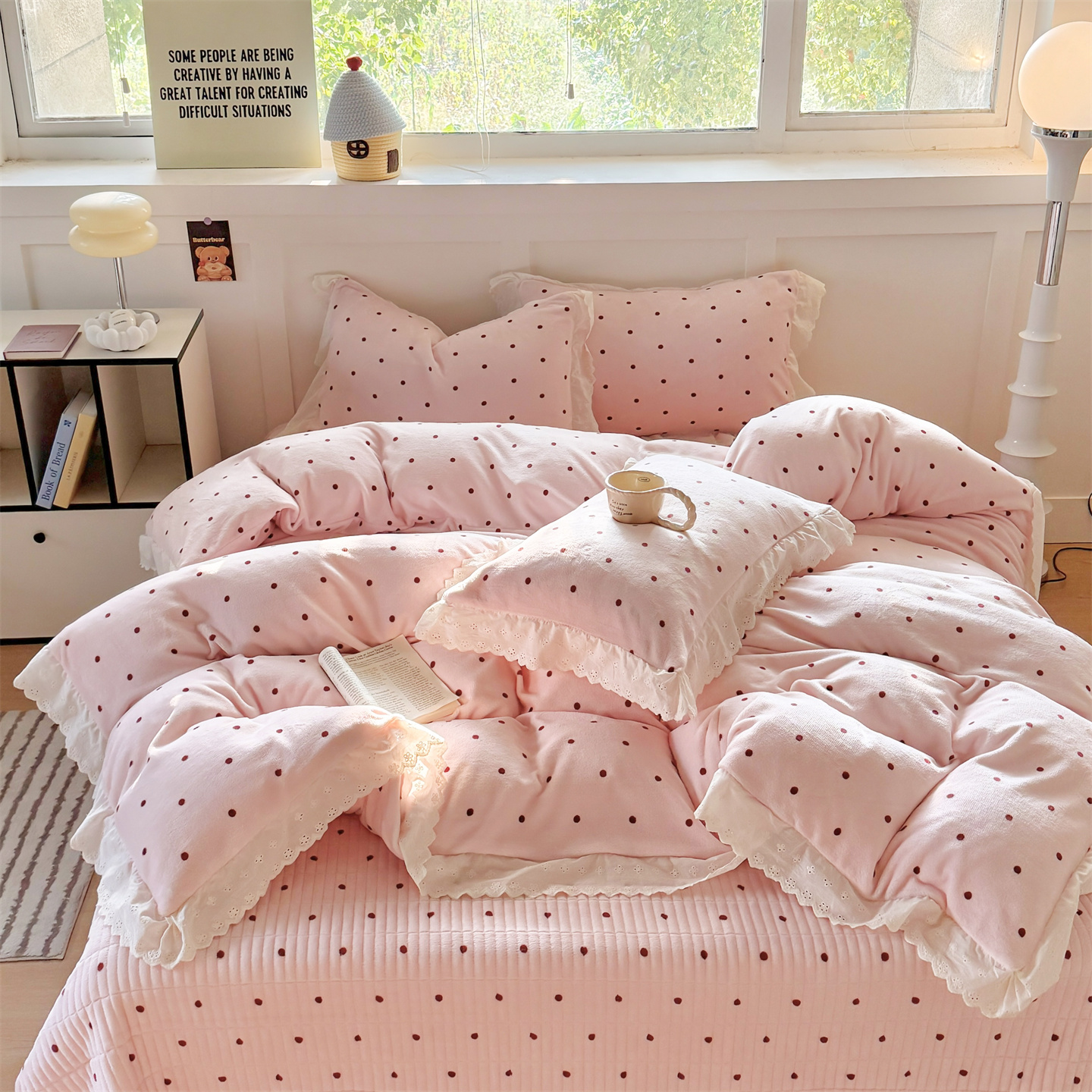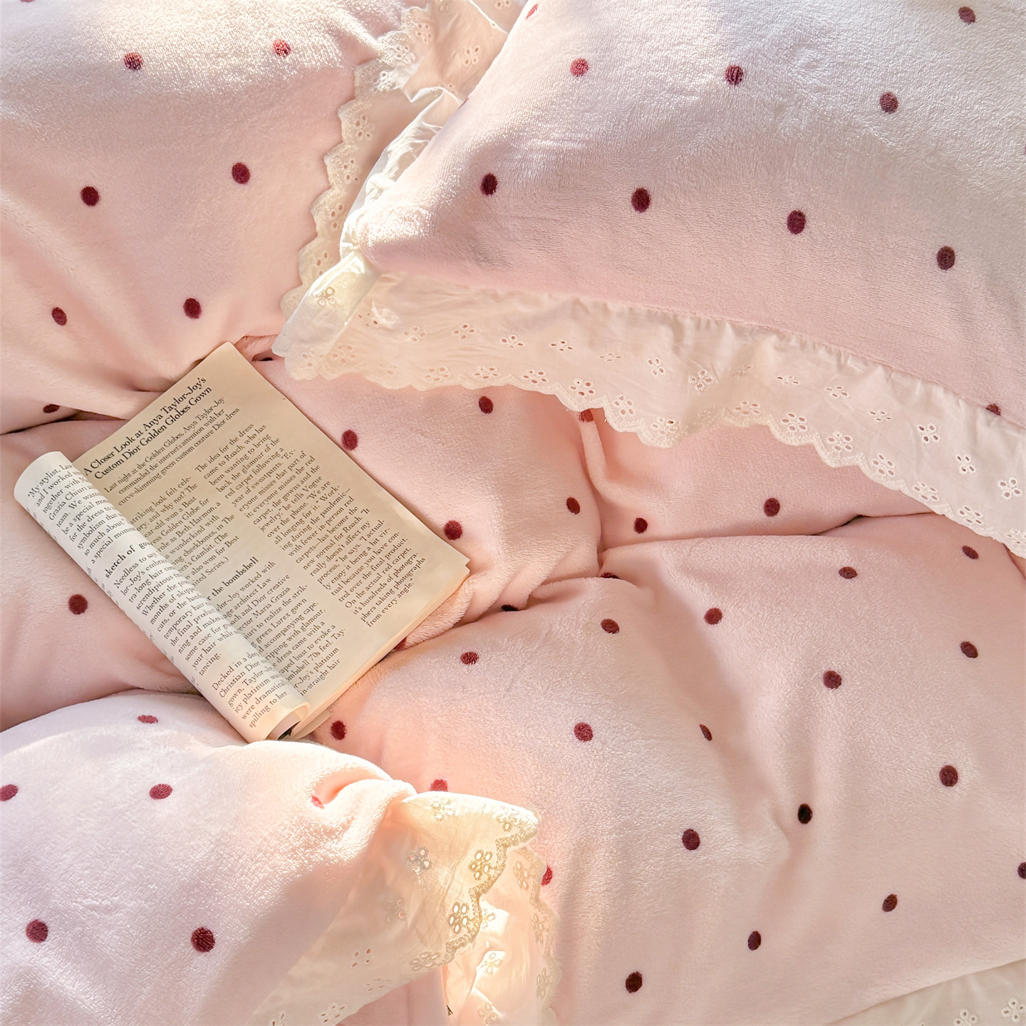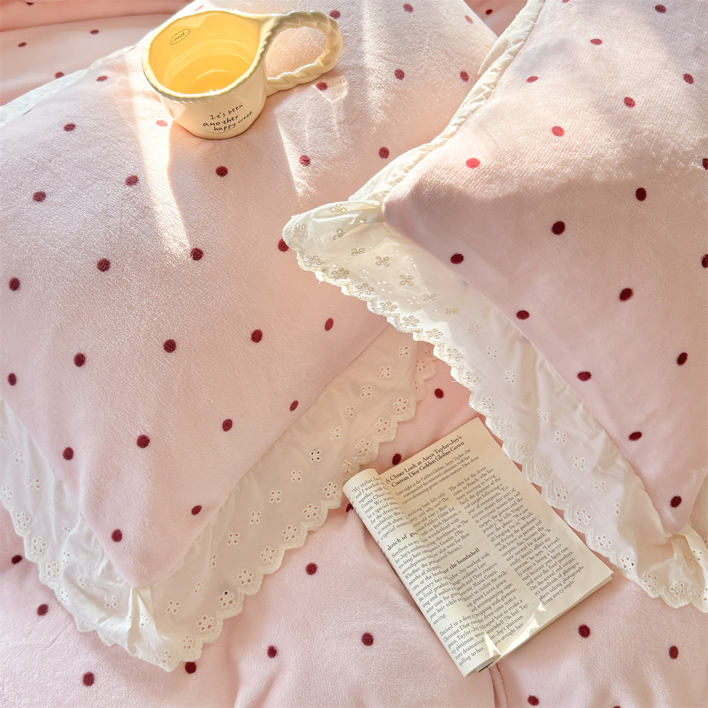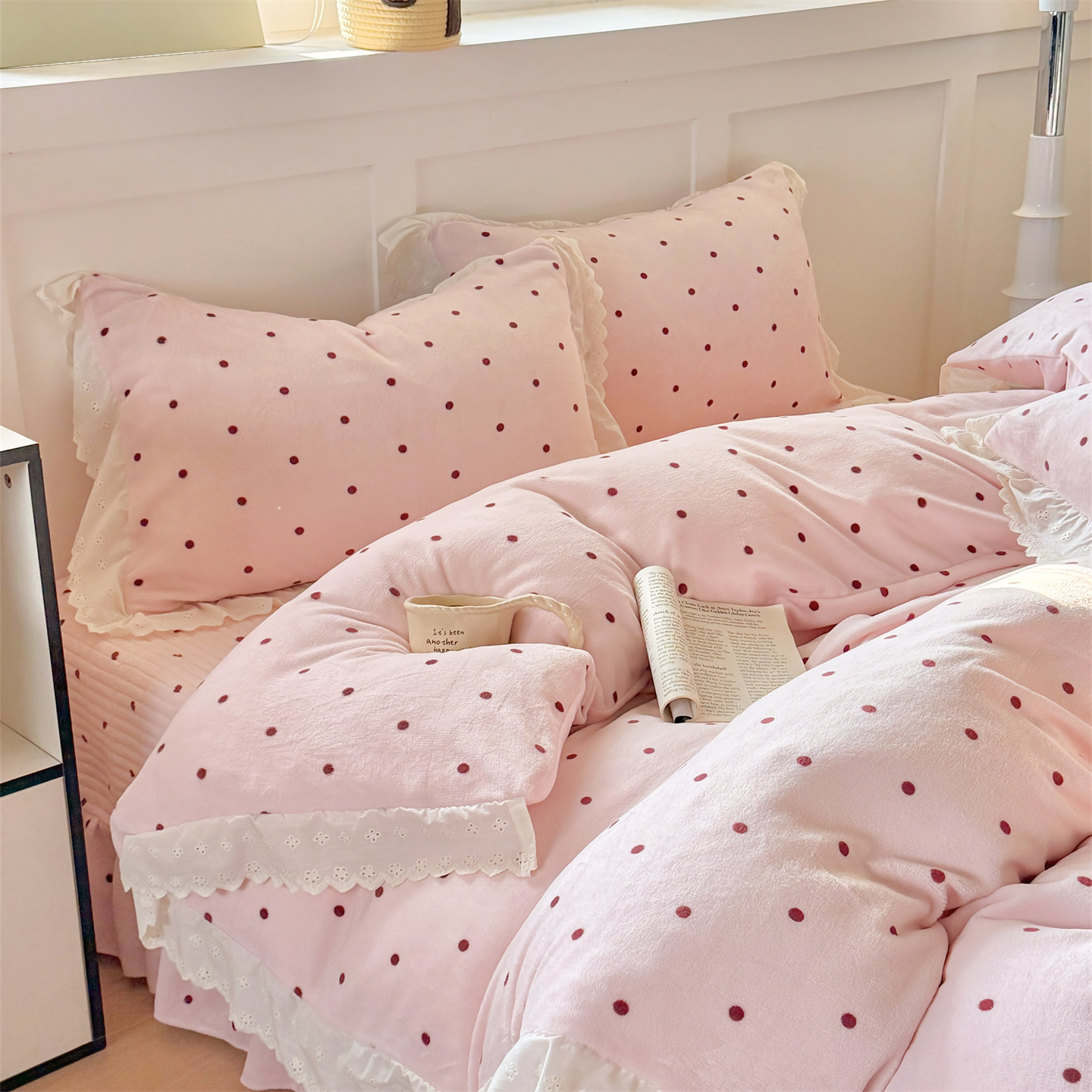 欧尚 2025新款牛奶绒花边床盖四件套 粉点点
