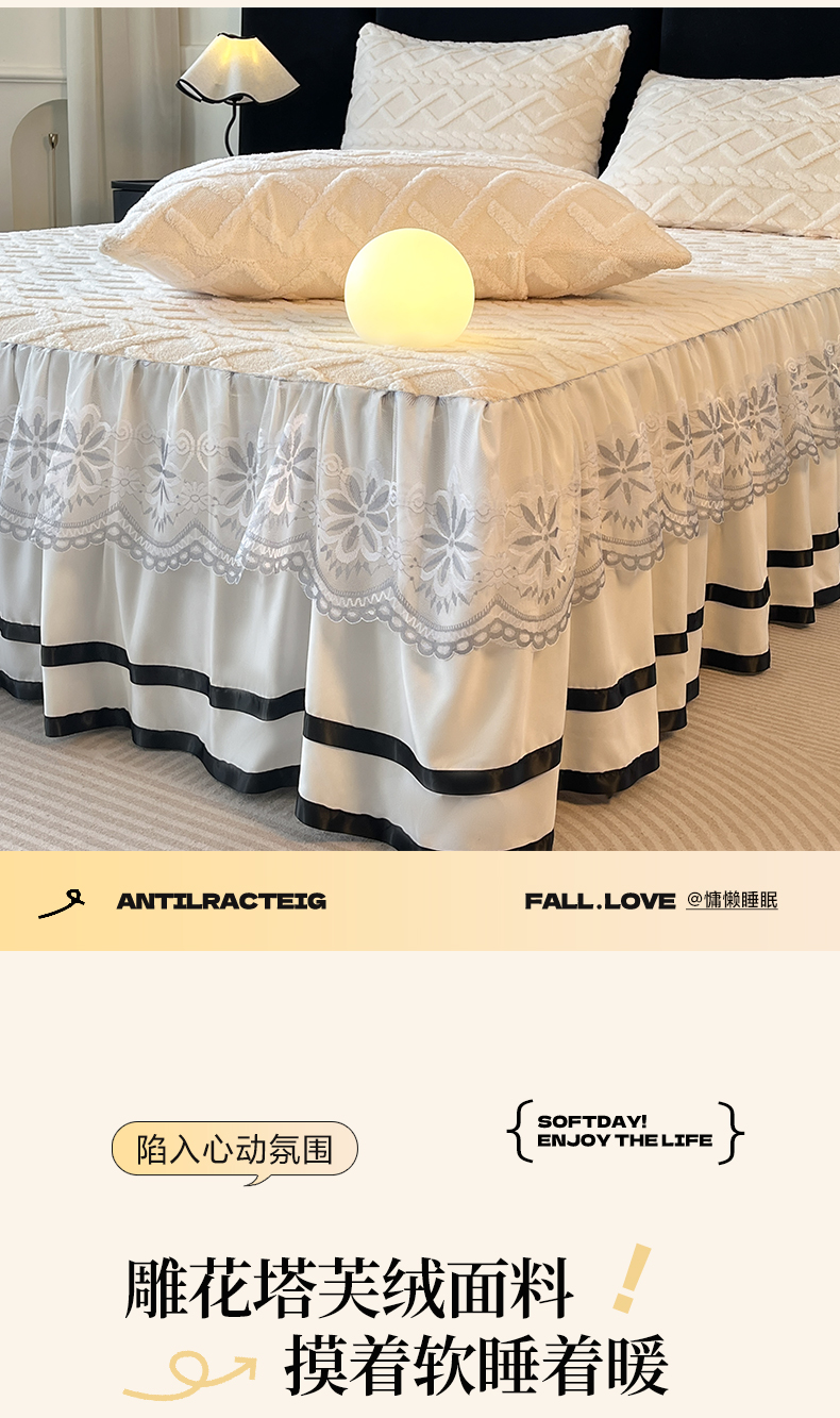 • 91家纺网 家纺一手货源 找家纺 米瑞娜 2025新款塔芙绒床裙三件套雕花绒蕾丝跨境单床裙外贸现货尺寸齐全 马尾型-白色