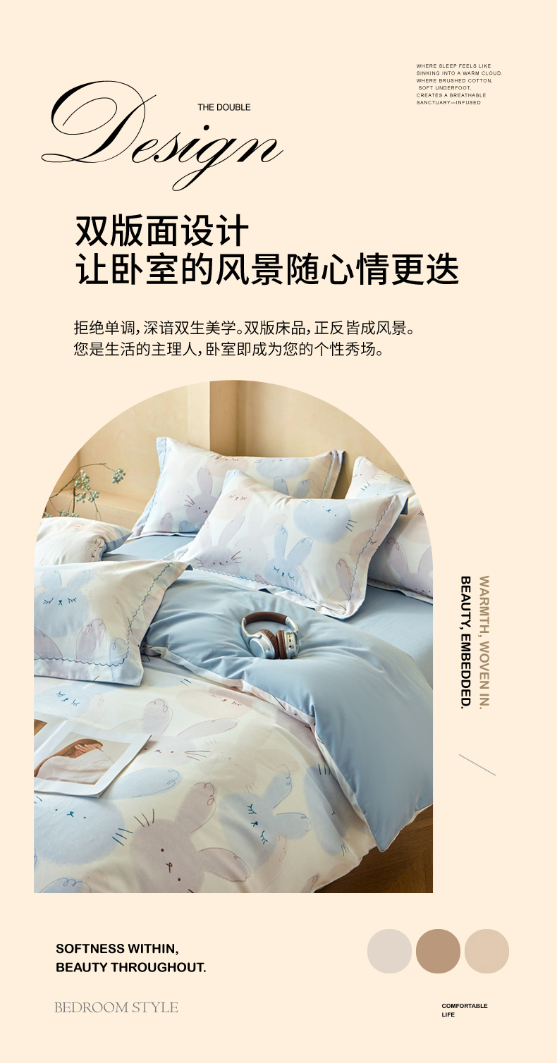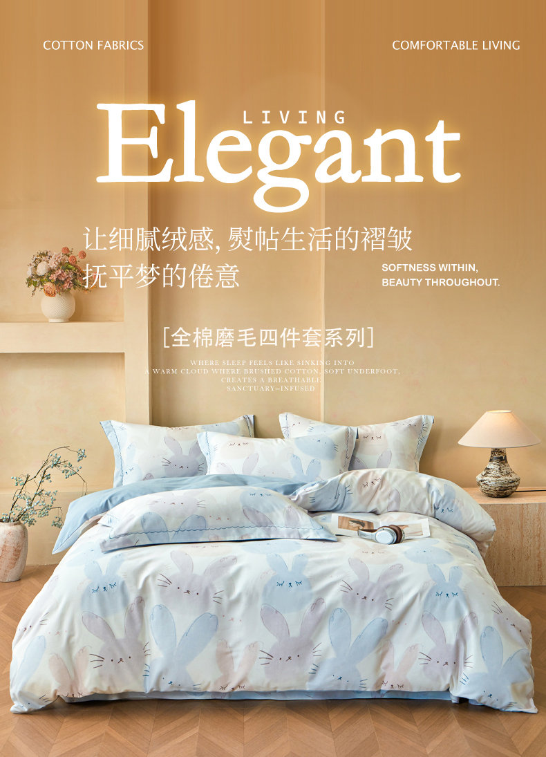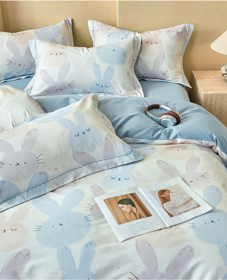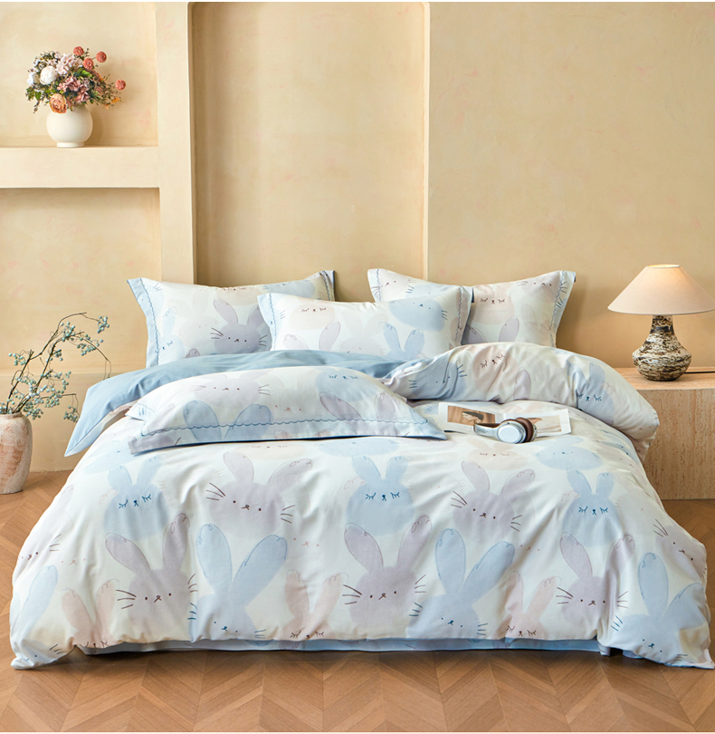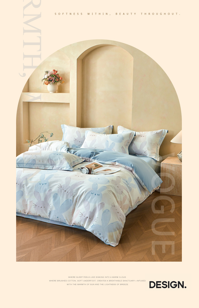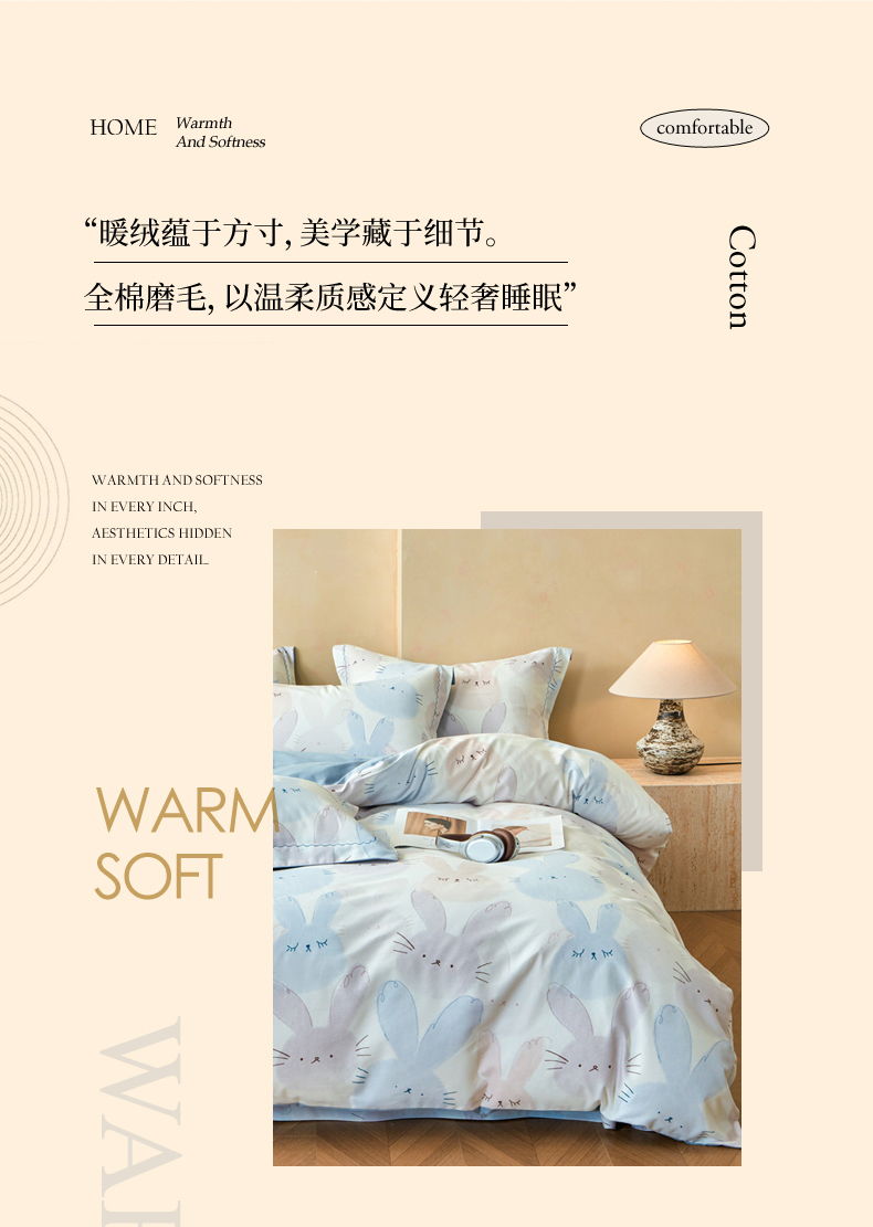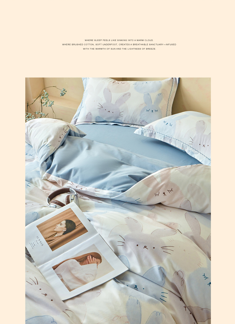 洺兰家居 2025年新款秋冬加厚全棉磨毛四件套纯棉生态磨毛印花套件 萌萌兔-粉