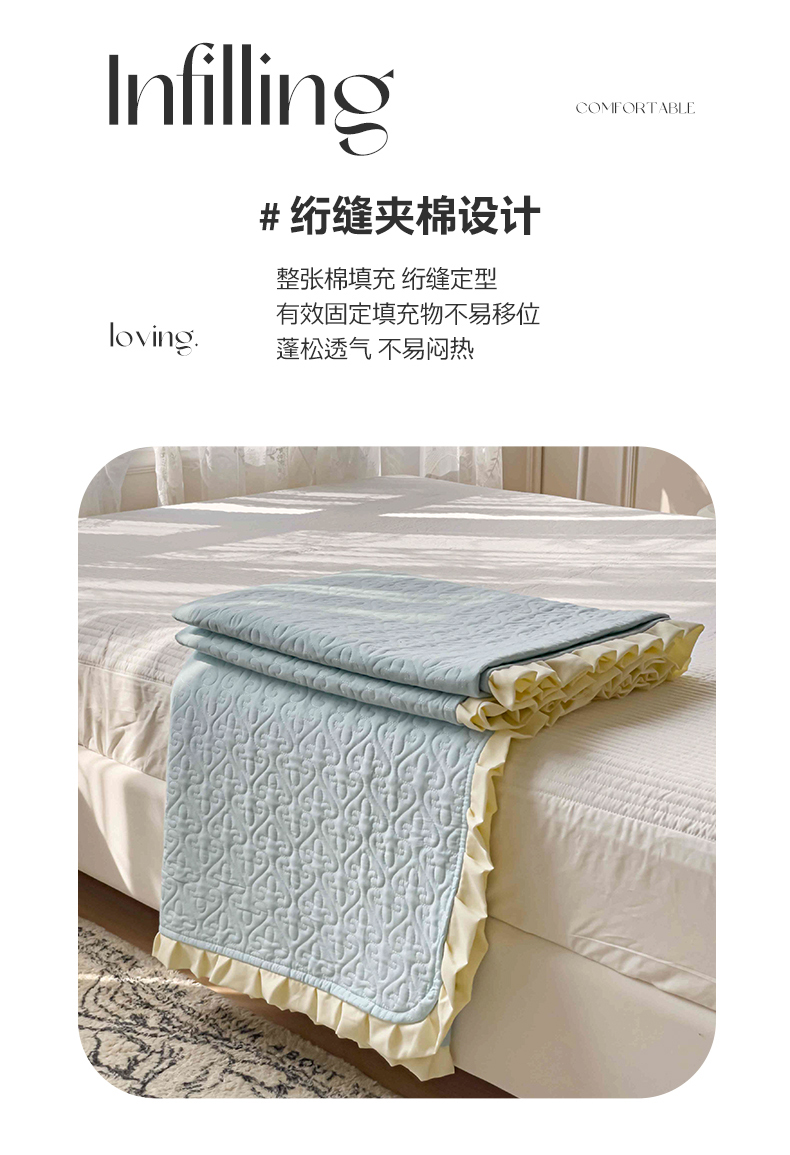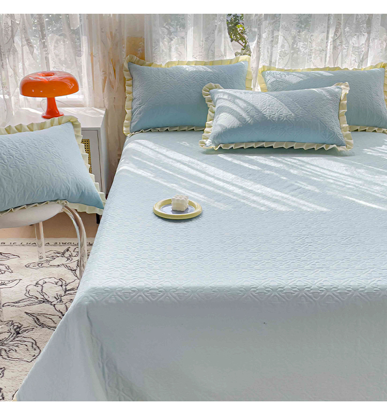 • 91家纺网 家纺一手货源 找家纺 妮可 2025新款全棉纯色花边款40S纯棉夹棉绗缝四季款多功能床盖 浅水蓝