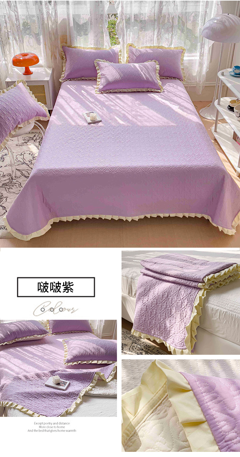 • 91家纺网 家纺一手货源 找家纺 (总)妮可 2025新款荷叶边纯棉绗缝四季款多功能床盖,奶油黄,冰湖蓝,豆豆沙,梦幻粉,气质灰,森林绿,芝兰紫
