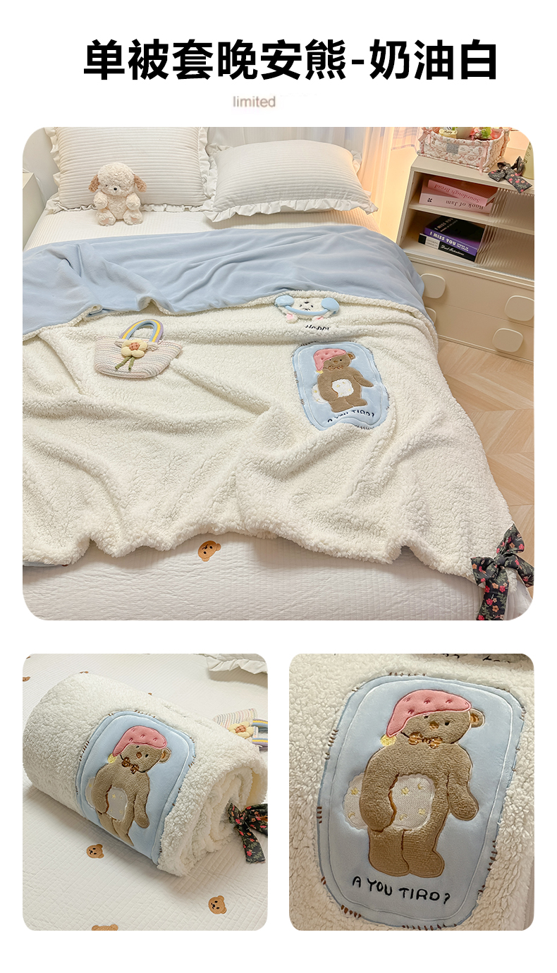 子钦家纺 2025新款羊羔绒牛奶绒卡通贴布绣单被套被套单件单品被套(第二波) 帽子熊-奶油白