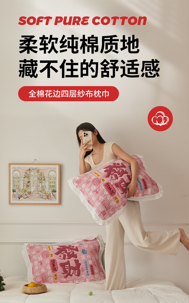 沐瑟家纺 2025新款花边枕巾 发财-粉