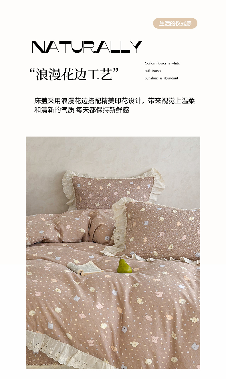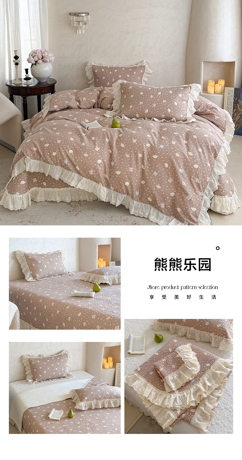 商品名称:琳可家居 2026新款印花全棉双层纱床盖棉布花边高温水洗A类标准夹棉可机洗 熊熊乐园